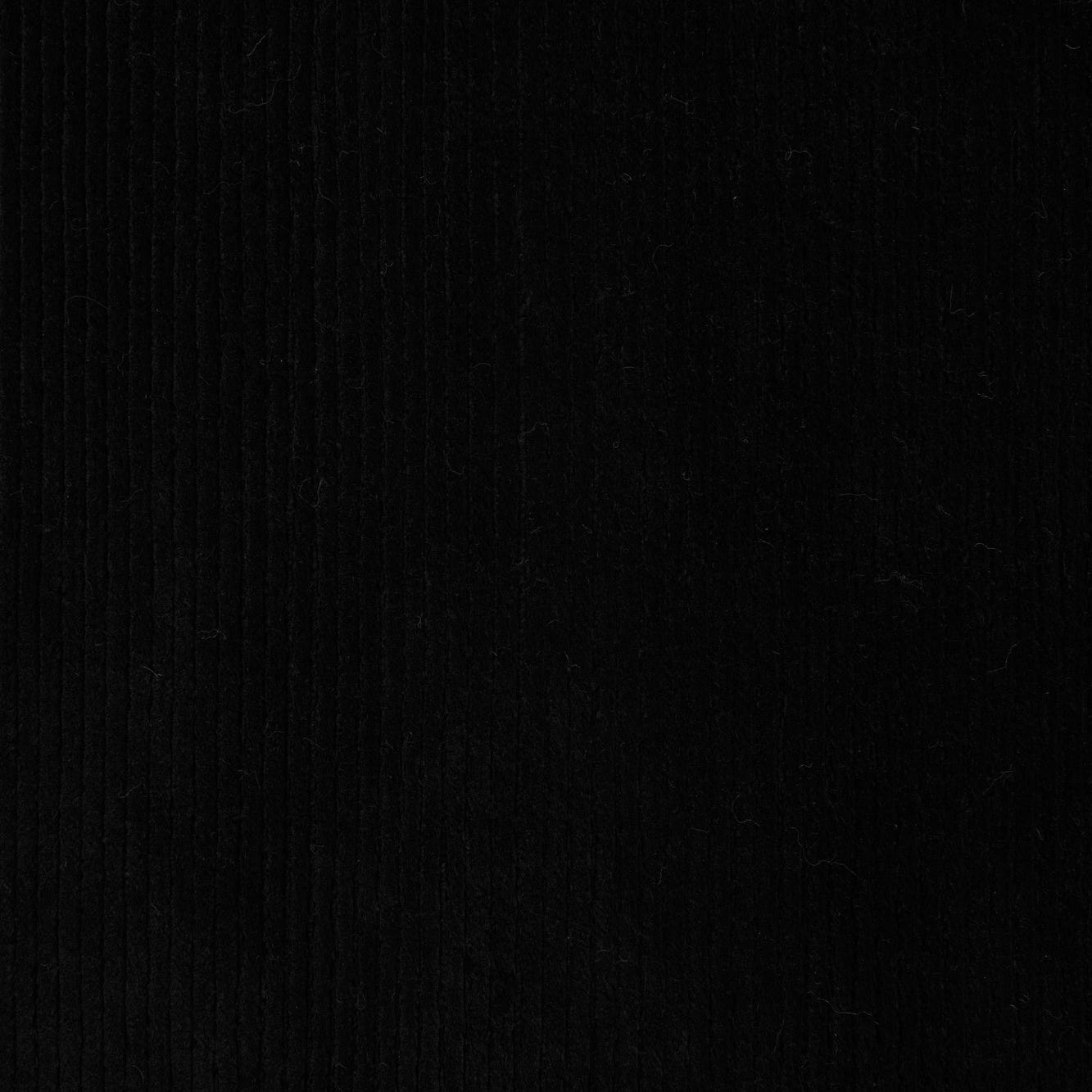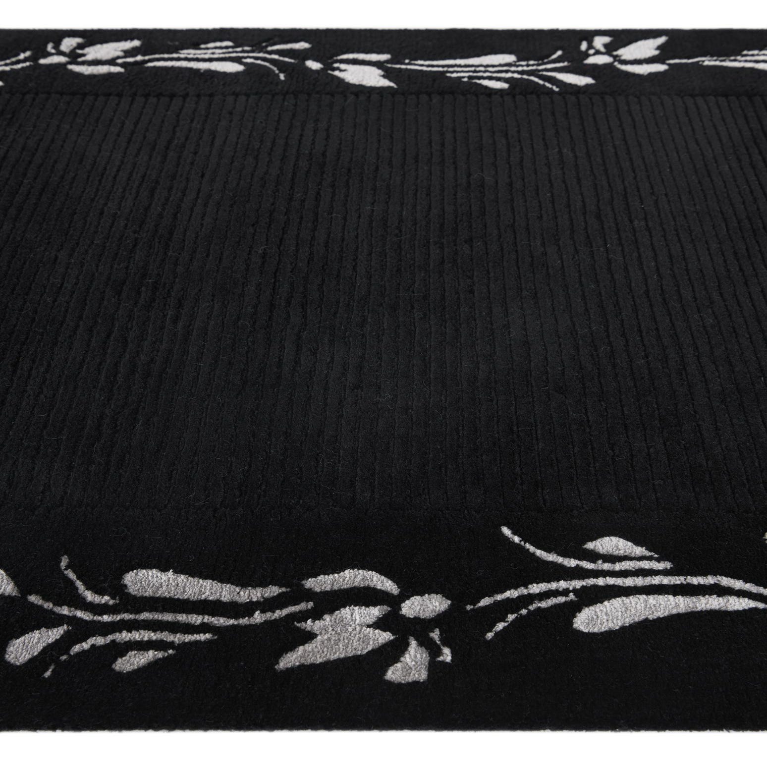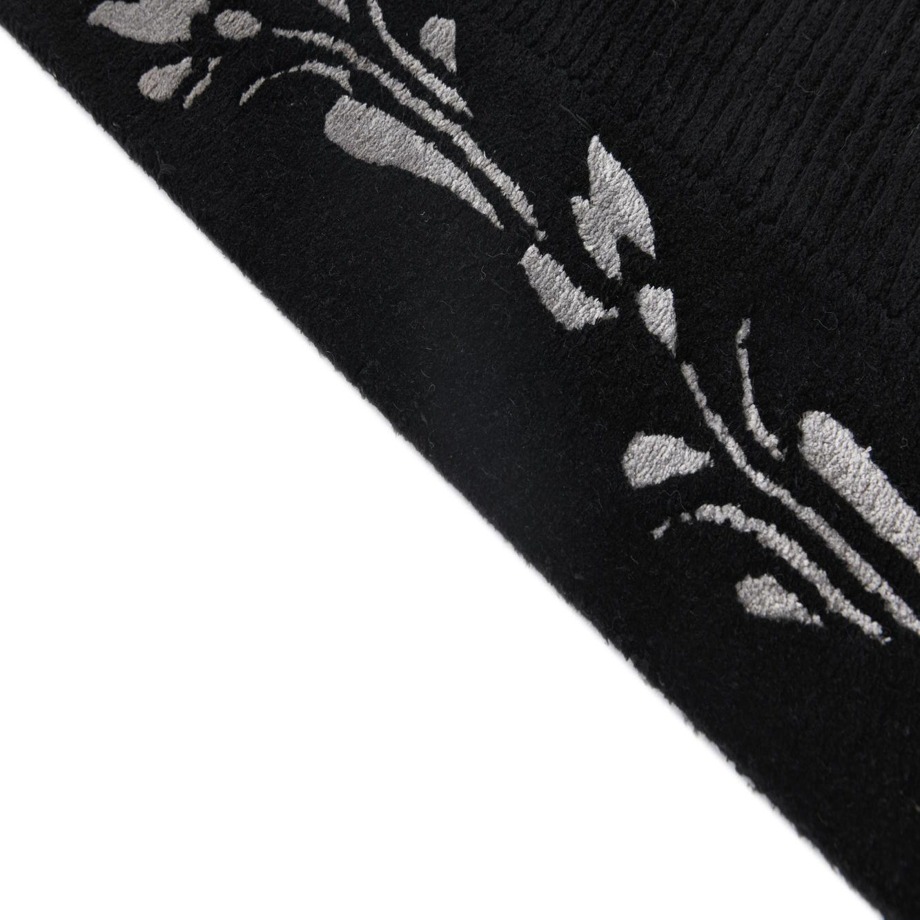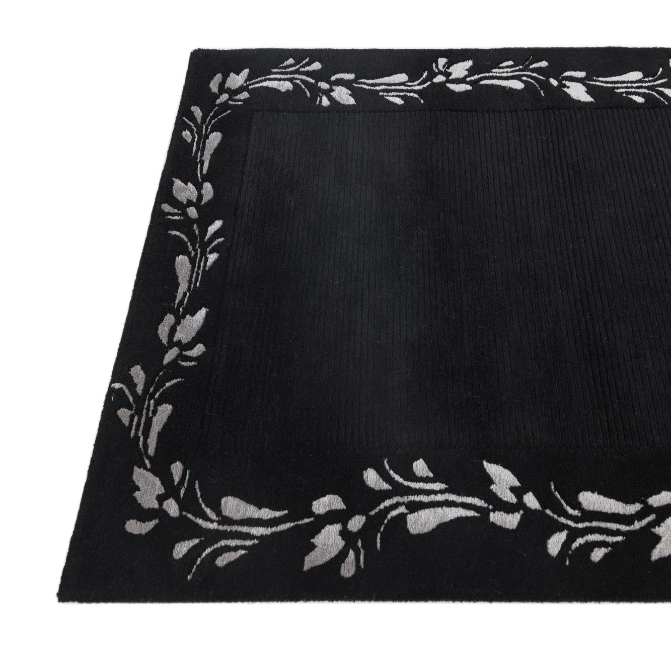 Hand-knotted from 100% wool, this rug grounds a room with a deep black field framed by a graceful silver-gray botanical border. A vine-and-leaf motif traces the perimeter in cool gray and silver tones, creating a crisp, graphic contrast against the black background. The center field features a narrow, linear texture that adds quiet depth, while the dense wool pile feels soft and slightly springy underfoot, giving the piece a tactile, refined presence.