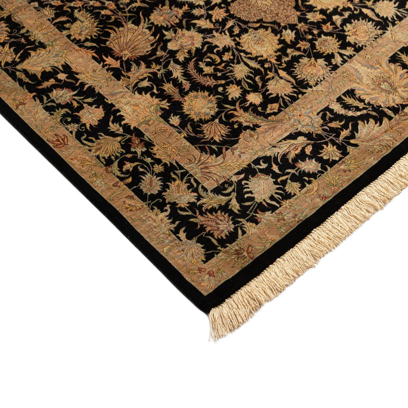 A luxurious 3x5 rectangular black Persian silk rug with an intricate gold floral medallion and border.