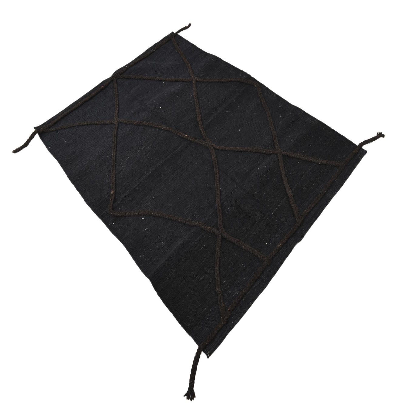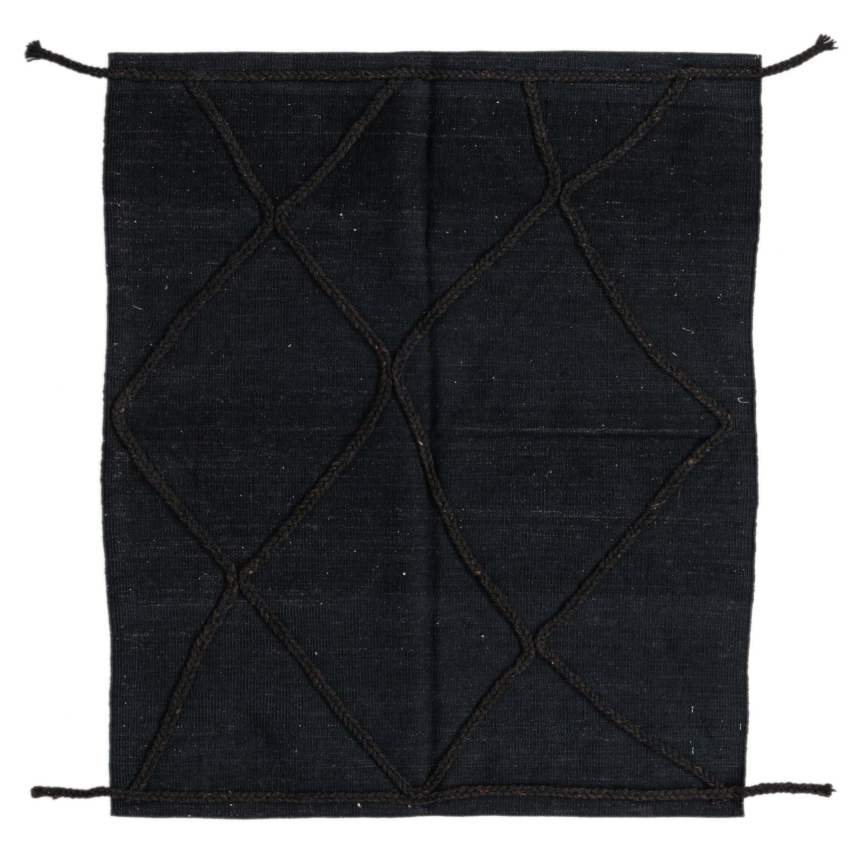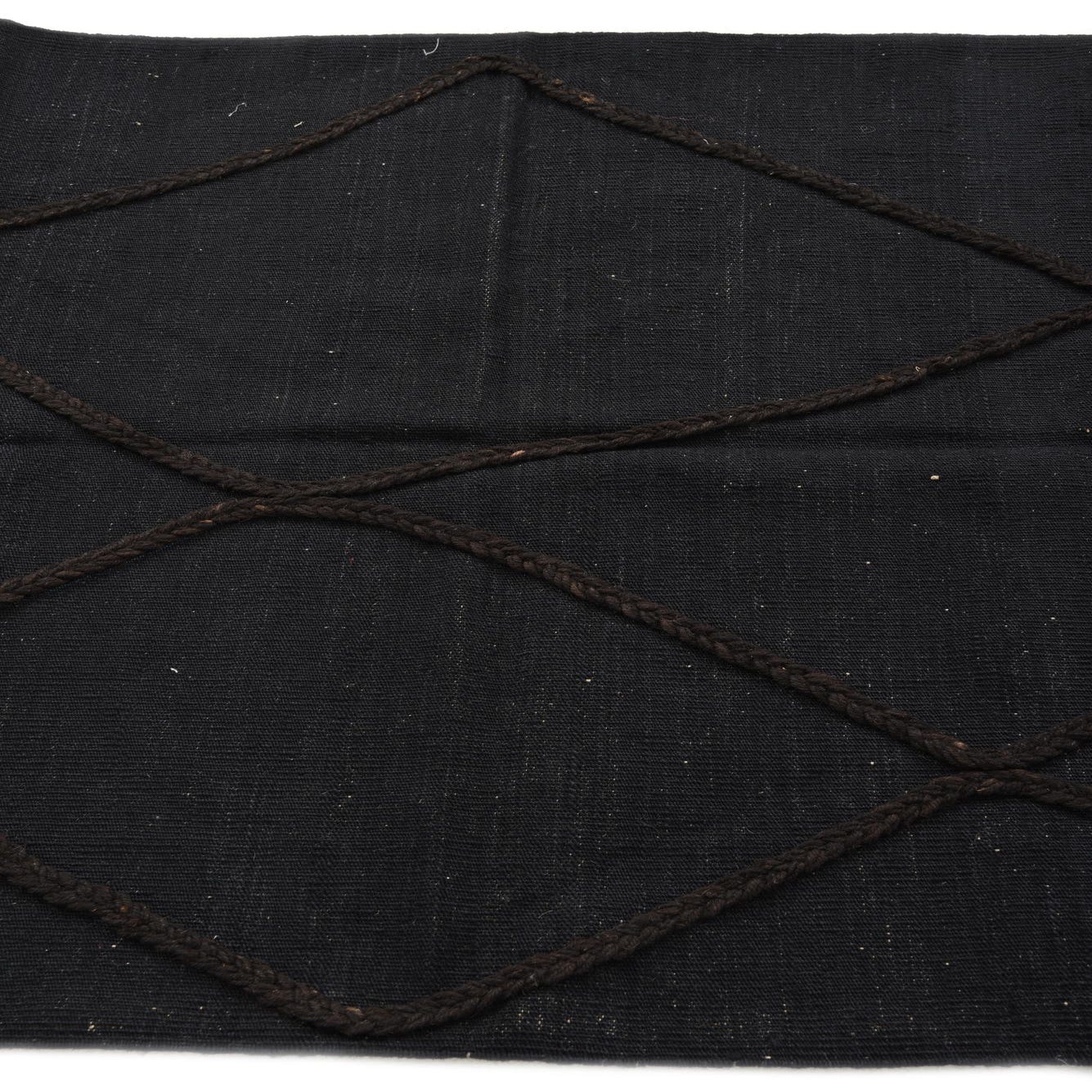 A 3x5 rectangular black flatweave wool rug with a subtle tribal diamond pattern created by textured braided lines.