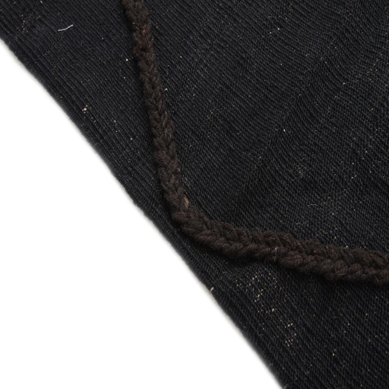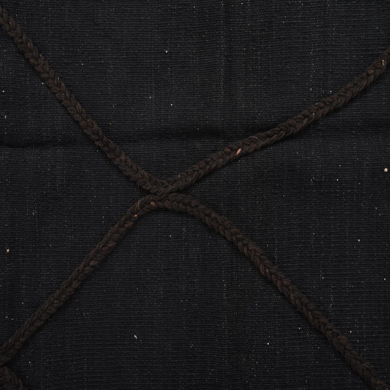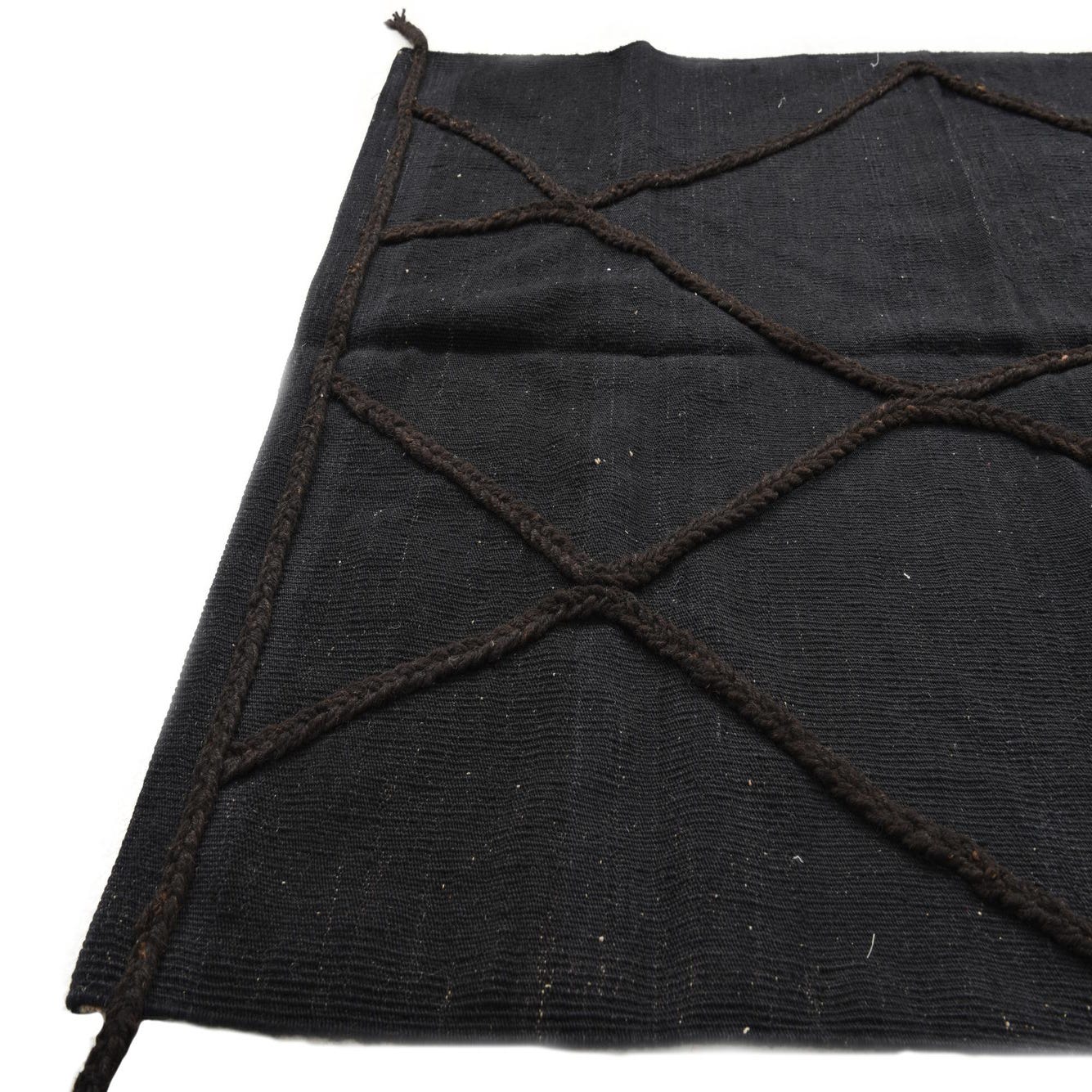 A 3x5 rectangular black flatweave wool rug with a subtle tribal diamond pattern created by textured braided lines.