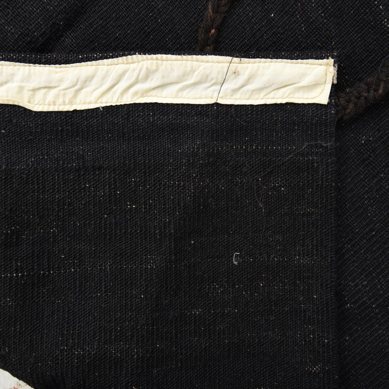 This Kilim Modern collection rug presents a bold and graphic pattern, beautifully handwoven in a 3x5 size to suit smaller spaces. The textured design features a striking geometric motif in a raised weave that adds a touch of dimension against the black background. The rug's tactile surface is created with 100% wool, offering a natural and durable composition.