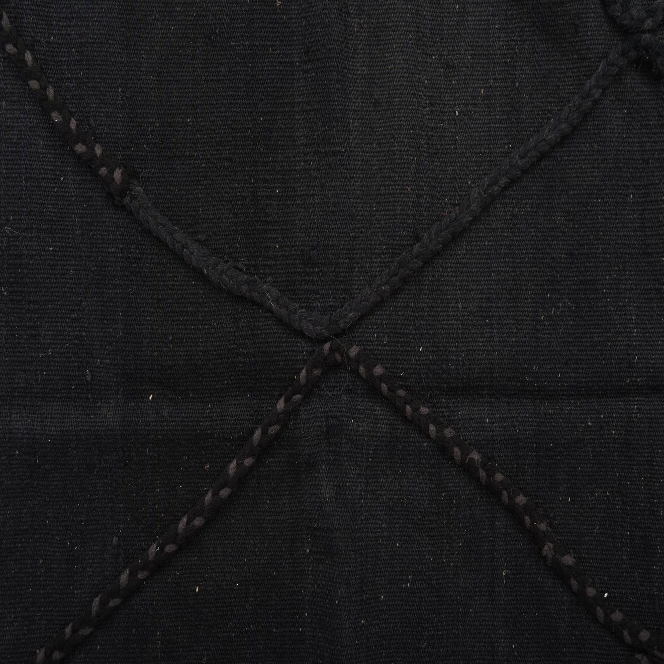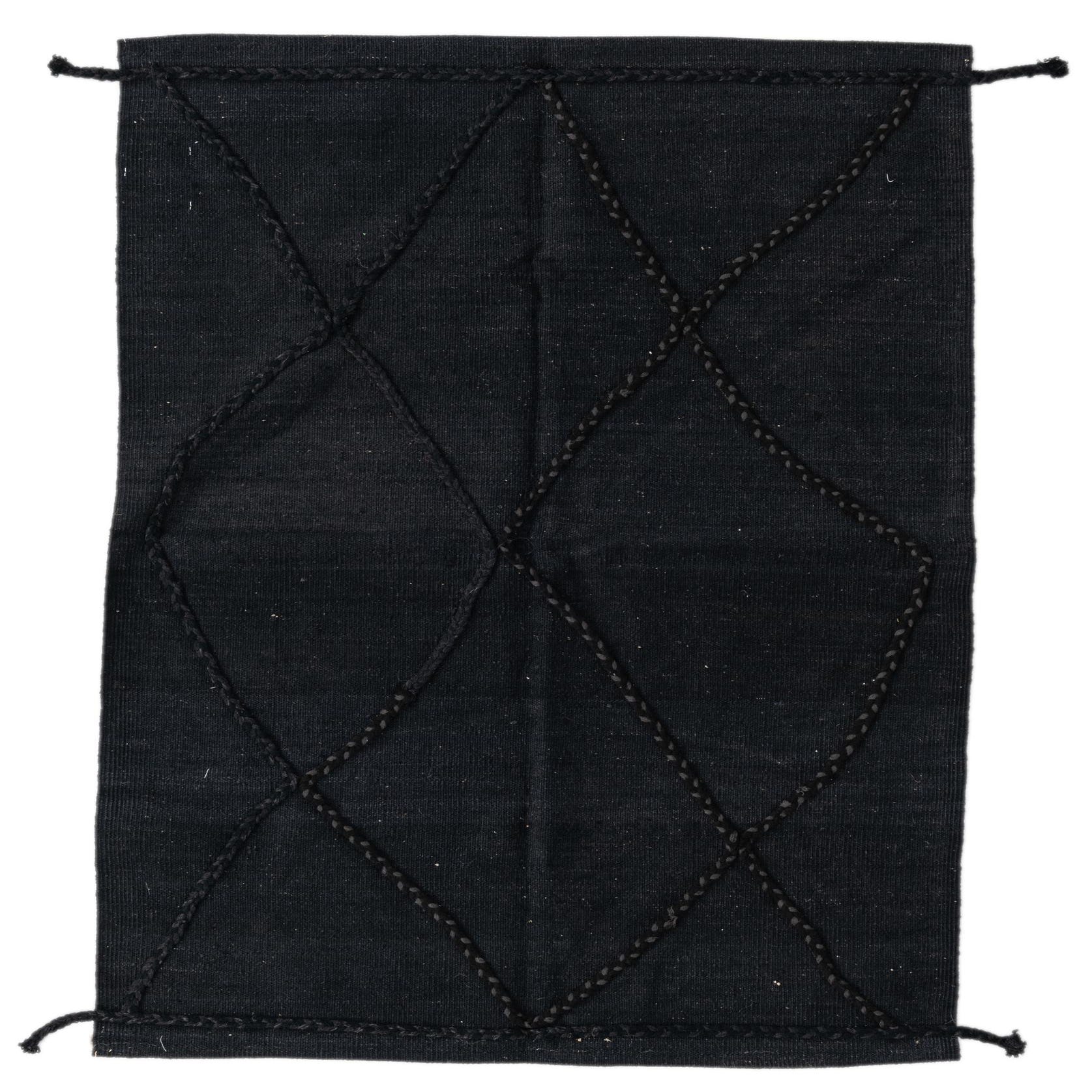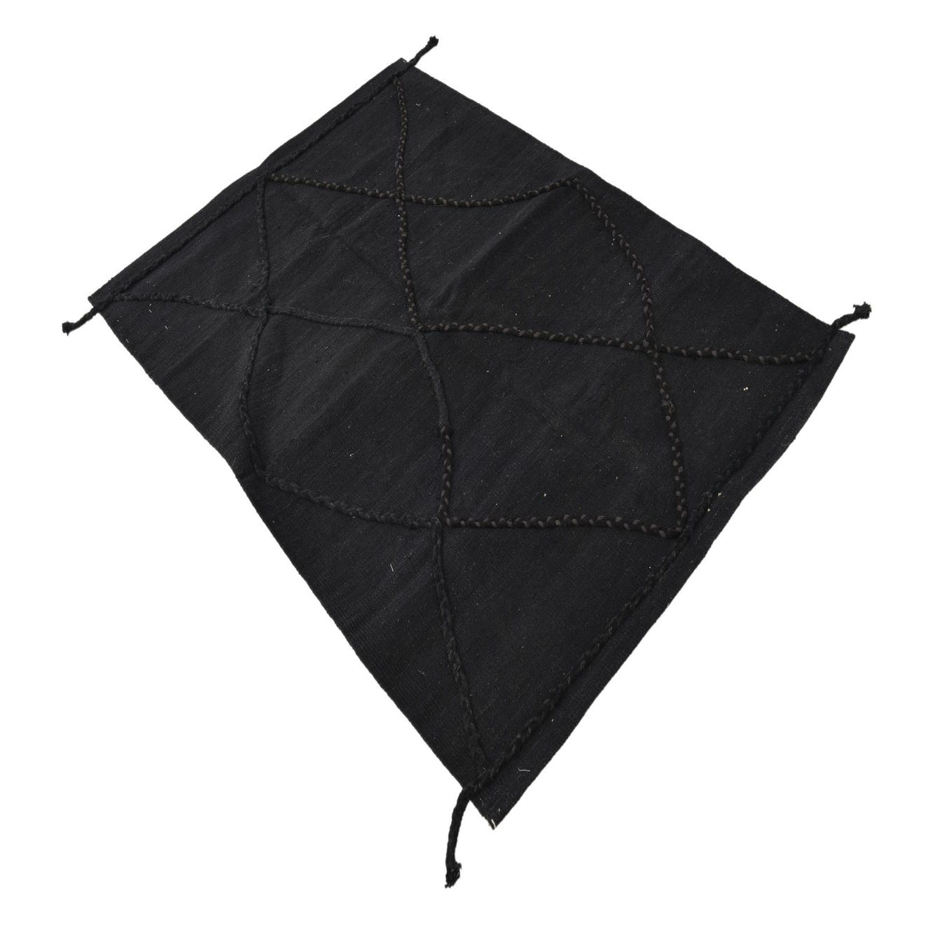 The Kilim Modern collection presents a hand-woven rug of 100% wool, offering a 3x5 dimension that oozes contemporary appeal with its understated elegance. The rug is dominated by a strong black background with a geometric pattern that provides a subtle yet impactful visual interest. The contrasting stitching weaves through the rug, creating a diamond-shaped motif that brings a sense of depth and texture to the piece.