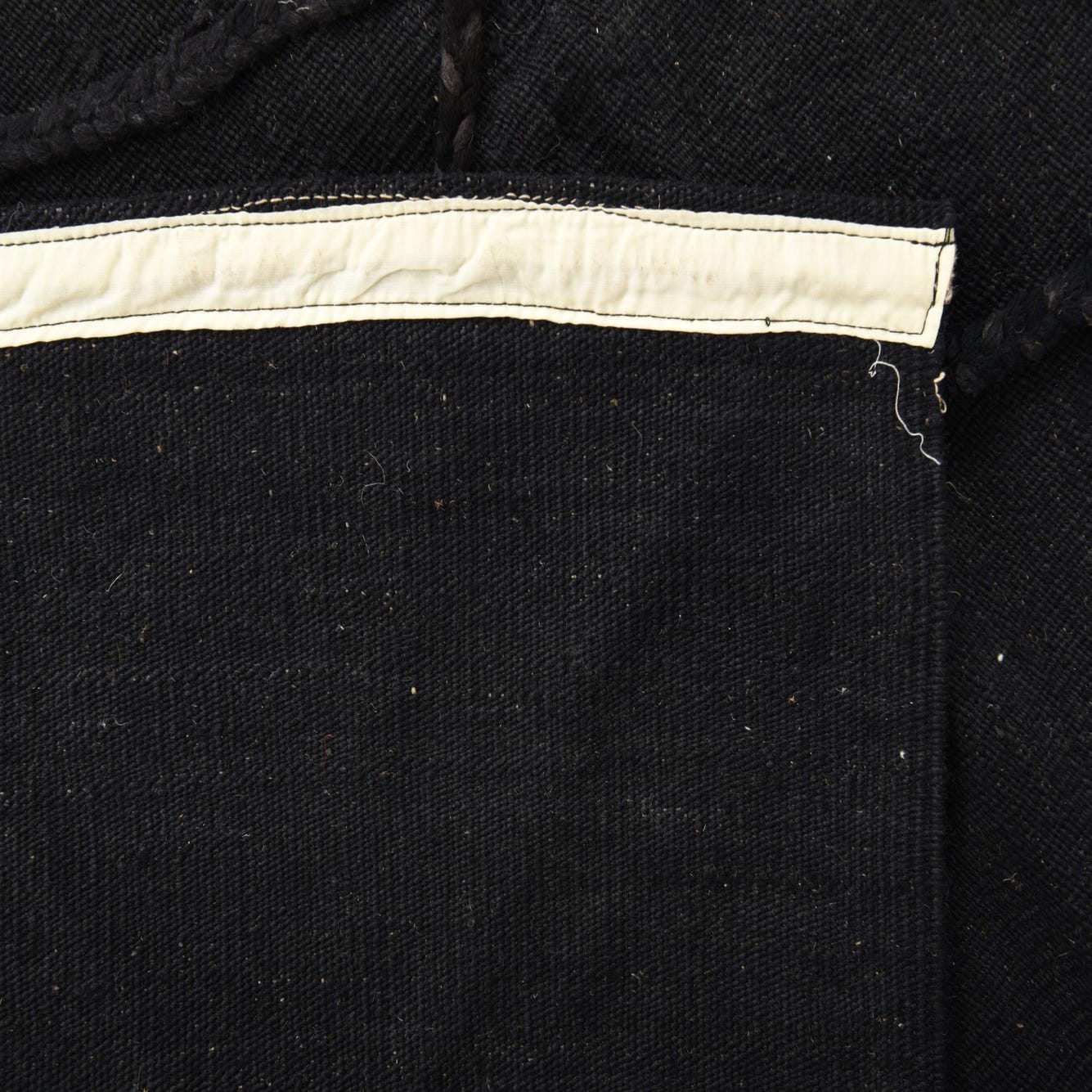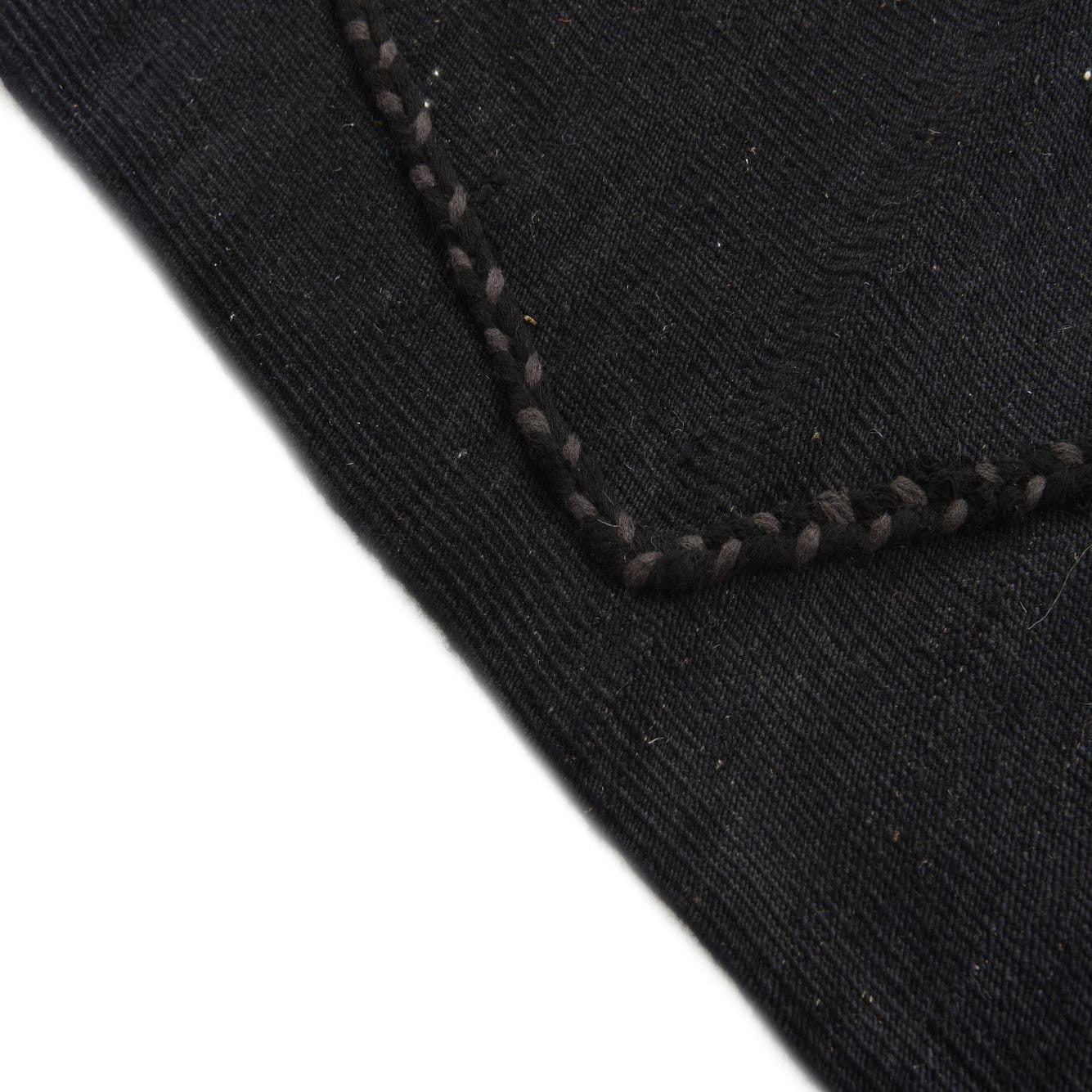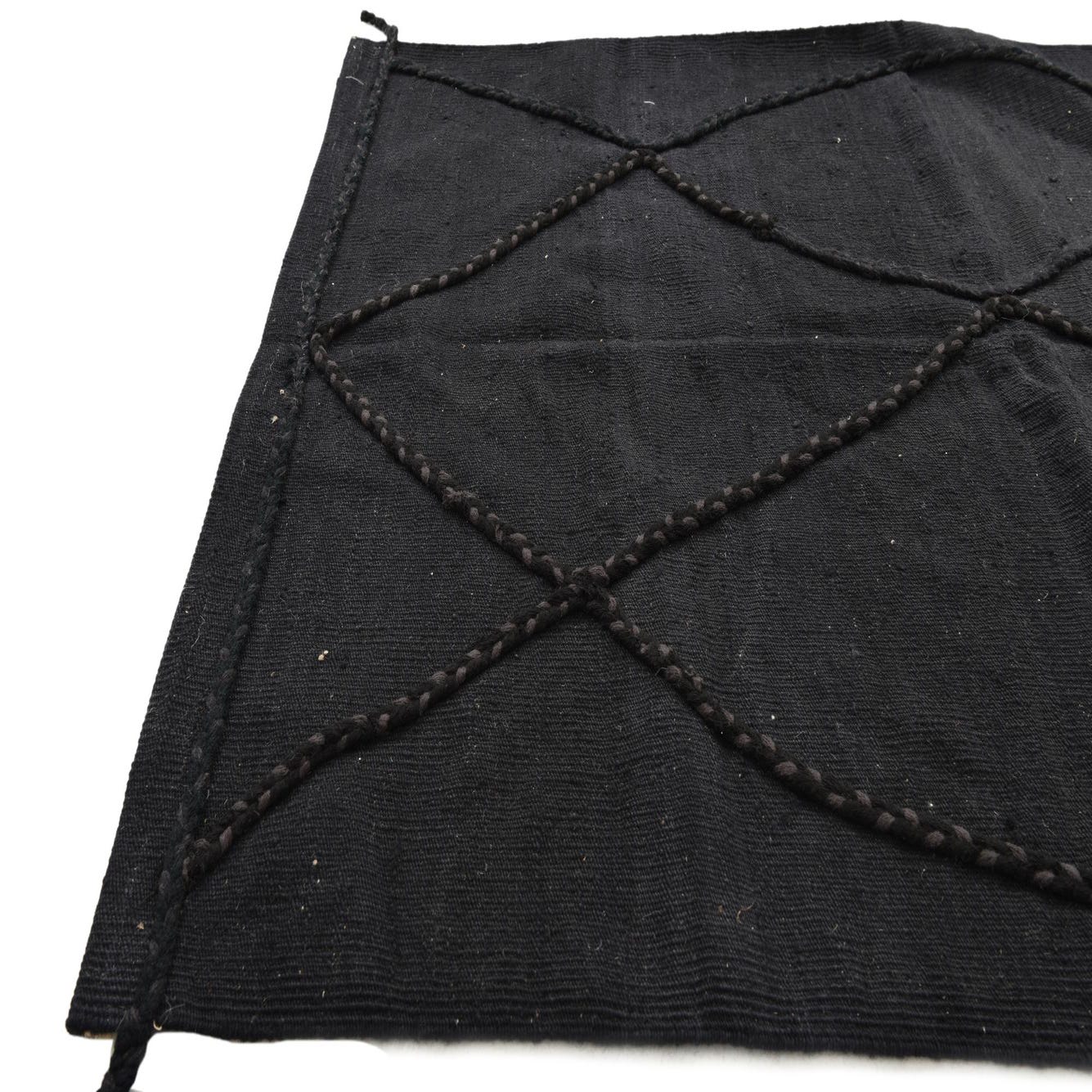 The Kilim Modern collection presents a hand-woven rug of 100% wool, offering a 3x5 dimension that oozes contemporary appeal with its understated elegance. The rug is dominated by a strong black background with a geometric pattern that provides a subtle yet impactful visual interest. The contrasting stitching weaves through the rug, creating a diamond-shaped motif that brings a sense of depth and texture to the piece.