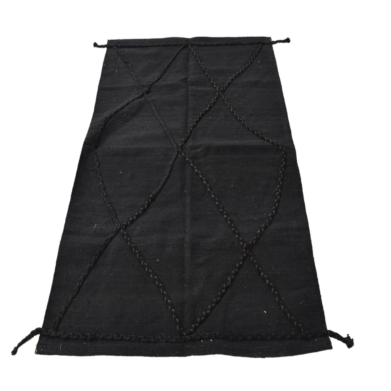 A 3x5 rectangular black flatweave rug with a tribal diamond pattern made from braided wool, suitable for an entryway.
