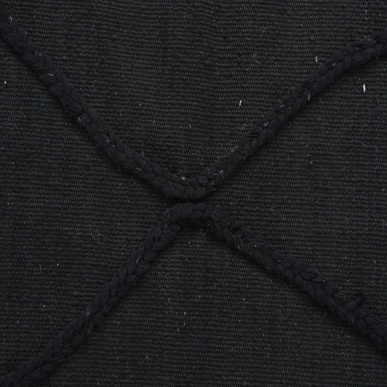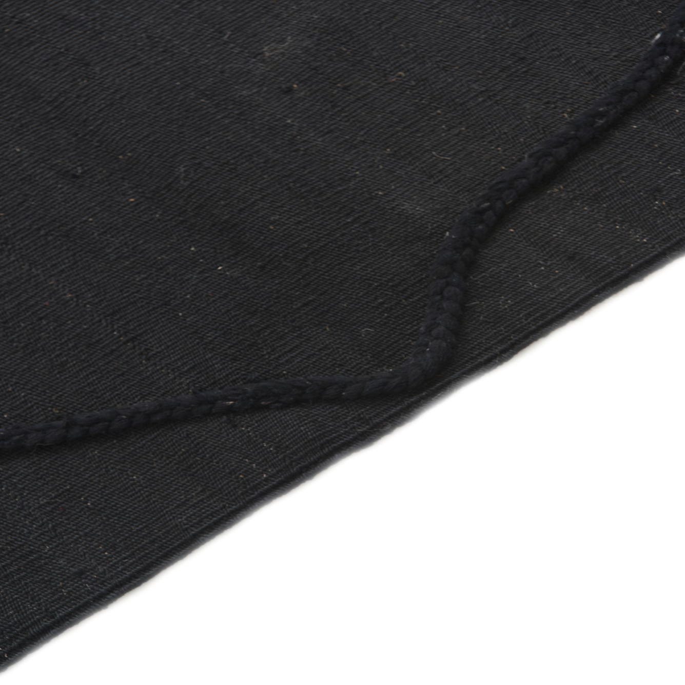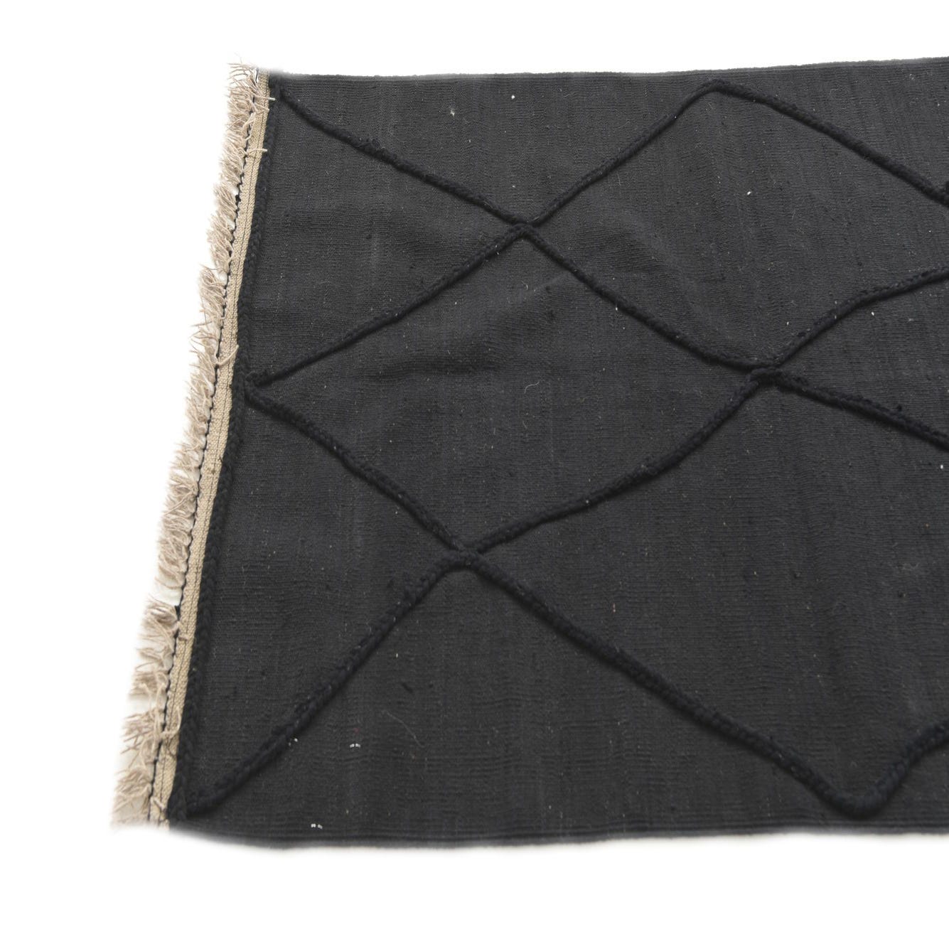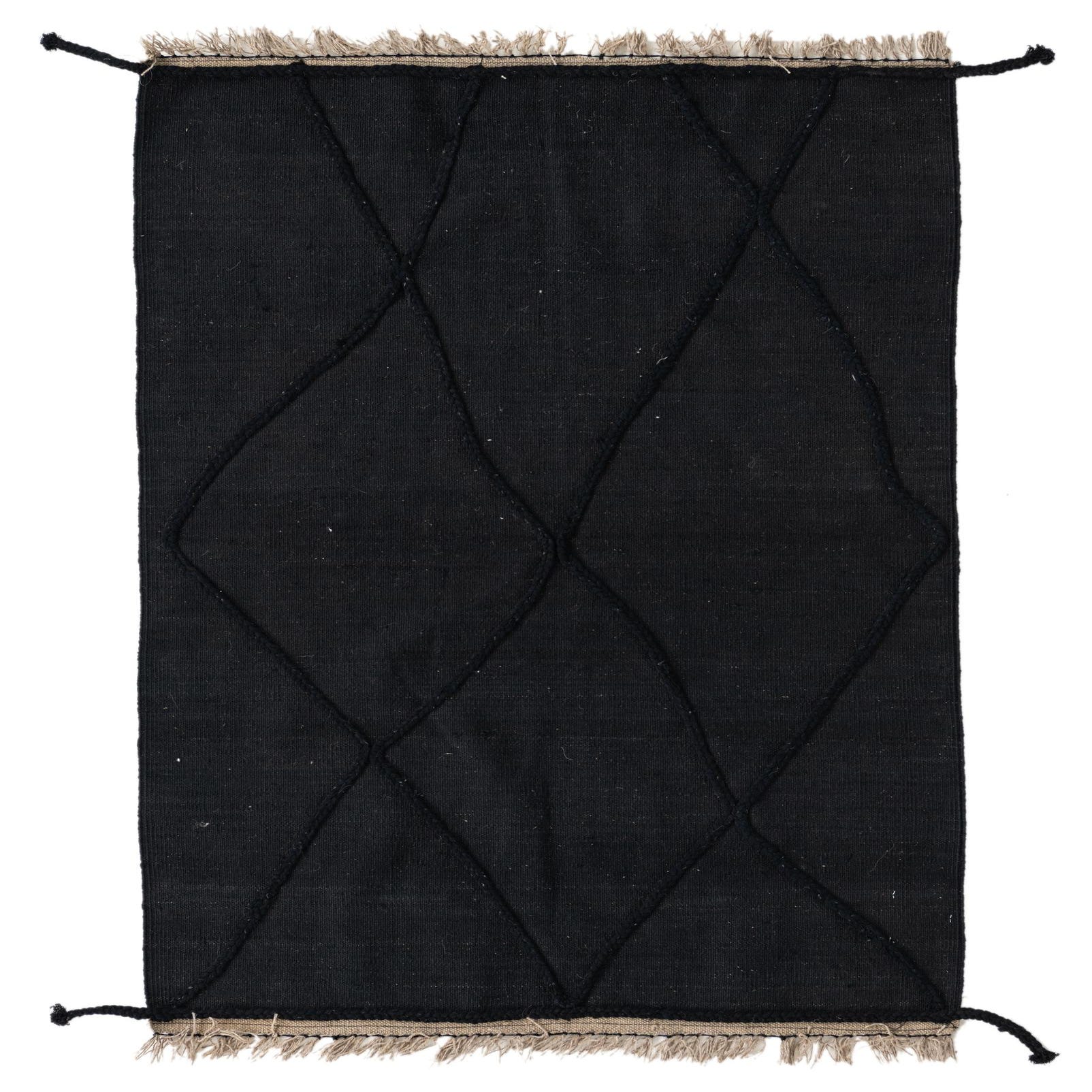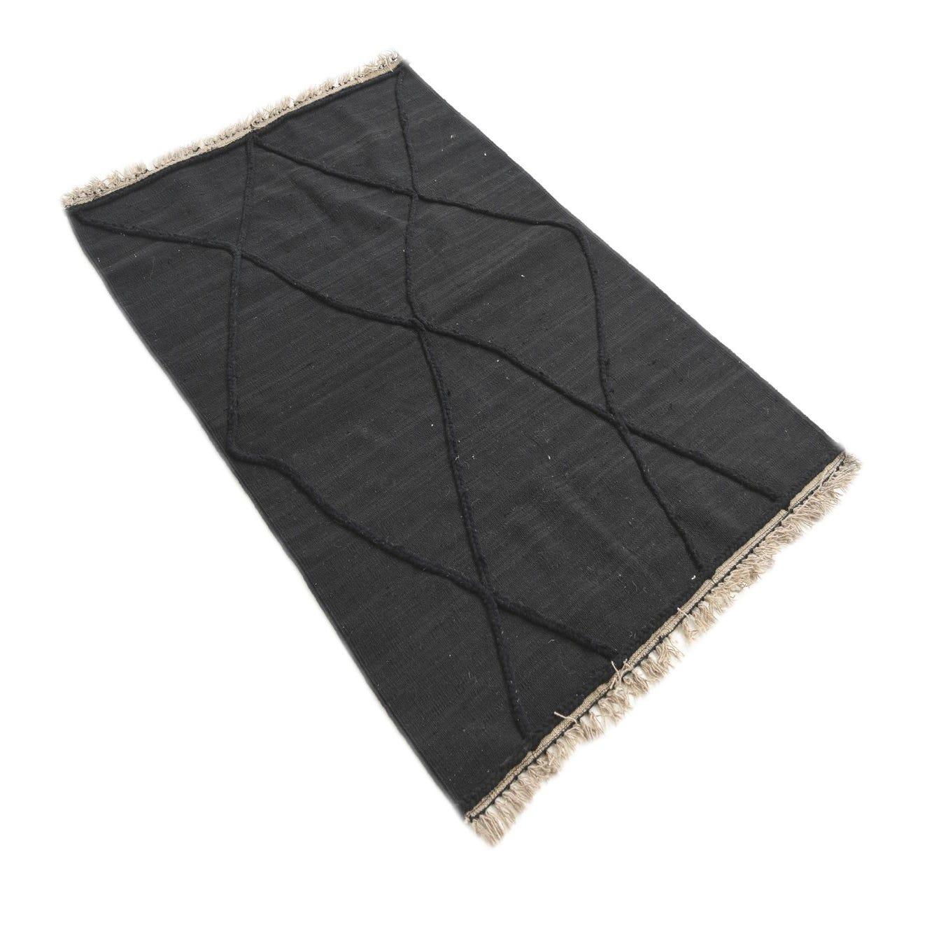 A 3x5 rectangular black flatweave wool rug with a subtle tribal diamond pattern and fringed edges.