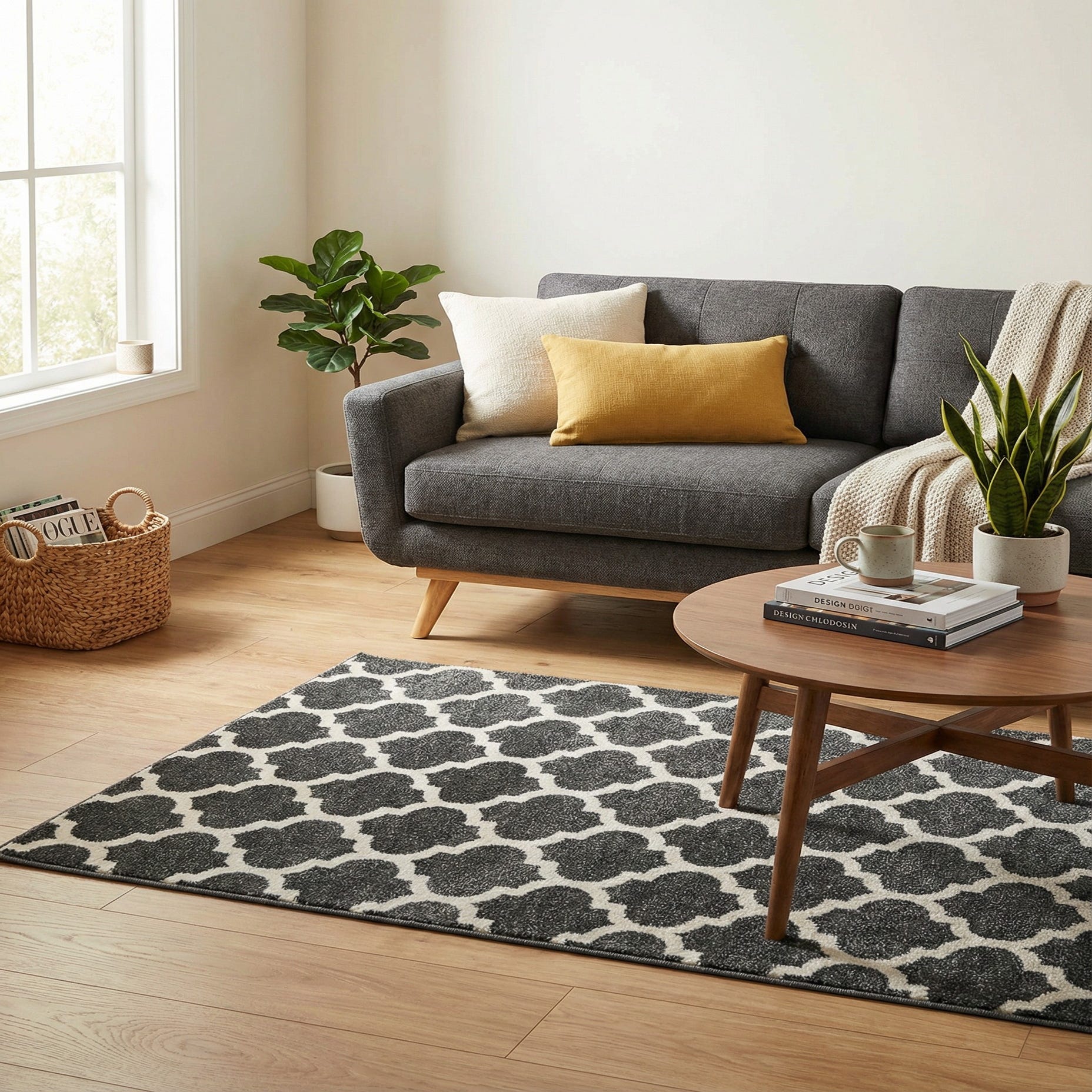 This design works well in compact spaces that need visual structure — think entryways, a small living area, or beneath a desk in a home office. It pairs nicely with light or natural wood tones, black metal accents, and neutral upholstery, and can serve as a grounding layer in minimalist, modern, or transitional interiors.