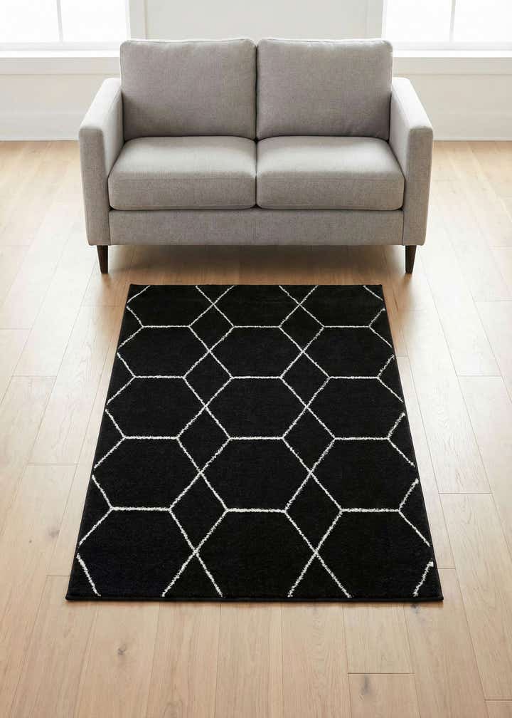 A bold black ground anchors a crisp ivory lattice of interlocking hexagons, forming a modern, geometric honeycomb pattern. The ivory lines have a slightly irregular, brushed edge that adds visual texture and a handcrafted appearance against the deep black background. The high-contrast palette gives the rug a clean, architectural feel that complements contemporary and transitional interiors.