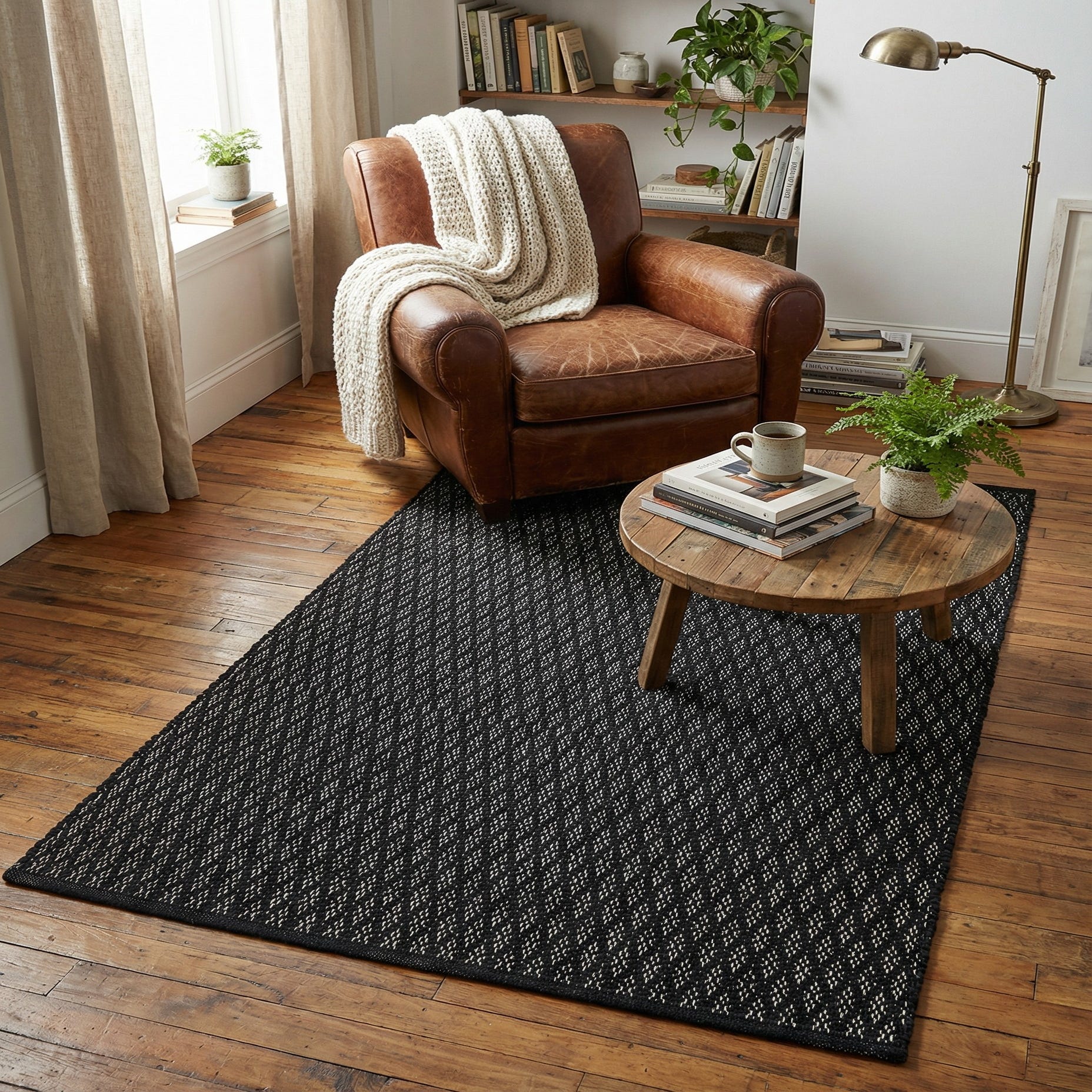 A compact lattice of ivory dashes crosses a deep black background to create a refined, small-scale geometric pattern that balances structure with a casual hand-woven look. Woven from 80% wool and 20% cotton, the rug has a low-profile, tightly woven surface with a slight nubby texture—soft underfoot thanks to the wool yet stable from the cotton foundation. The black field provides a strong, grounding backdrop while the ivory stitching gives a crisp, linear contrast that reads tailored without being ornate.