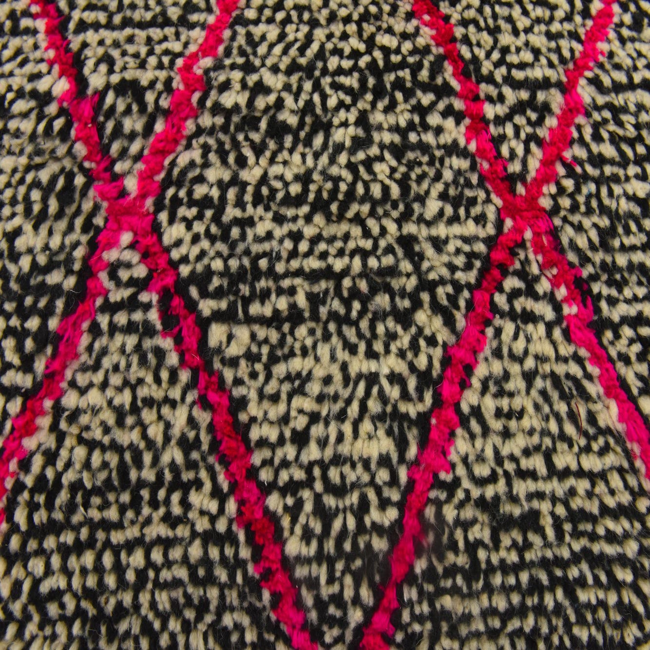 This Moroccan collection rug is a captivating hand-knotted piece constructed of 100% wool, offering a tactile experience underfoot that speaks to traditional craftsmanship. The pattern features a bold black backdrop with a striking geometric trellis design in a contrasting ivory hue, accented with vibrant pink lines that add a touch of color pop to the overall composition. The diamond motif creates a sense of rhythm and Moroccan flair, while the fringe detailing on the ends contributes to its authentic look.