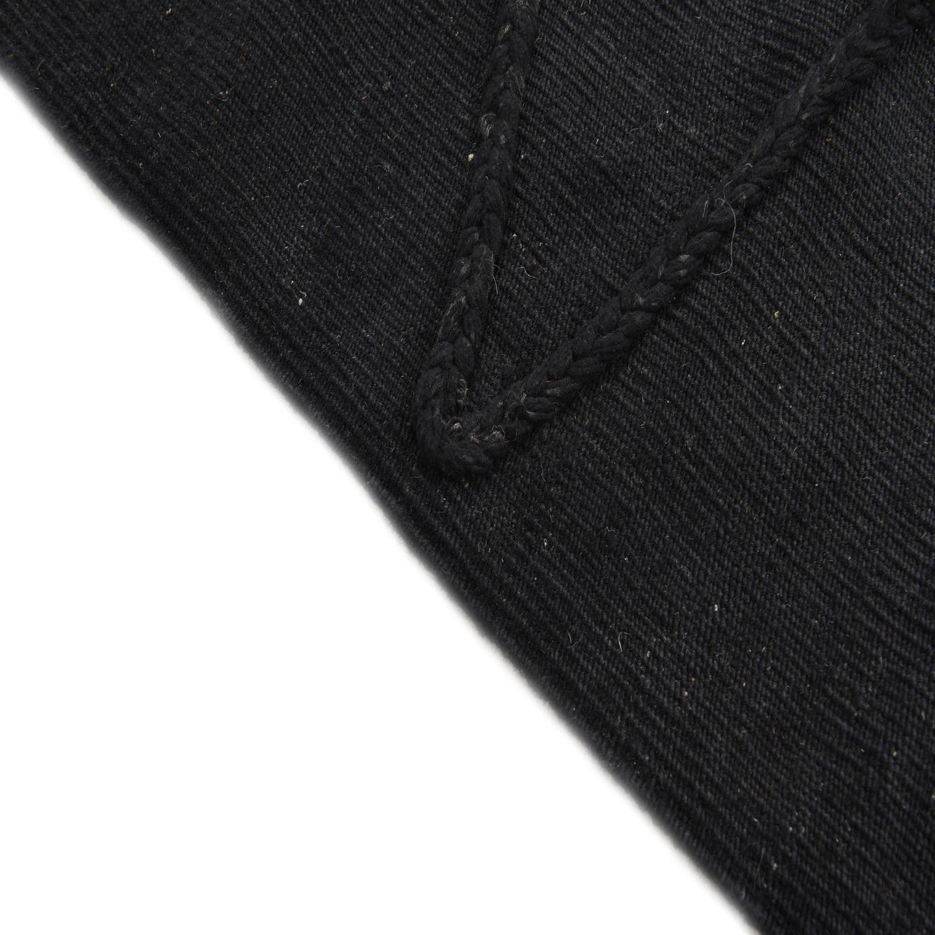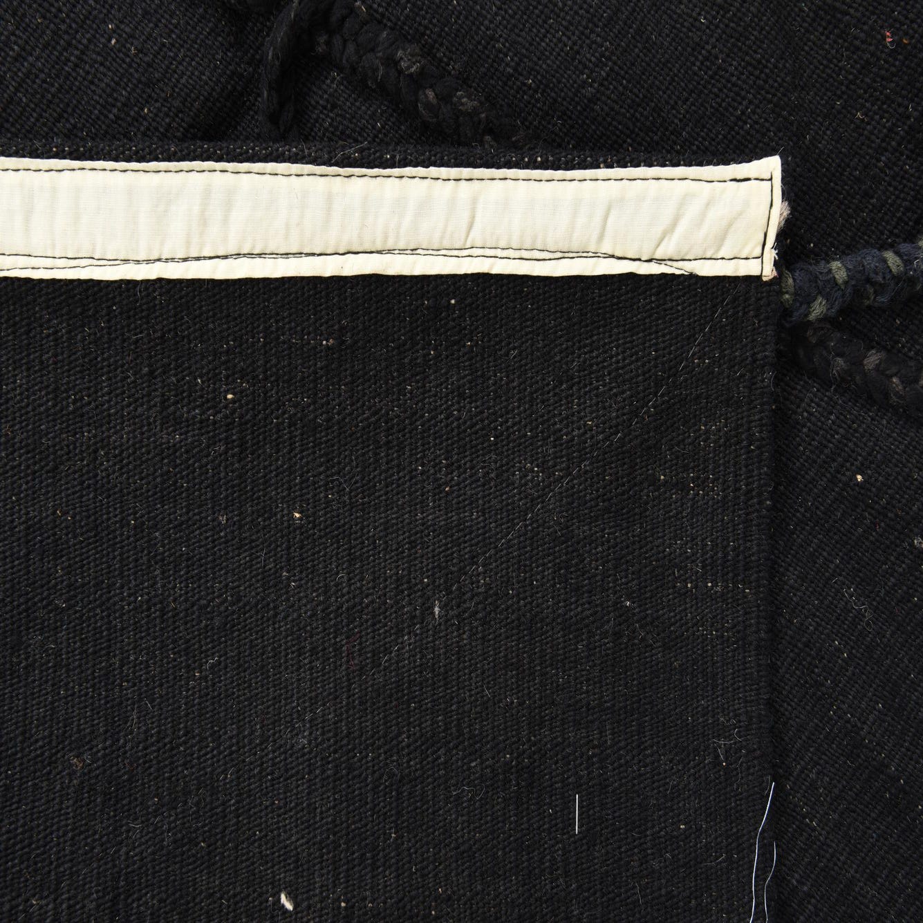 The dense wool construction lends a plush feel underfoot, which, when paired with the predominantly black color scheme and geometric patterning, provides a contemporary aesthetic that would complement modern interior design choices. The darker tones of this rug make it well-suited for spaces that aim to create an atmosphere of elegance and sophistication while the texture adds a tactile dimension to the room.