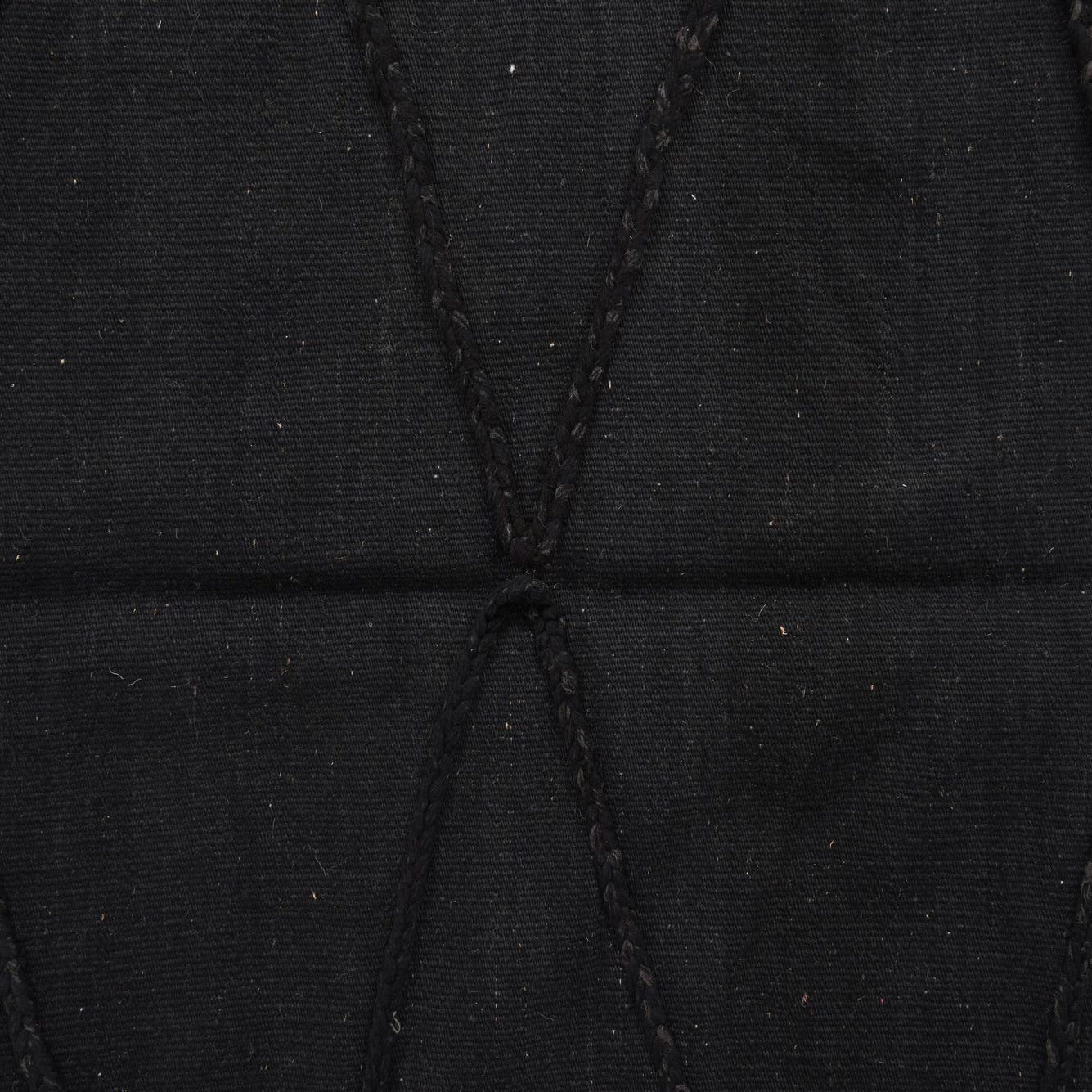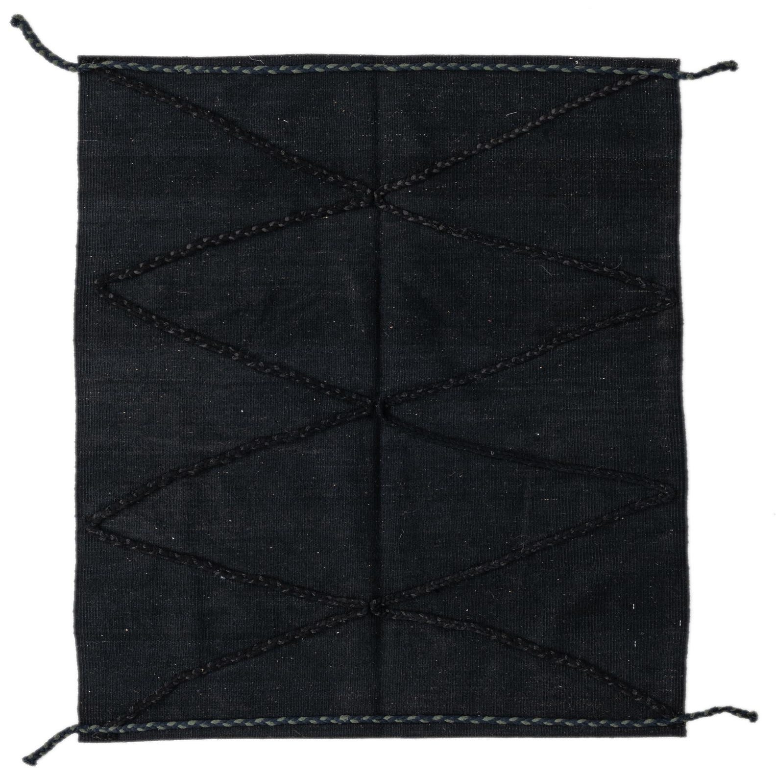 This Moroccan Collection rug is a hand-knotted piece crafted from 100% wool, displaying a richly textured surface. It features a bold black background complemented by understated olive accents. The rug's pattern is a geometric interplay of diamond shapes, outlined with a subtle olive stitching that adds a touch of visual interest without overpowering the simplicity of the design.