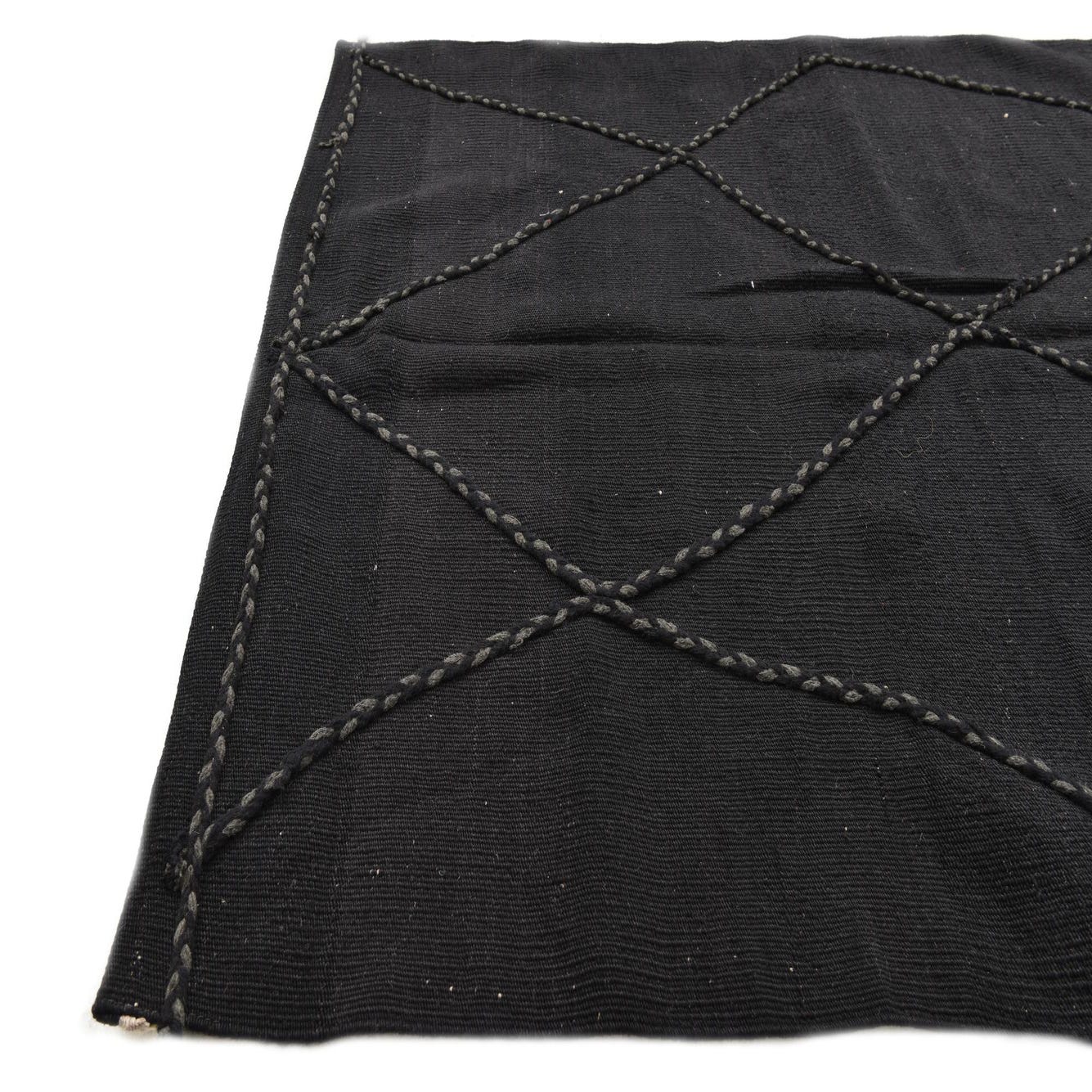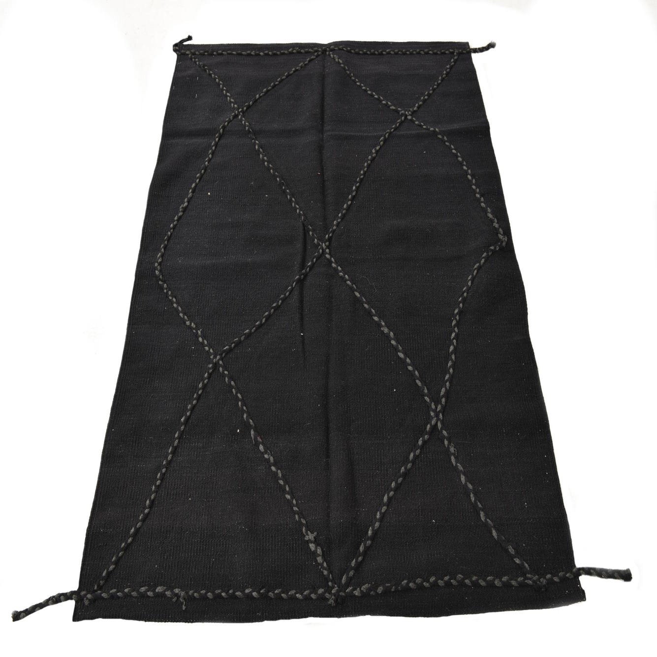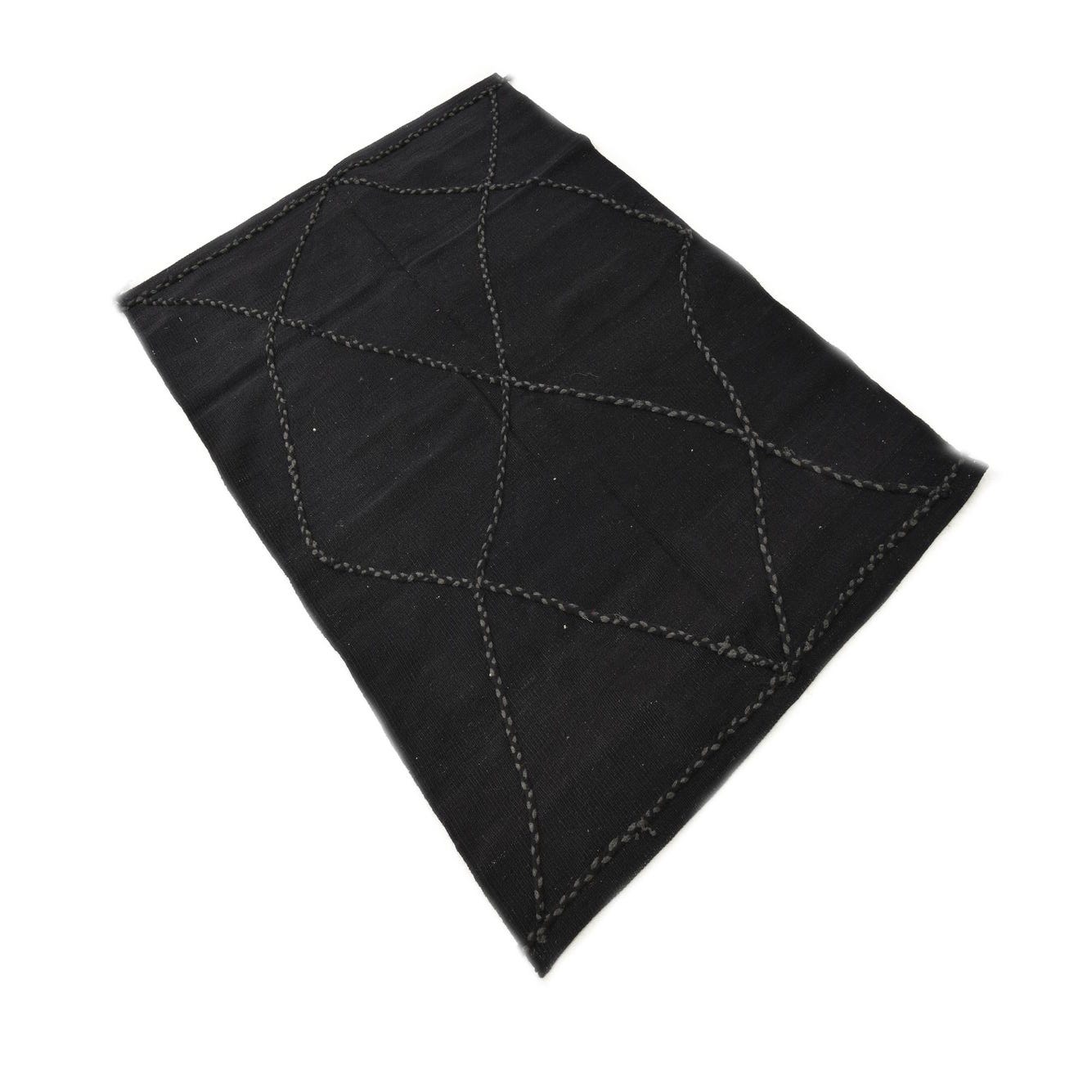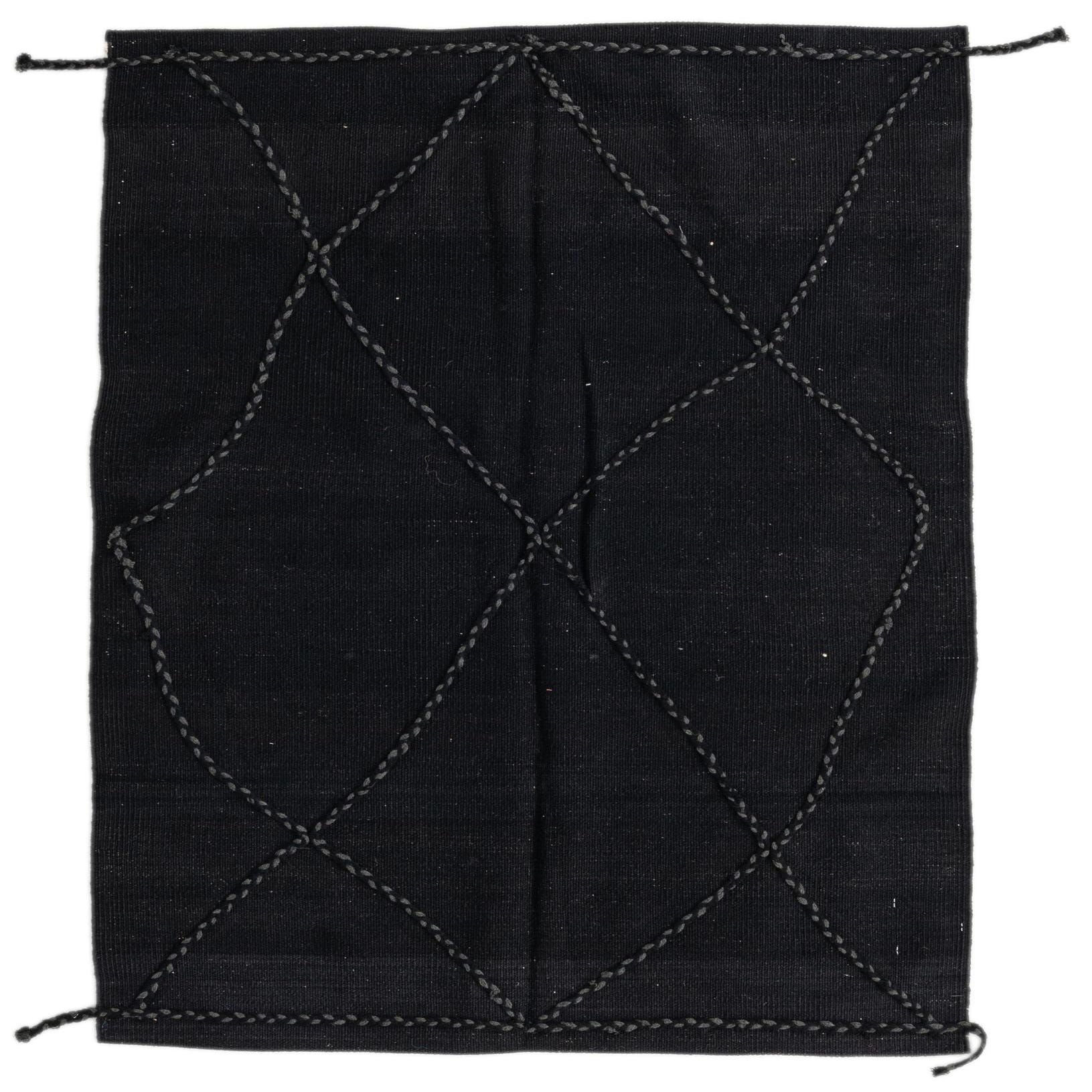 A 3x5 rectangular black wool shag rug with a modern tribal diamond pattern, handmade for indoor use.