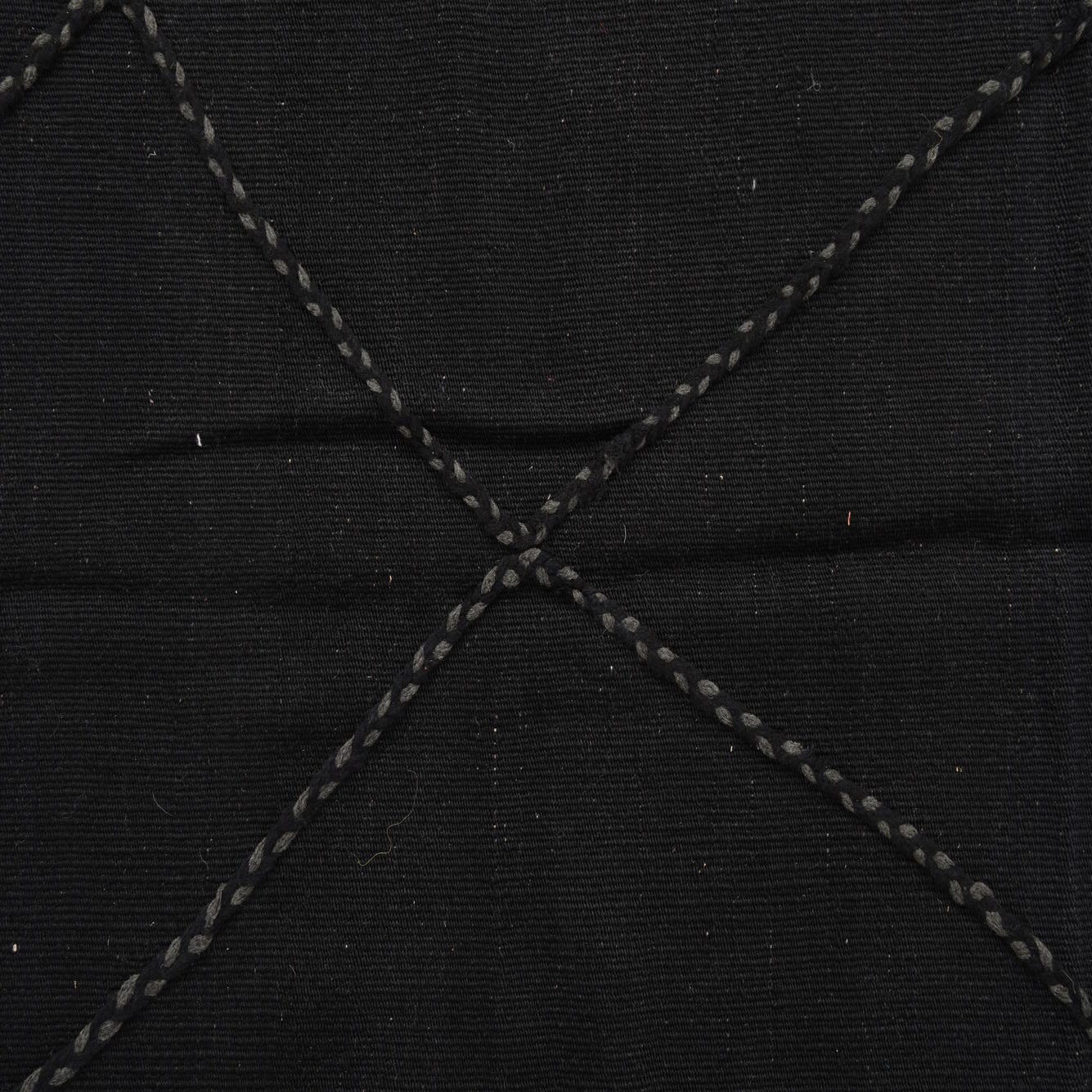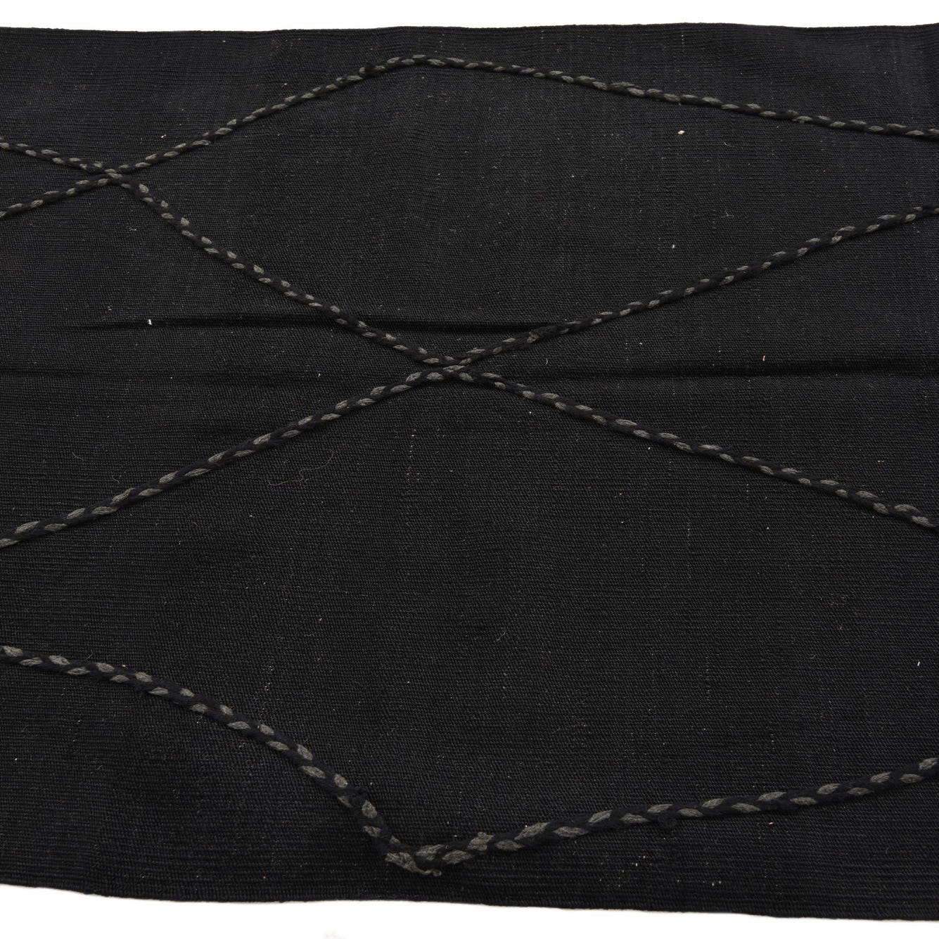 This Moroccan collection rug showcases a streamlined, geometric diamond pattern, creating a bold and dynamic look. Hand knotted from 100% wool, the rug has a textured surface that highlights the craftsmanship inherent in its construction. Its distinctive black background is complemented by the lighter, contrasting lines that define its design, imparting a modern simplicity that is versatile enough to integrate with various interior settings.