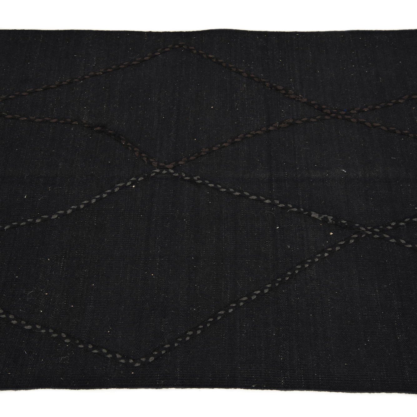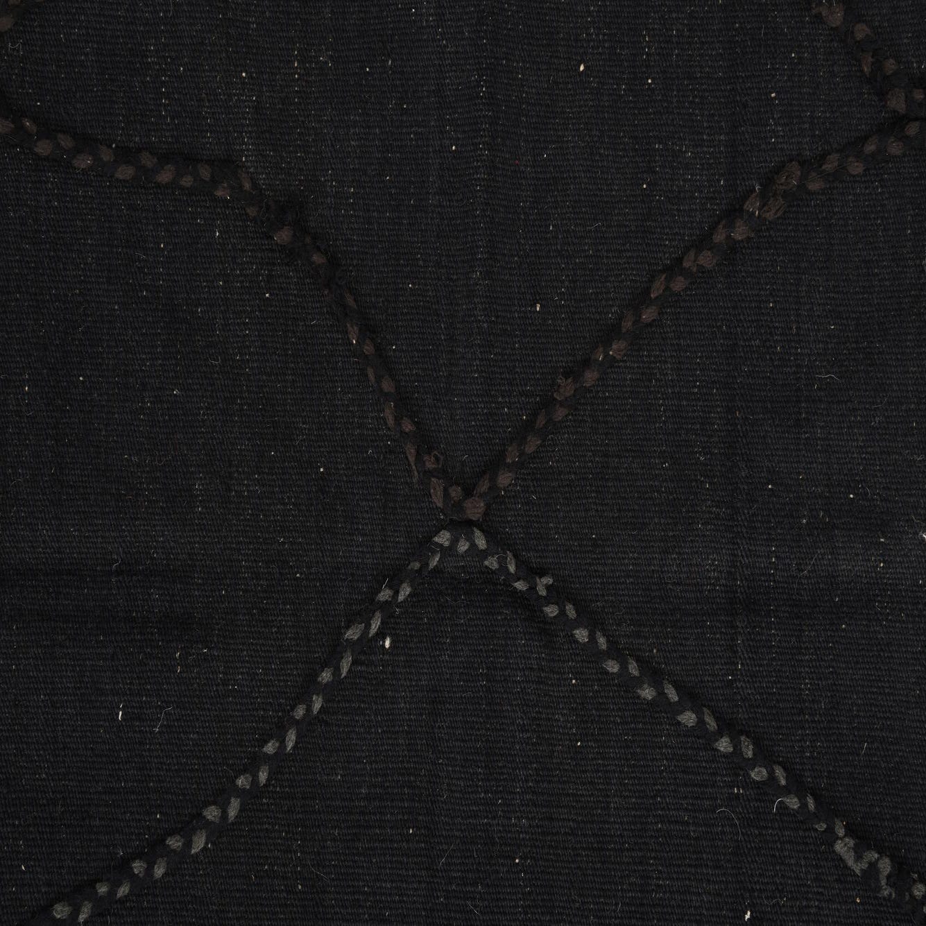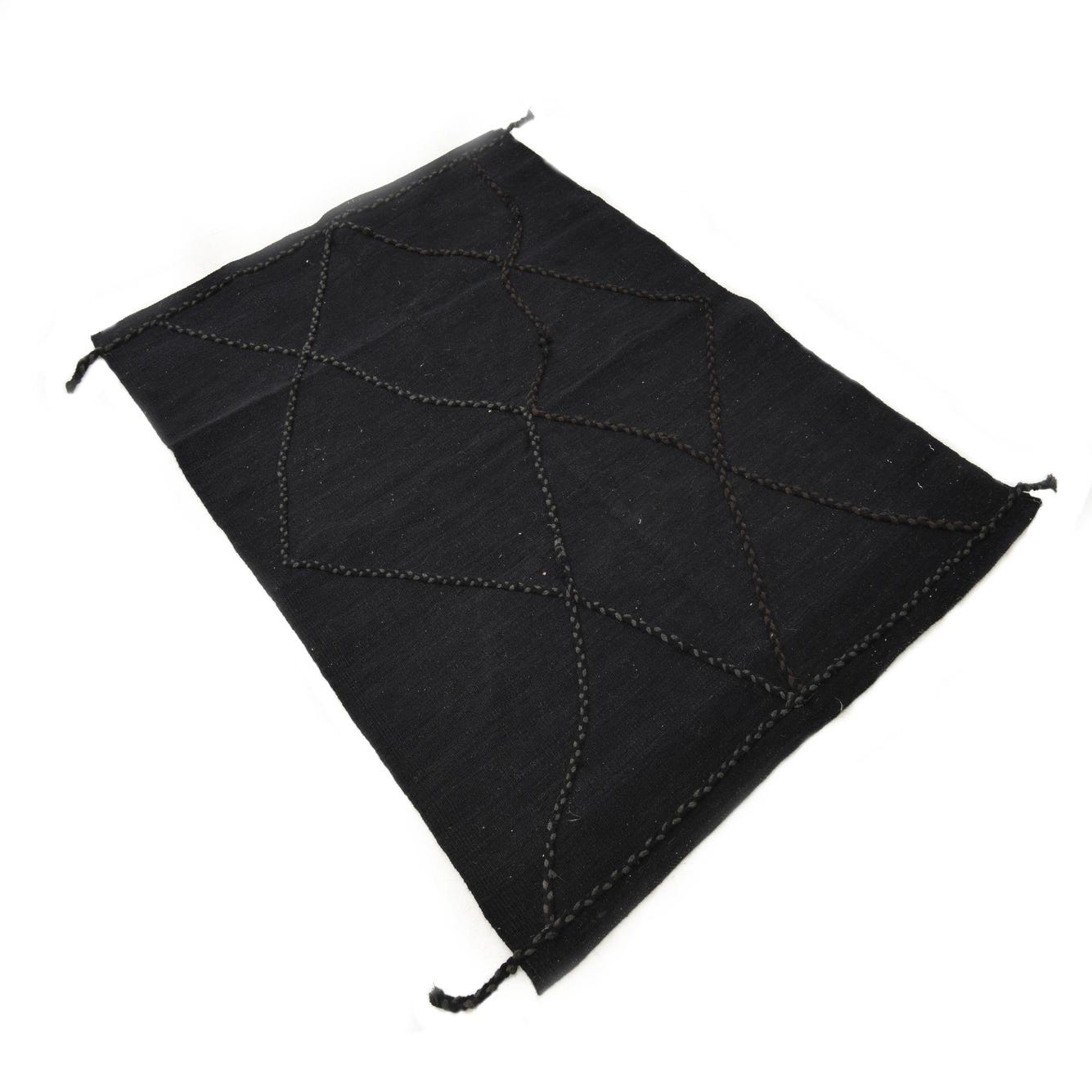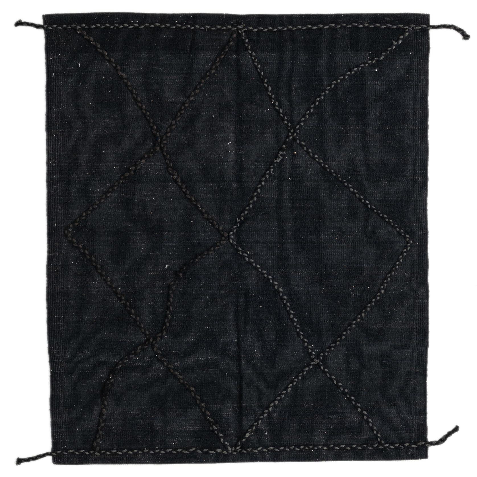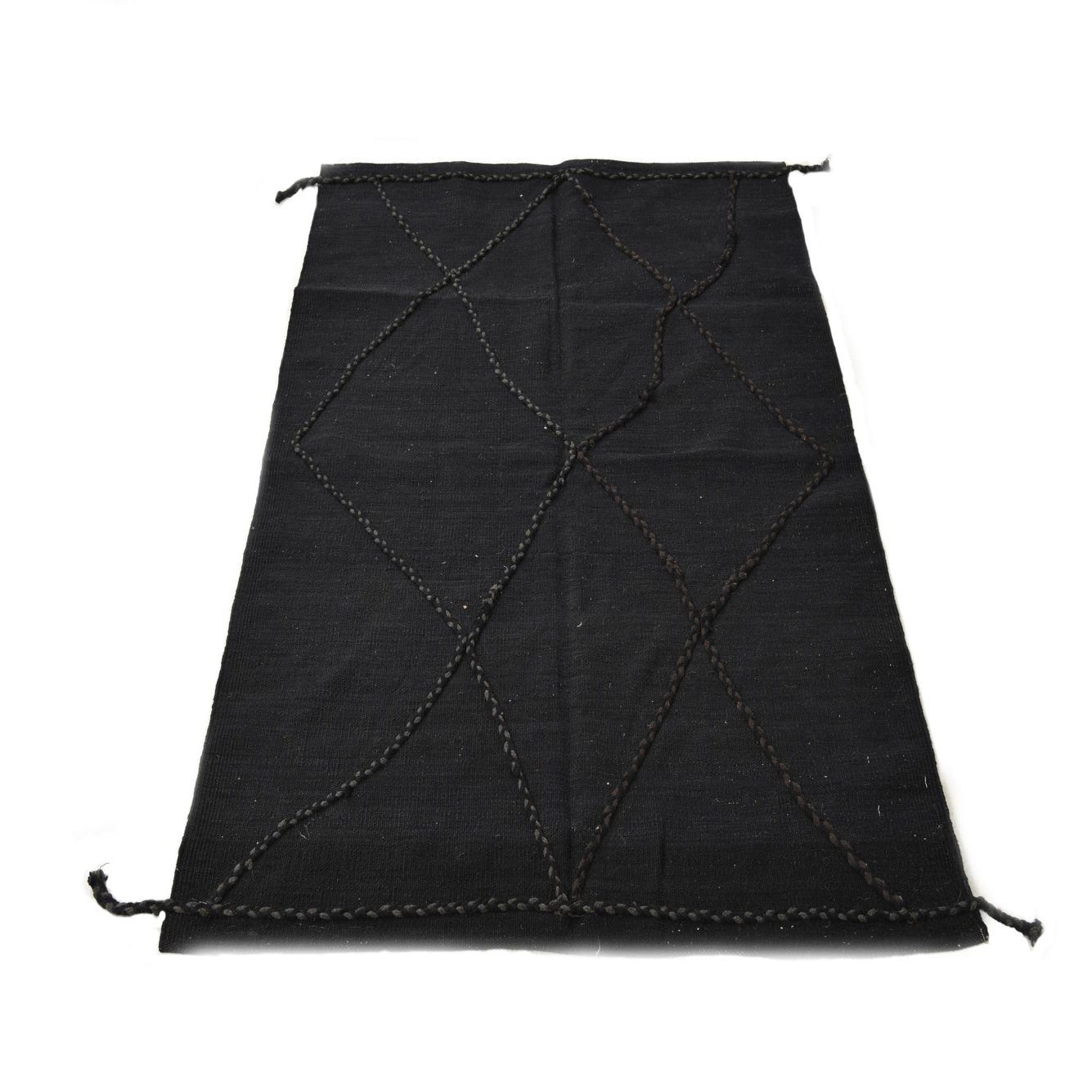 A 3x5 rectangular black wool shag rug with a tribal diamond pattern made from braided black yarn.