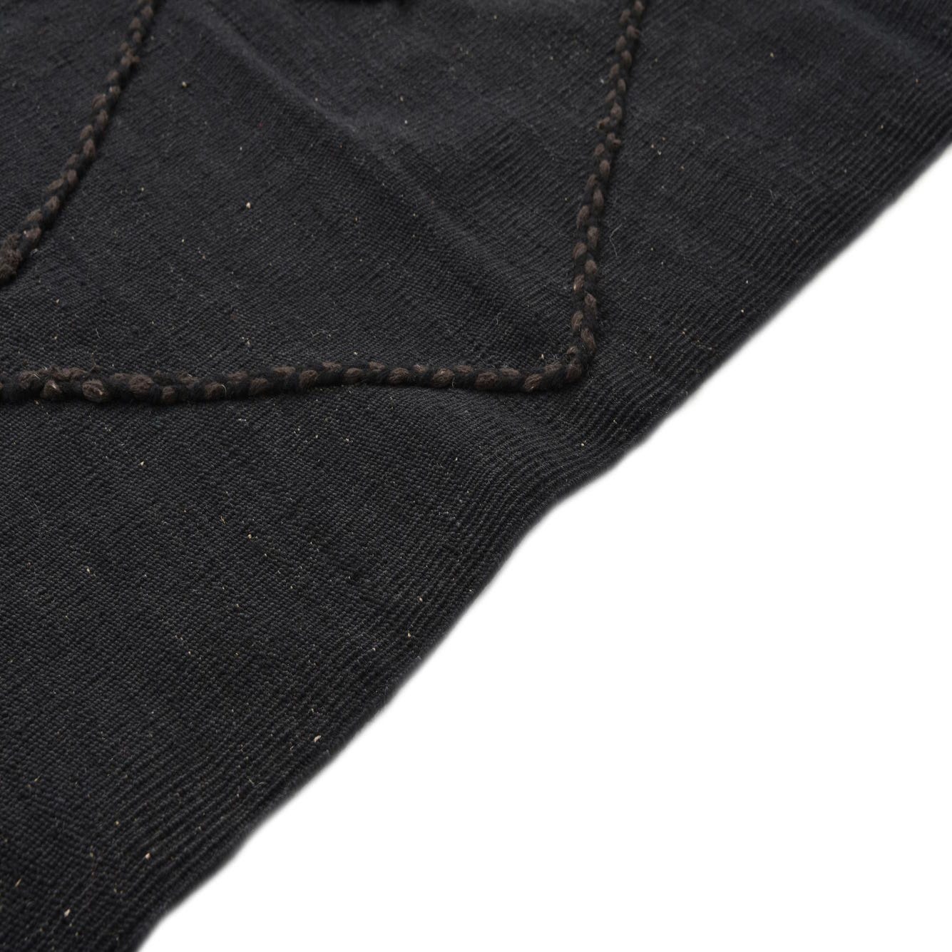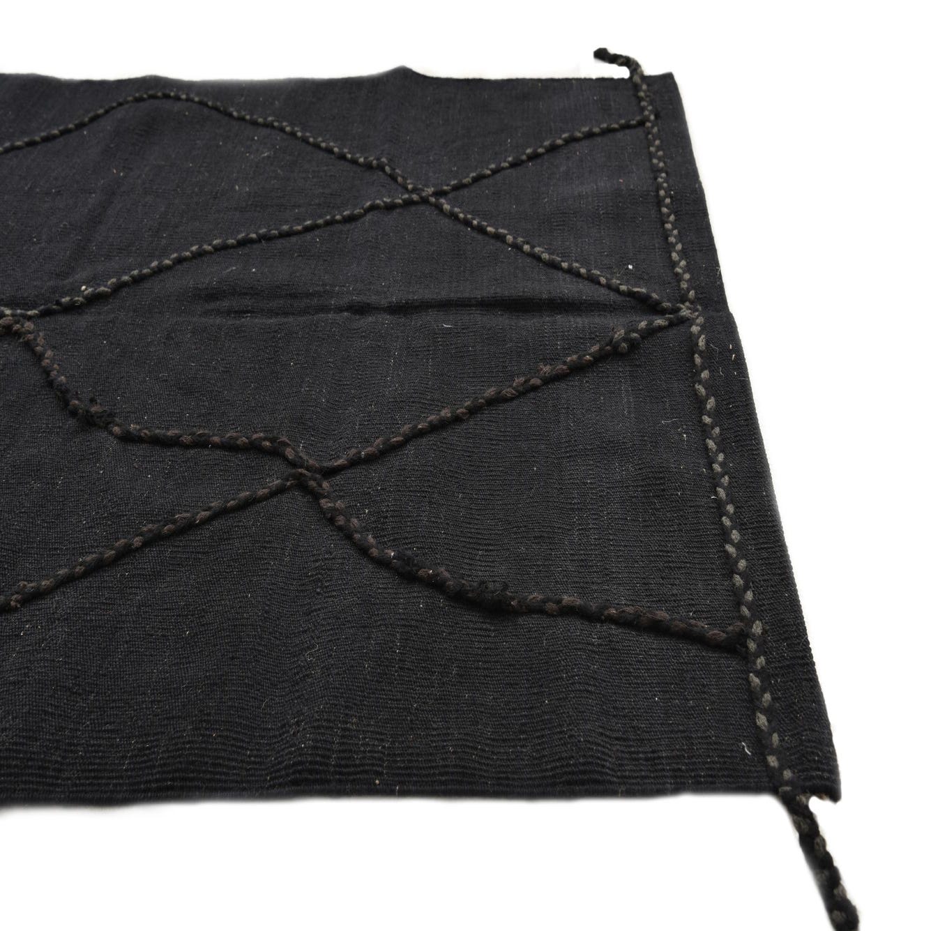 A deep black field sets a clean, modern stage for a relaxed diamond trellis worked in raised braided wool. The hand-knotted construction in 100% wool gives the pattern a subtle, tactile relief against a low, tightly woven ground. The diamonds are slightly irregular and organic in feel, adding handcrafted character while the tonal black-on-black palette keeps the look restrained and versatile.