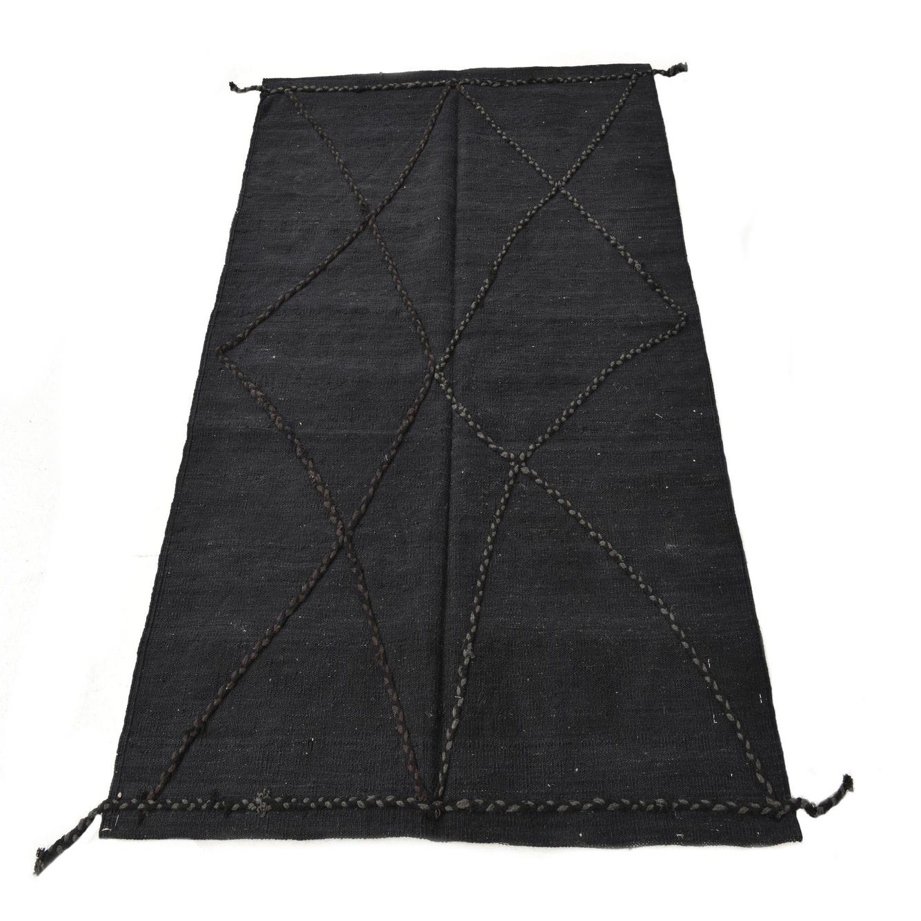 A 3x5 rectangular black wool shag rug featuring a tribal-modern geometric pattern of dark braided lines.