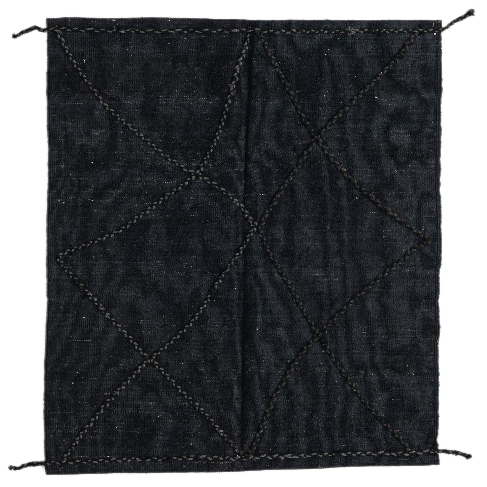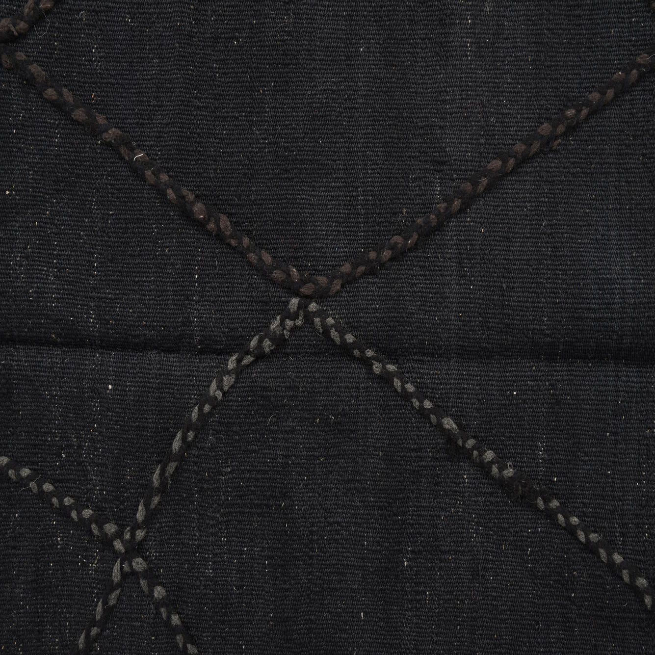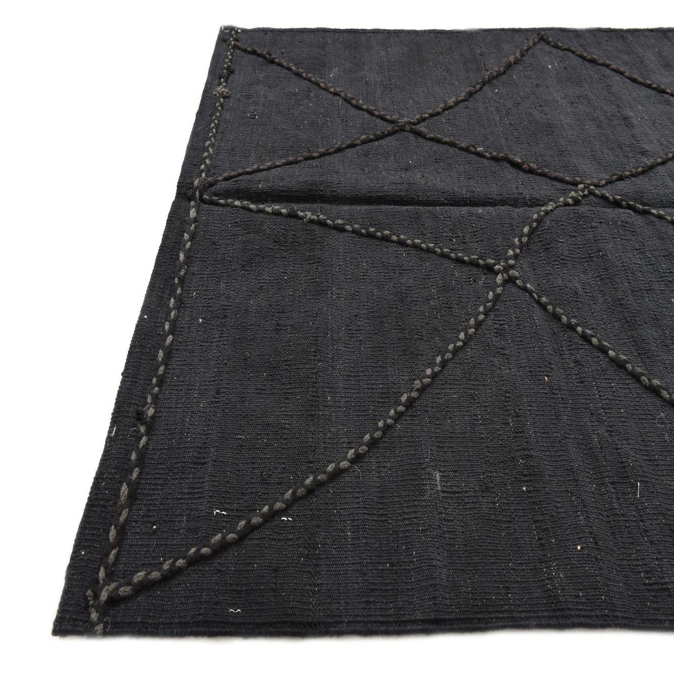 Hand-knotted from 100% wool, this rug has a deep black ground with subtle gray slubbing that gives the surface a soft, lived-in depth. A raised, braided linear pattern traces an oversized diamond lattice across the field, adding a tactile contrast between the low, dense pile and the thicker cords. The result is a modern, geometric look with traditional hand-knit character — matte black tones highlighted by muted gray flecks create a restrained, tonal palette.