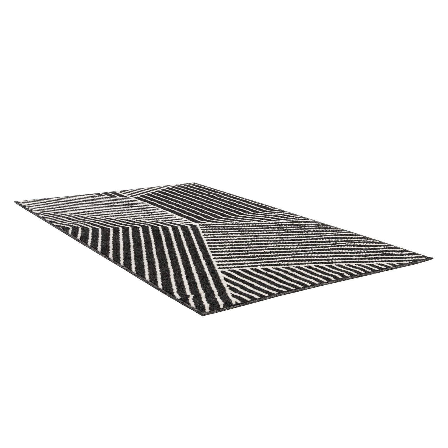 A 3x5 rectangular black and white modern rug with bold geometric stripes in varying directions, suitable for an entryway.