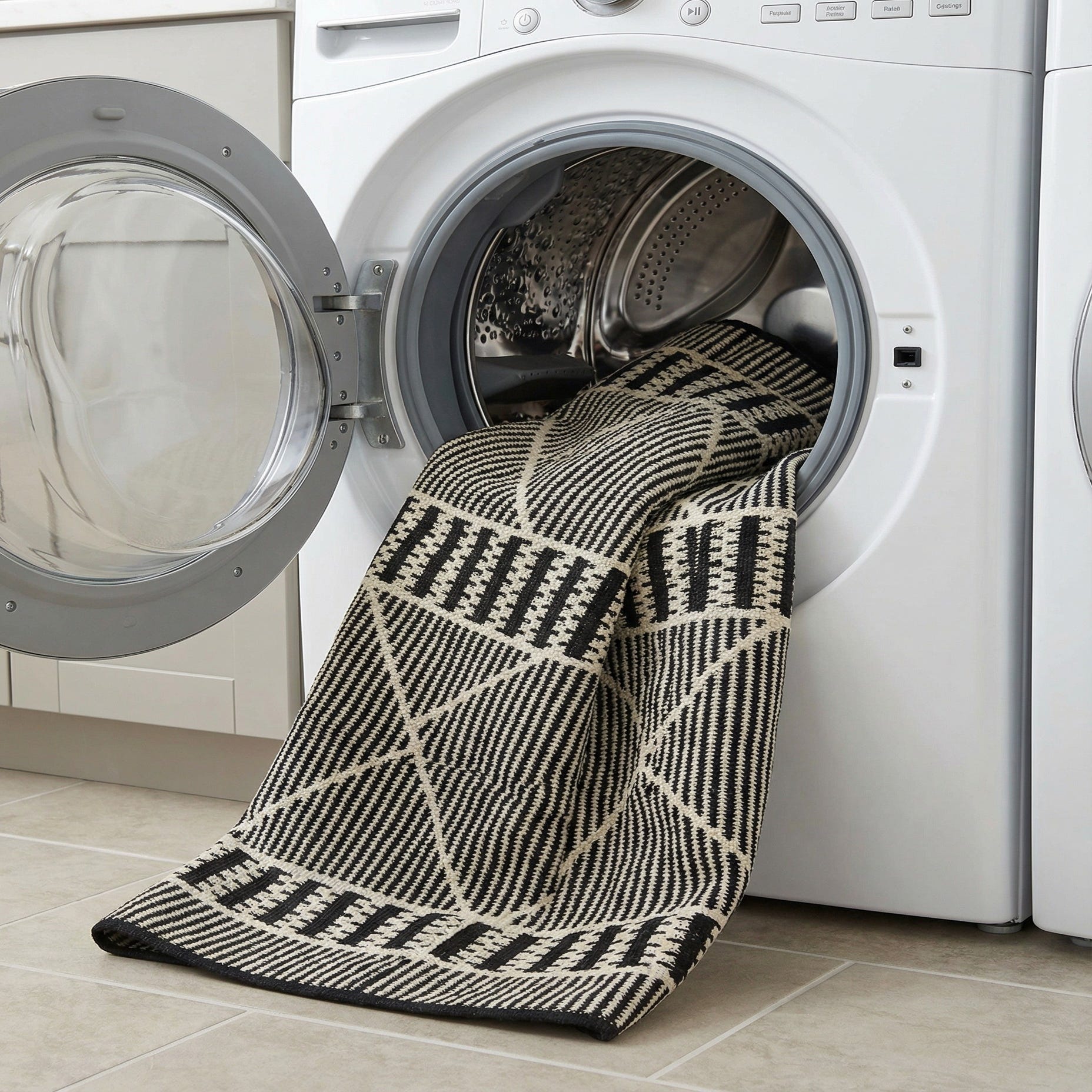 Machine-made from 100% polypropylene, the flatwoven construction has a low-profile, slightly textured hand that lies flat and holds shape in busy spaces. Its combination of durable synthetic fiber and tight weave makes it well suited for entryways, covered porches, balconies, or kitchens where a sleek, easygoing rug is needed. Pair it with streamlined modern furniture and metal accents for a contemporary look, layer it under a bistro table or outdoor dining set for casual gatherings, or use it to ground neutral seating with black and natural-wood elements for a balanced, graphic statement.
