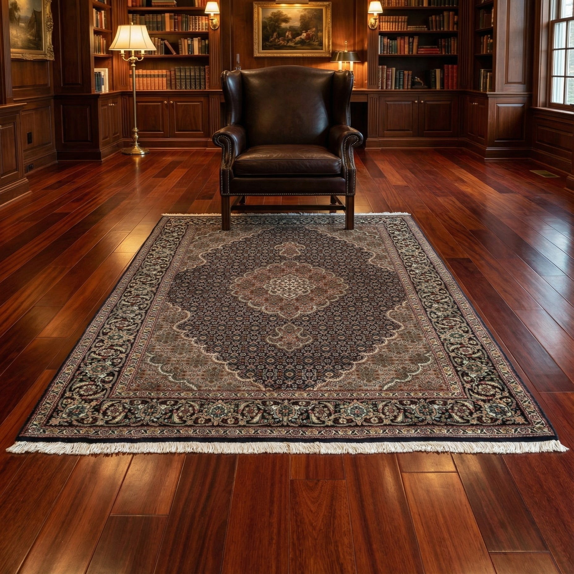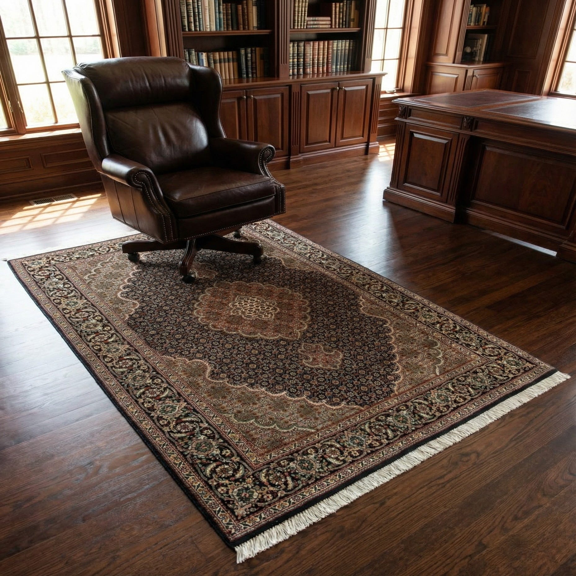 Place this piece in a small seating area, an entryway, or at the foot of a bed to add pattern and depth. It pairs naturally with dark wood or leather furniture and brass or antique metal finishes, and it can also provide a grounded contrast in a modern, neutral room when layered over a larger, lighter rug. The rug’s compact scale and classic motif make it versatile for traditional, transitional, or eclectic interiors.