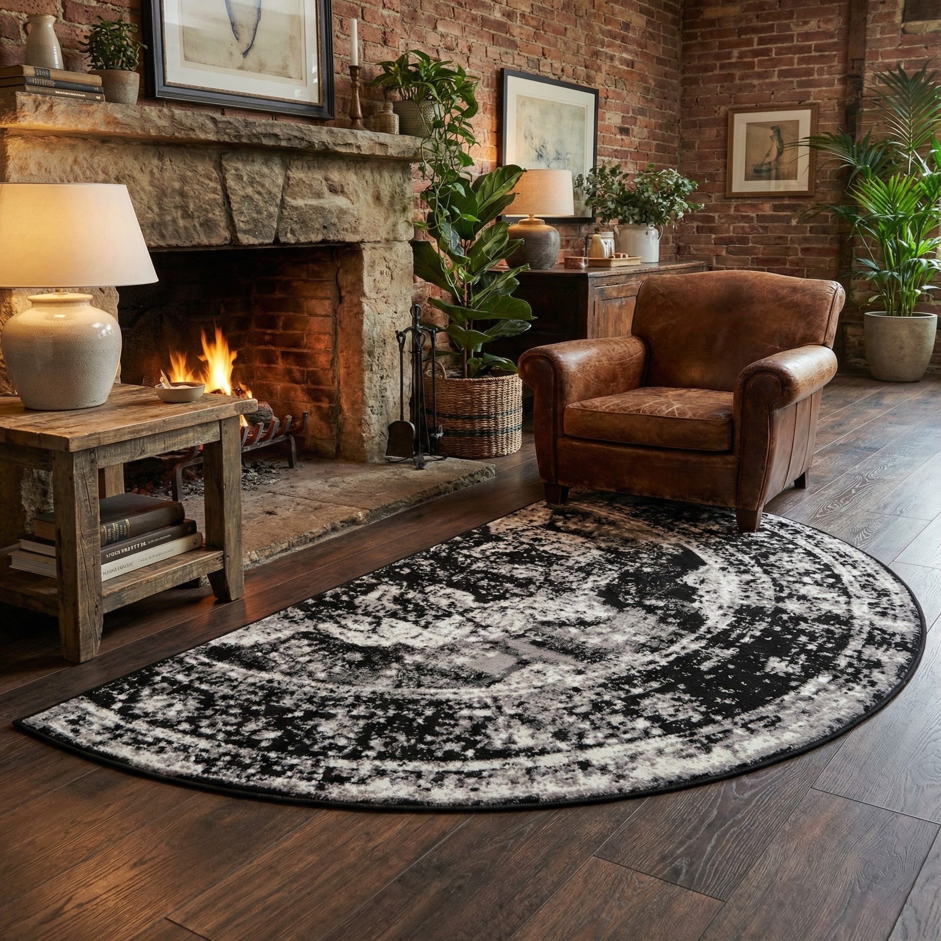 This rug’s contemporary styling makes it an excellent choice for various interior design scenarios. Its semi-circular hearth shape is ideally suited for placement in front of a fireplace, providing a refined yet inviting ambiance. In addition, the contrast of black and ivory allows it to stand out in minimalist decors or integrate seamlessly into monochromatic color schemes. Alternatively, it could serve as a grounding element amidst more vibrant decor, helping to balance and tie together a room with brighter accents.