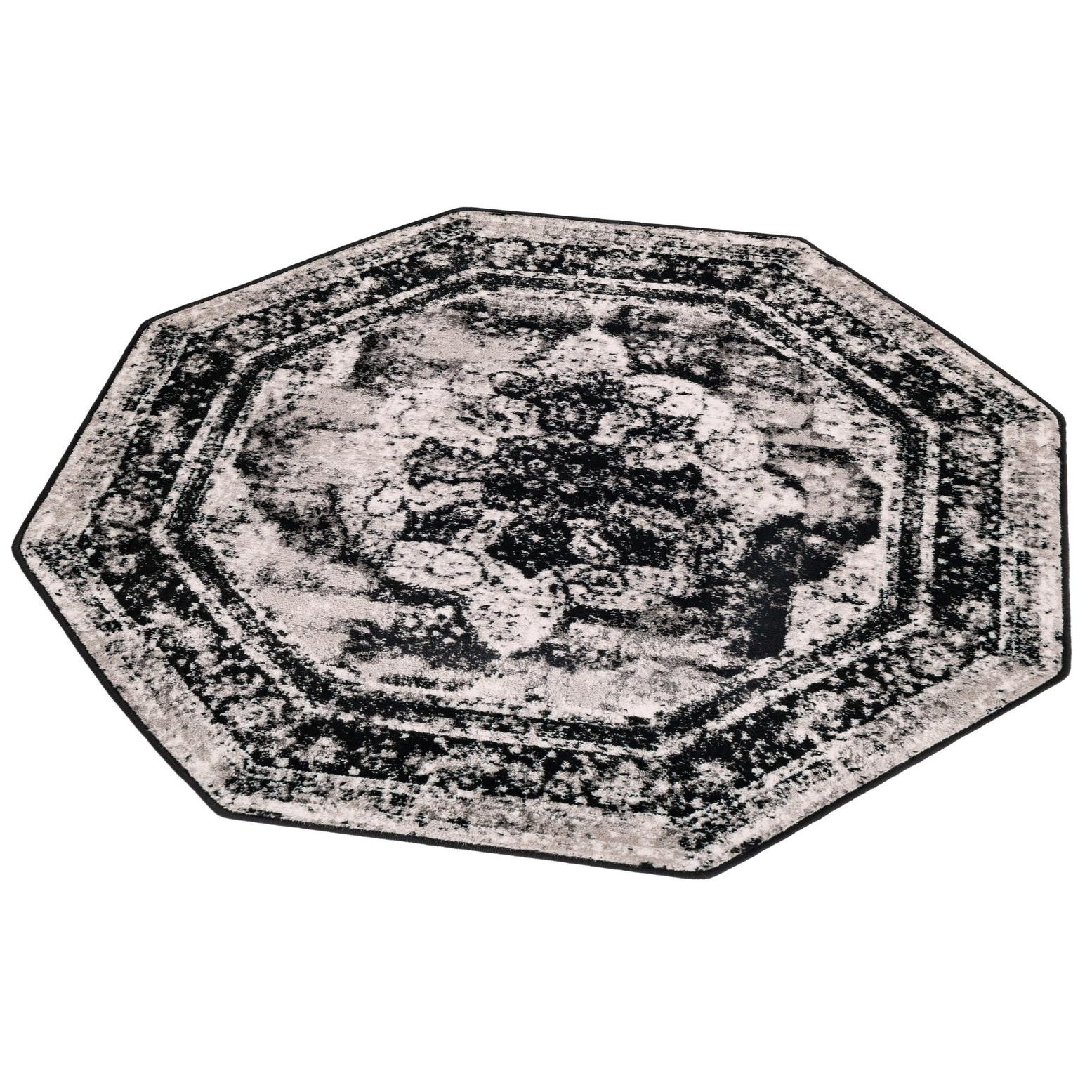 The Monte Carlo collection presents a 4 Ft Octagon rug that offers a dynamic visual impact with its rich black background and contrasting gray and ivory detailing. Crafted from 100% Polypropylene, this piece showcases a distressed traditional pattern that imparts a sense of timelessness and elegance. The octagonal shape adds a unique geometric touch to any room, making it a versatile addition to a variety of interior design themes.