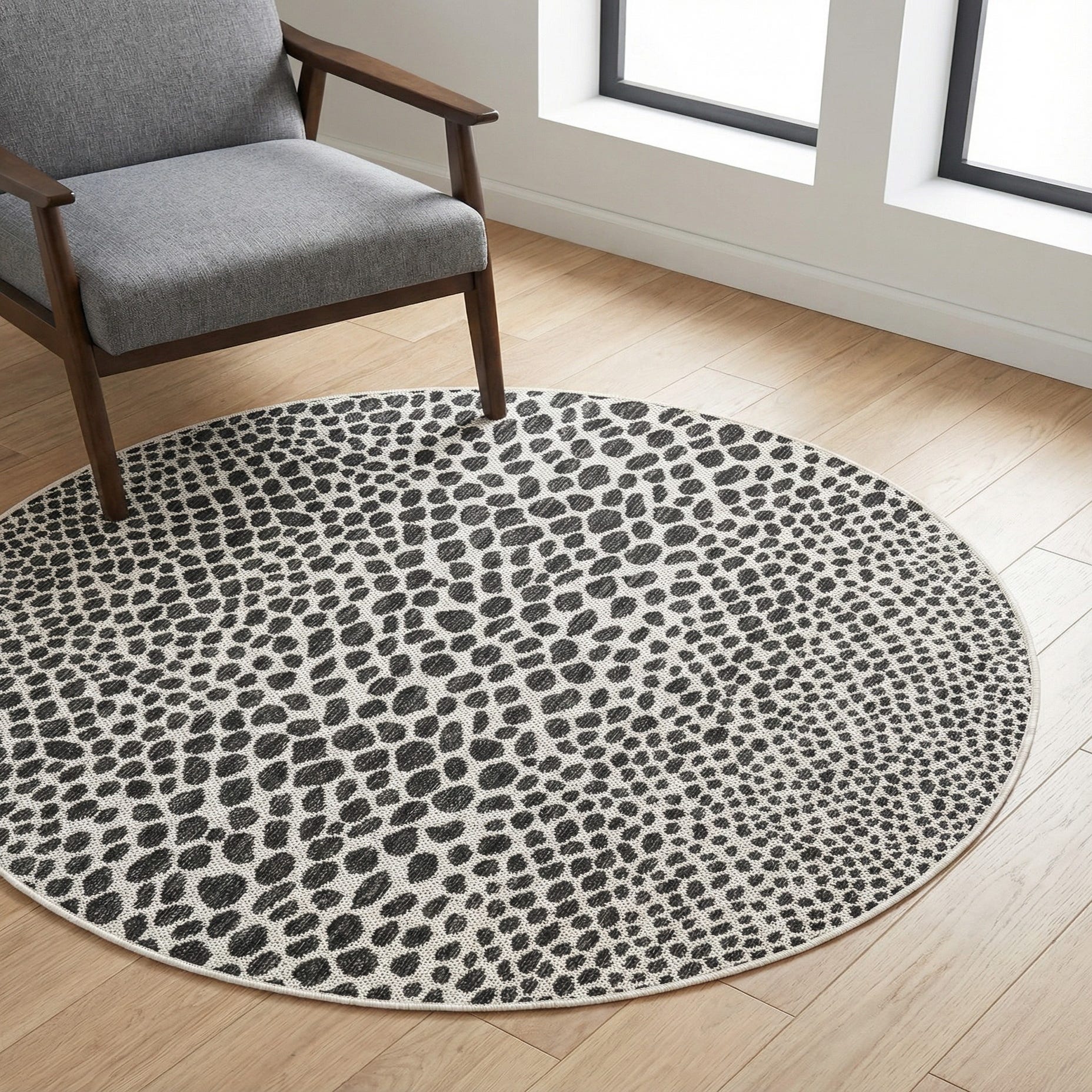 A scattered pebble motif in soft ivory rests against a deep black ground, creating a modern, organic look that feels both graphic and natural. The irregular, varying-size spots create visual movement across the round shape, while the low-profile, tightly woven surface offers a gently textured hand underfoot. Machine made of 100% polypropylene, the weave sits flat and finished with a clean edge.