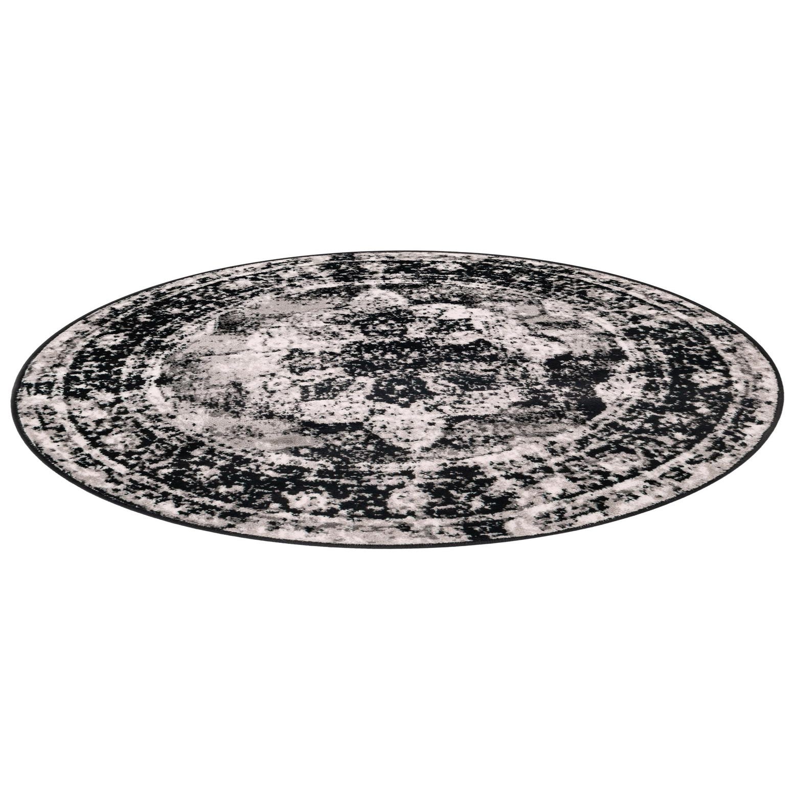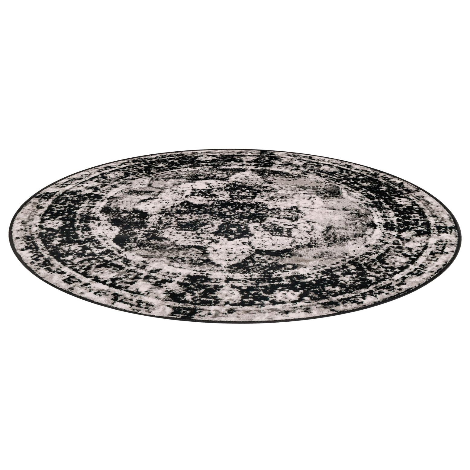 The Monte Carlo Collection offers a 4 Ft Round rug crafted from 100% polypropylene, providing both durability and a soft texture underfoot. This rug showcases a rich, deep black background, complemented by dynamic patterns in shades of ivory and gray, creating a bold and striking visual. The distressed abstract design brings an artistic and contemporary flair, ideal for a modern living space or for adding contrast to a minimalist decor.
