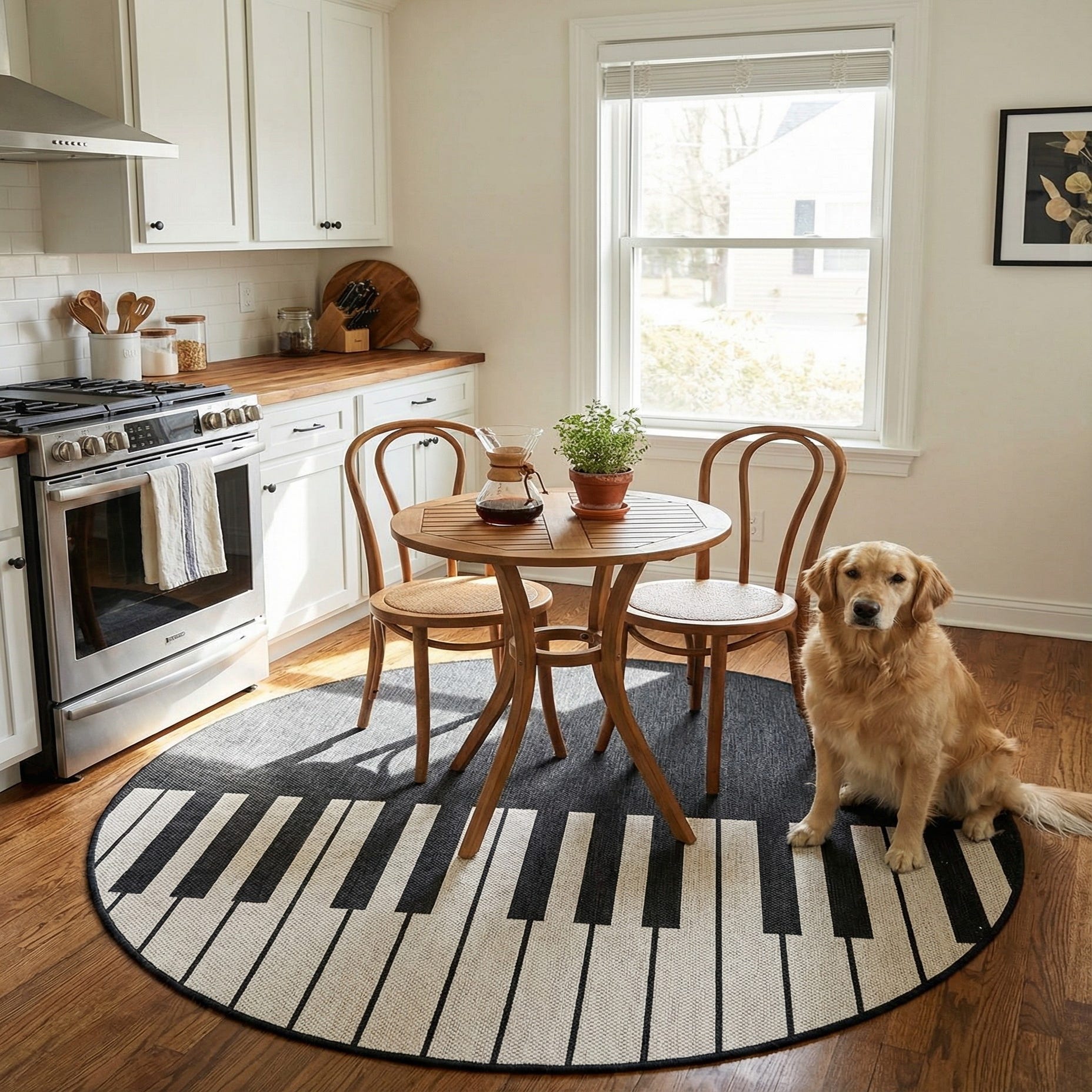 A 4' 0 x 4' 0 round black and white modern rug with horizontal stripes, some offset, creating a geometric pattern.