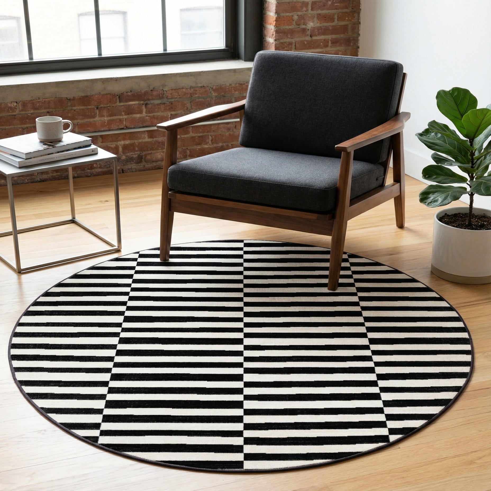 The rug's 4 ft round size offers versatility for placement in a variety of spaces. Its crisp, contrasting colors can create a focal point in minimalist settings or serve as a complement to more eclectic decors. Ideal for use in areas such as entryways, home offices, or small sitting areas, this rug can seamlessly integrate with modern furniture pieces and monochromatic color schemes, or it can offer a visual break in rooms that feature more intricate patterns.