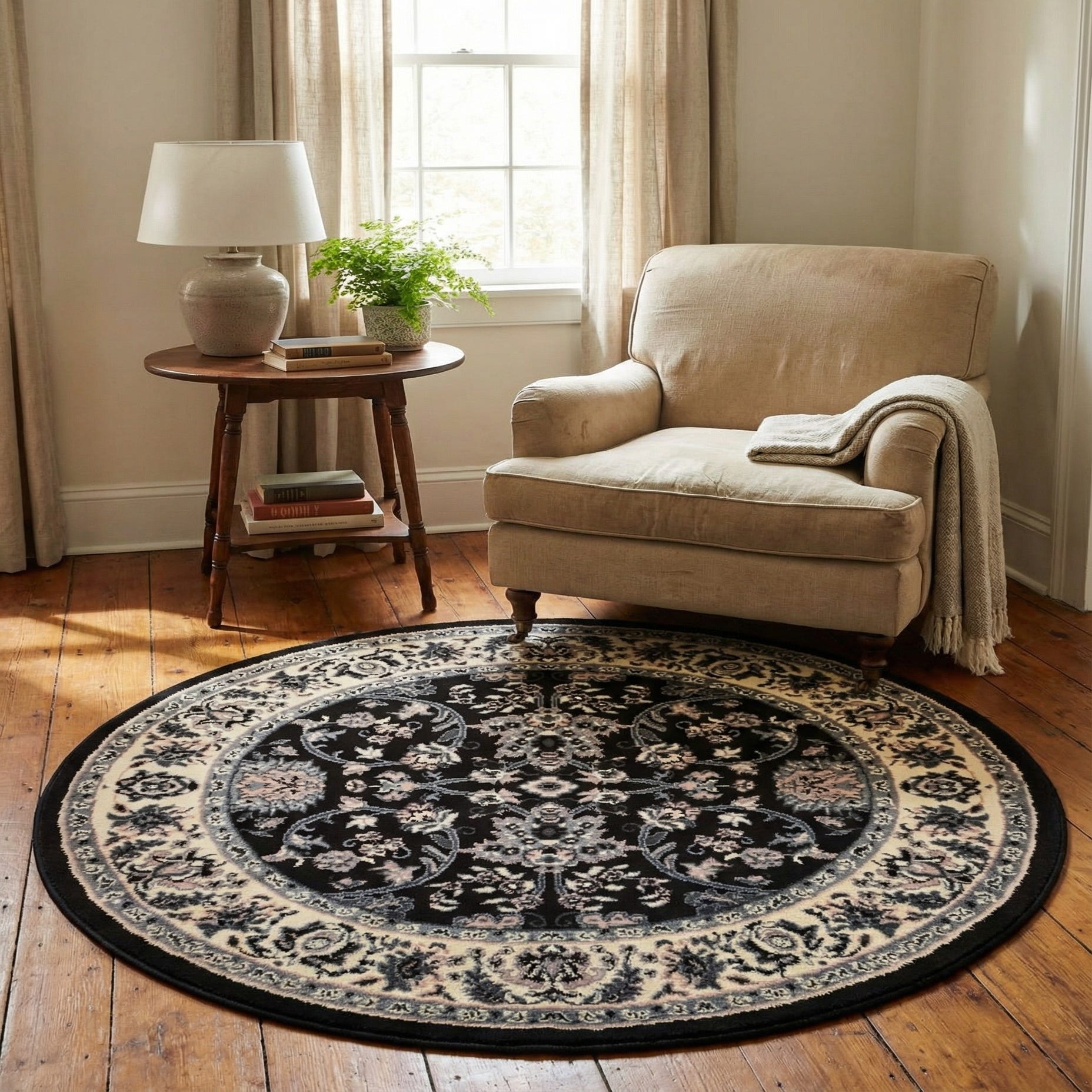 A 4' round black traditional rug with an ornate floral and oriental pattern in cream, grey, and subtle pink tones.