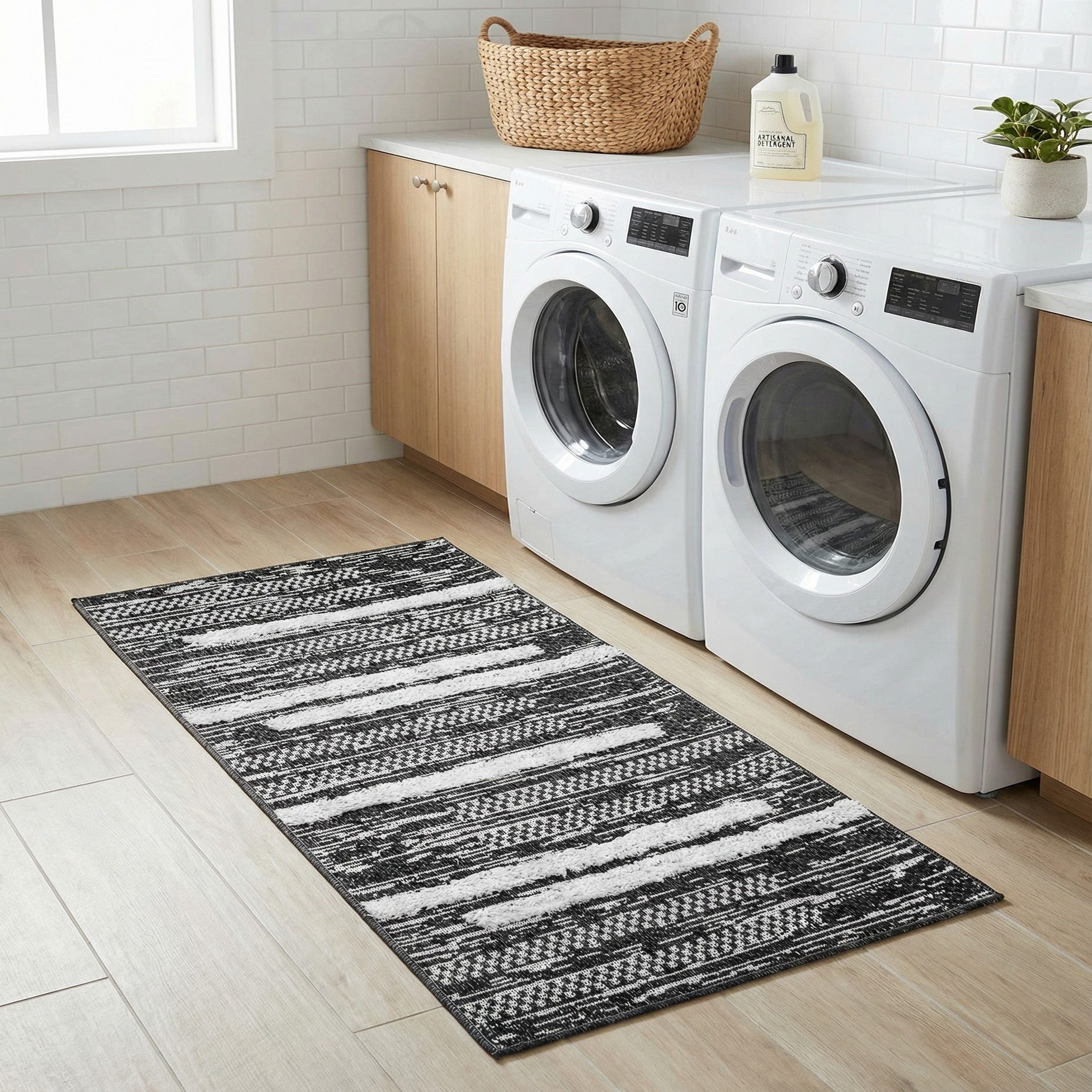 A 4 ft runner rug in black and white, featuring a contemporary stripe pattern with textured high-low pile.