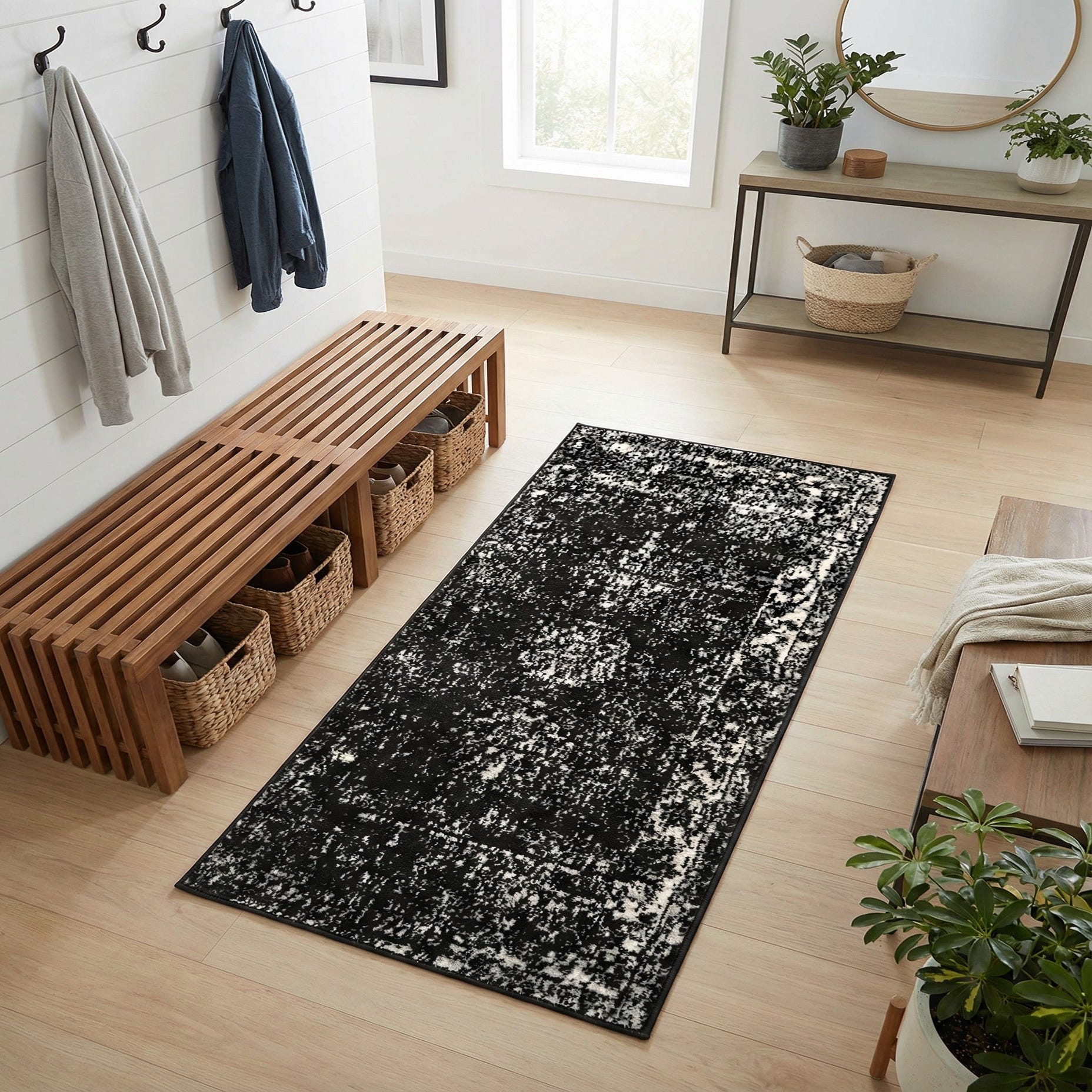 Primary color is Black. Colors in this rug include: Black, Gray, Ivory.