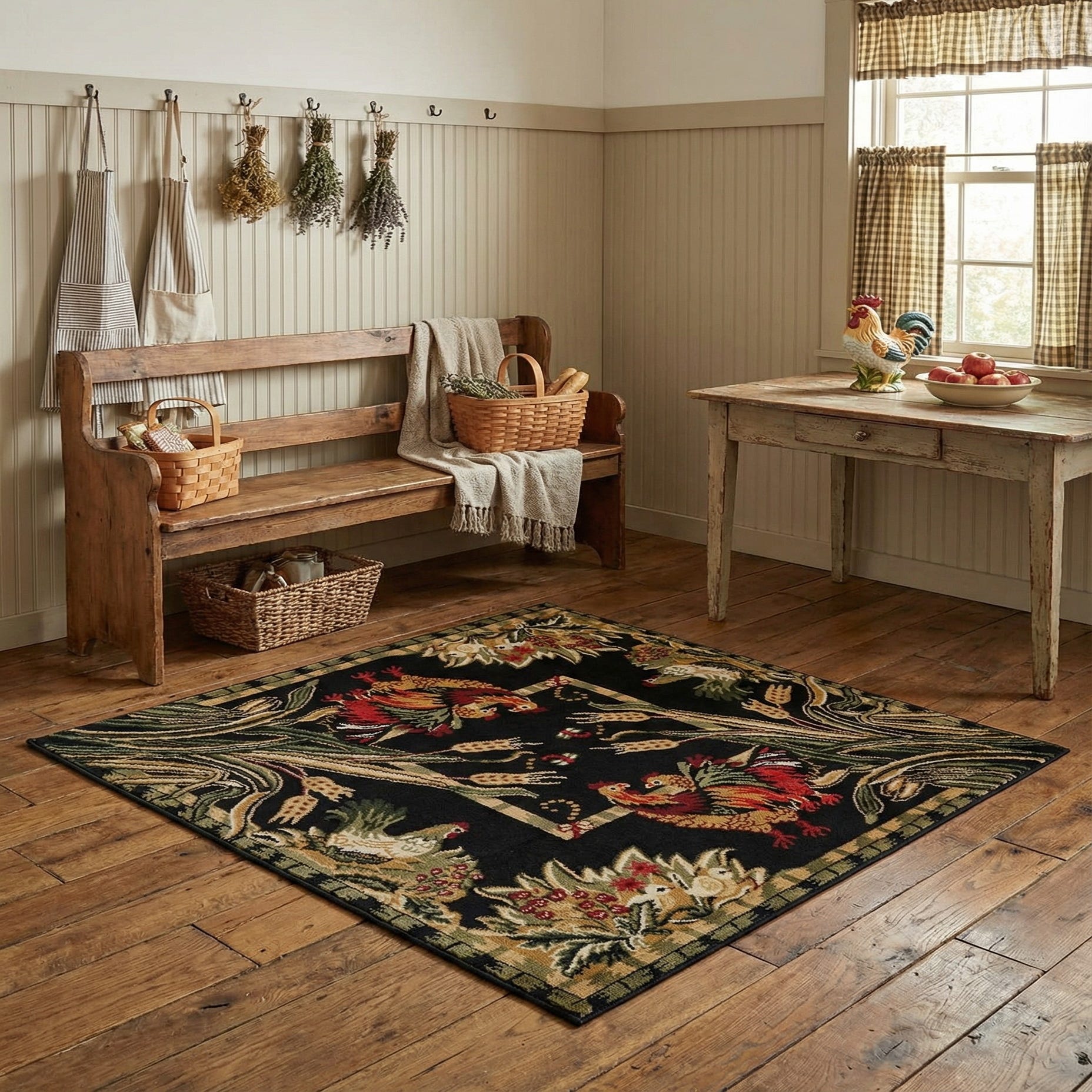 A 4'x4' square black rug featuring a traditional botanical and country pattern with roosters and wheat stalks.