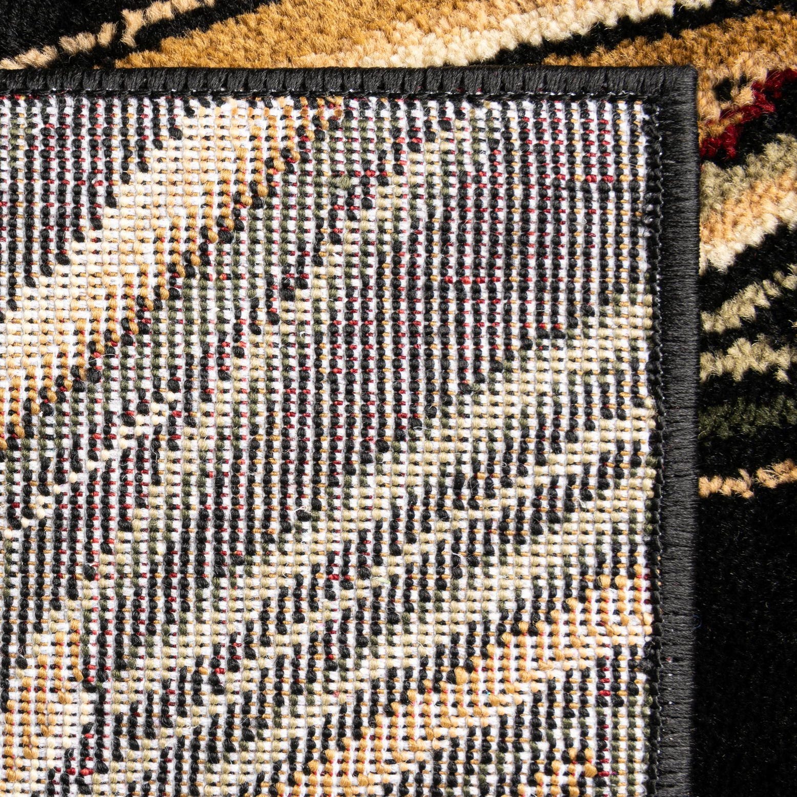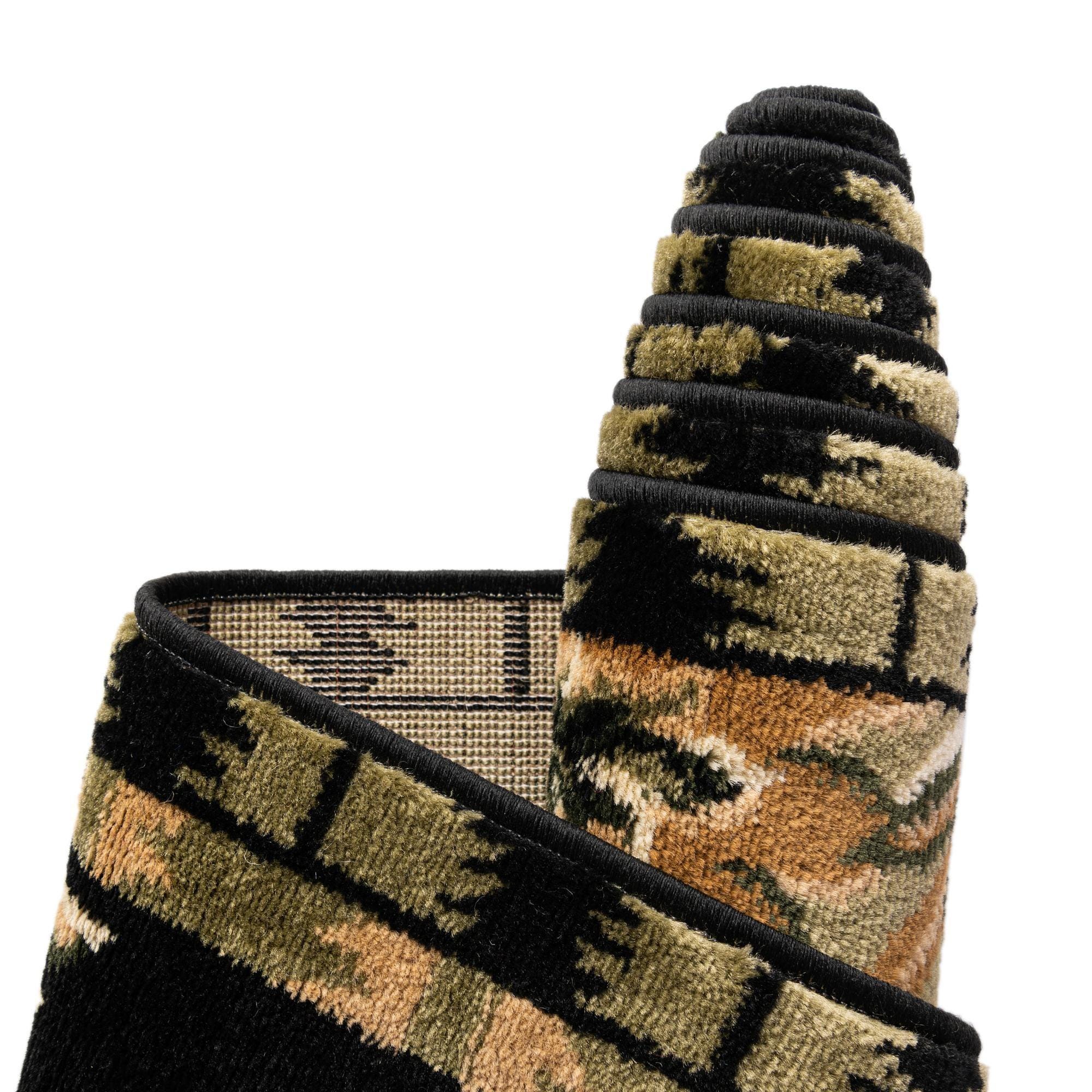 Primary color is Black. Colors in this rug include: Black, Cream, Green, Light Brown, Red, Rust Red, Tan, Olive.