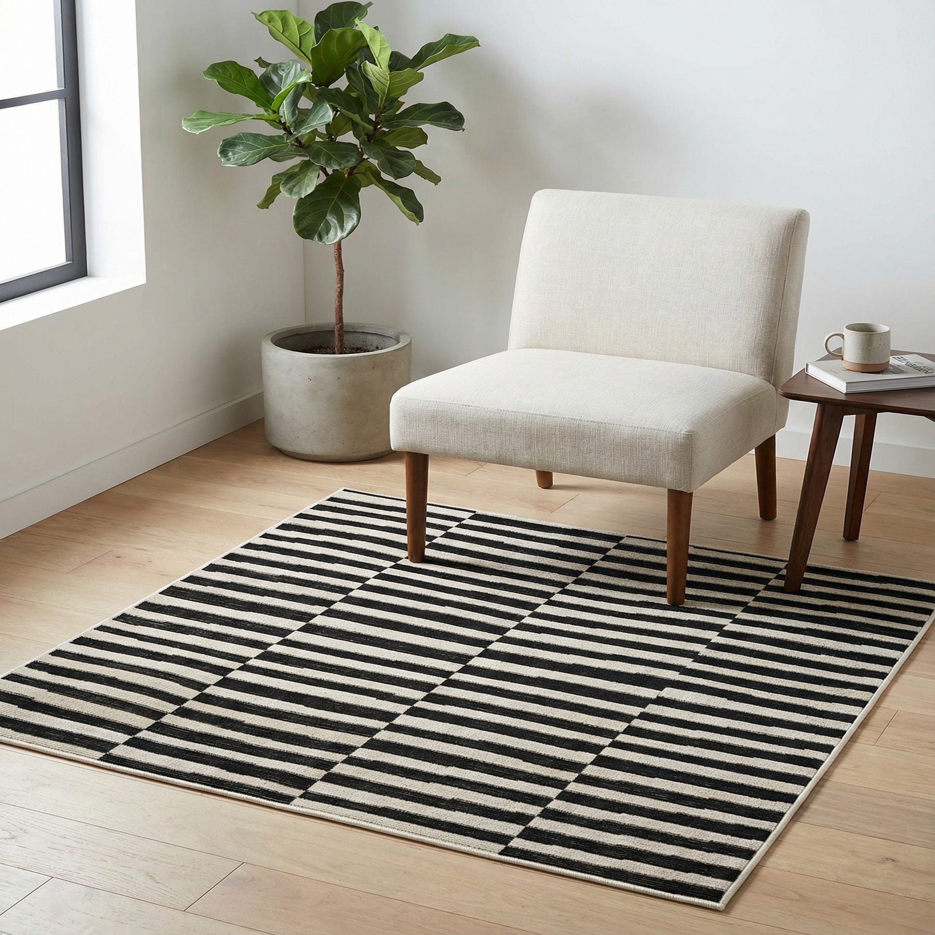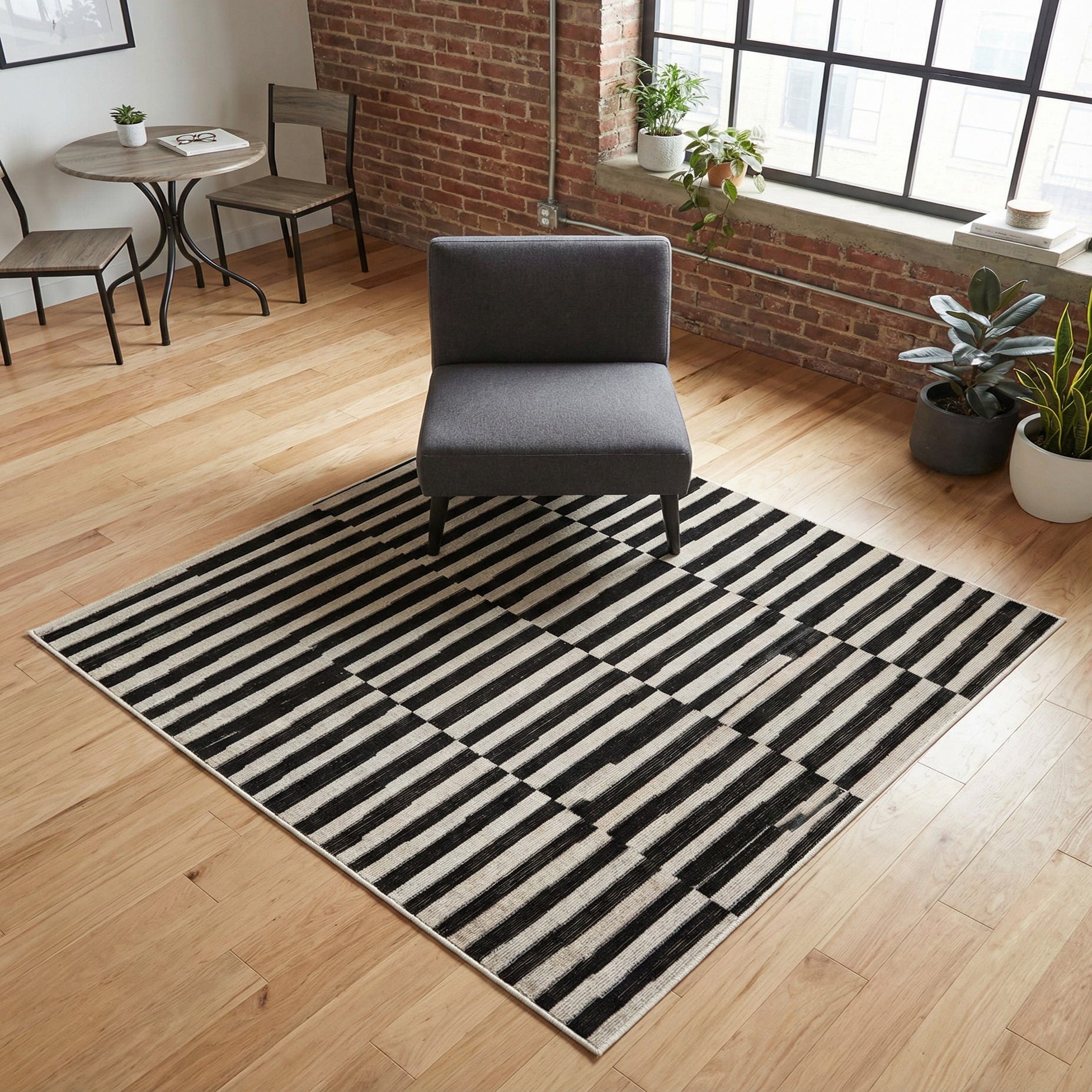 This piece would be particularly well-suited to modern and minimalist interiors, where its clean lines and contrasting colors can complement a sleek and uncluttered space. Additionally, it could serve as a dramatic centerpiece in eclectic or industrial decors, offering a strong geometric presence amidst a mix of textures and materials. The rug's durable construction makes it a practical choice for high-traffic areas such as living rooms or home offices.
