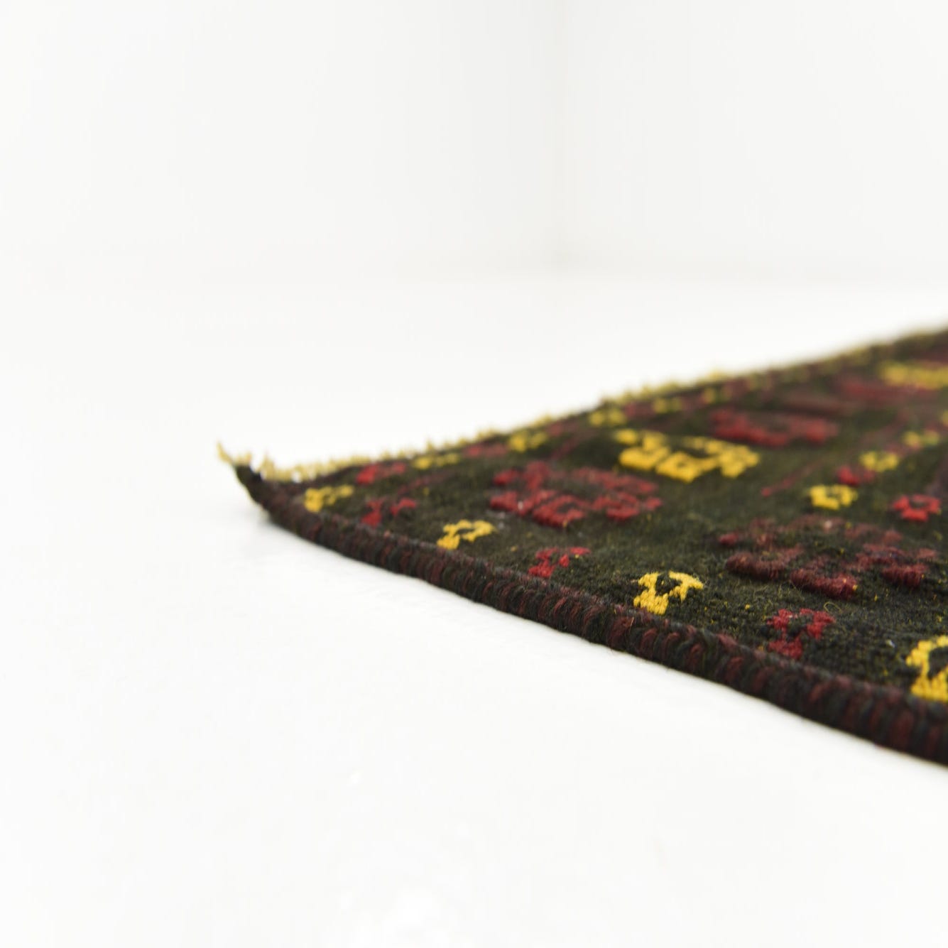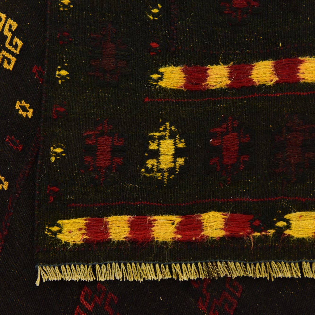 Primary color is Black. Colors in this rug include: Black, Ivory, Plum Red, Red.