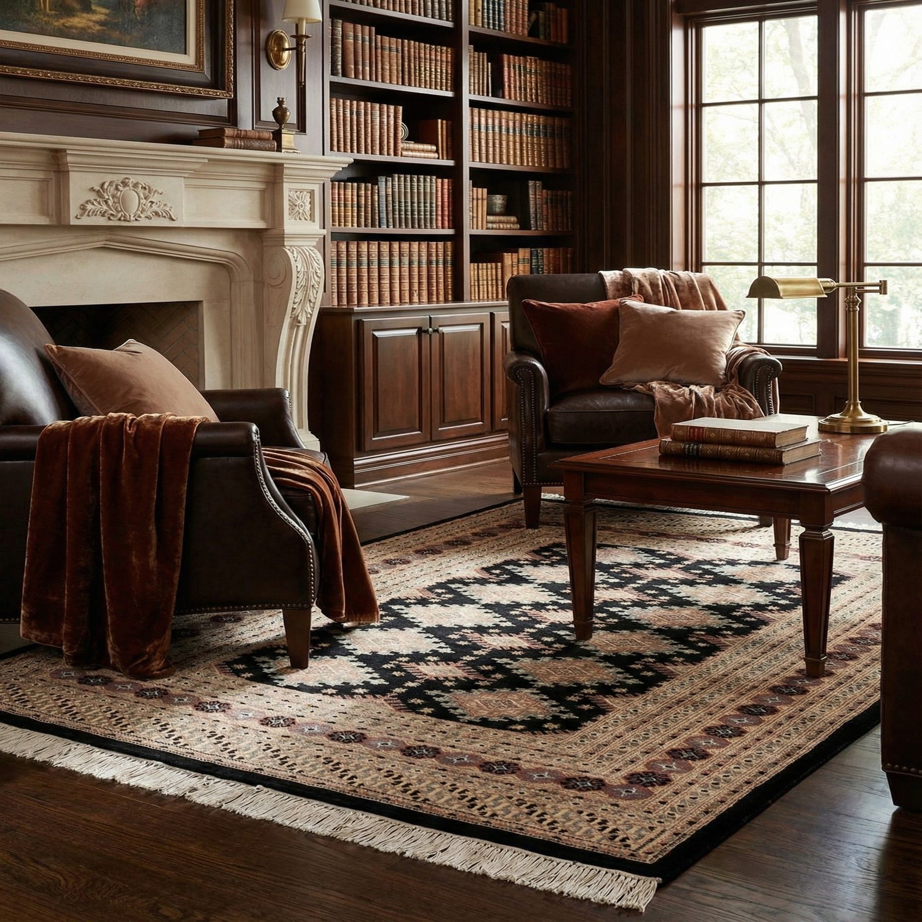 Primary color is Black. Colors in this rug include: Black, Beige, Gray, Ivory, Brown.