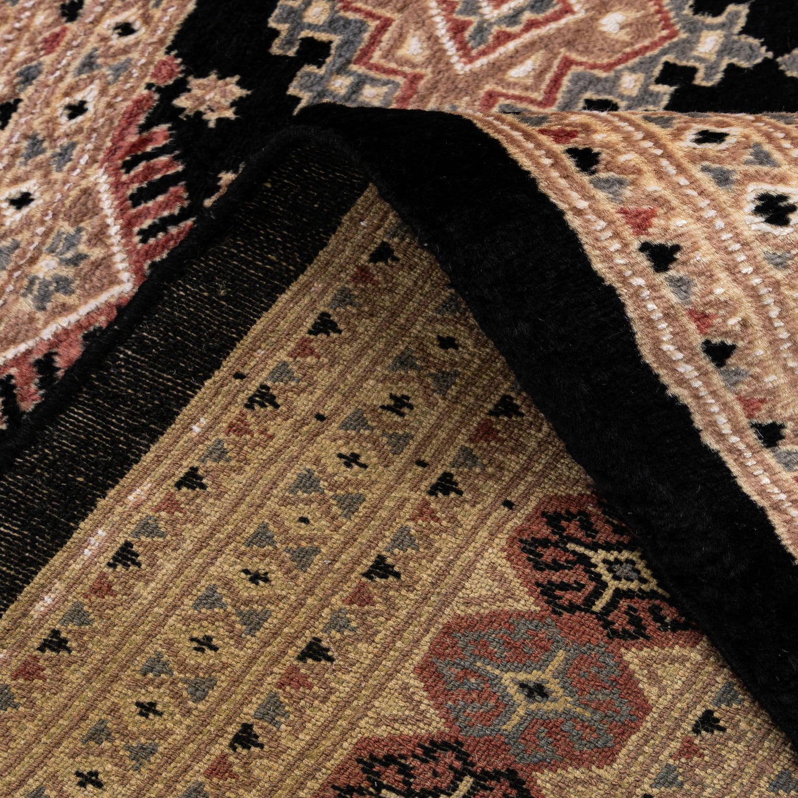 A 4x6 rectangular Bokhara rug featuring a black field with intricate tribal and medallion patterns in various shades of beige, brown, and gray, framed by a multi-layered border and finished with white fringe.