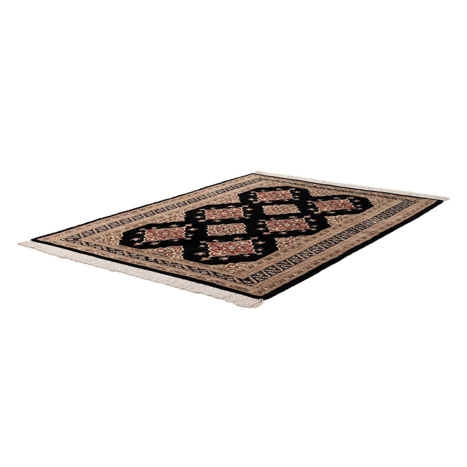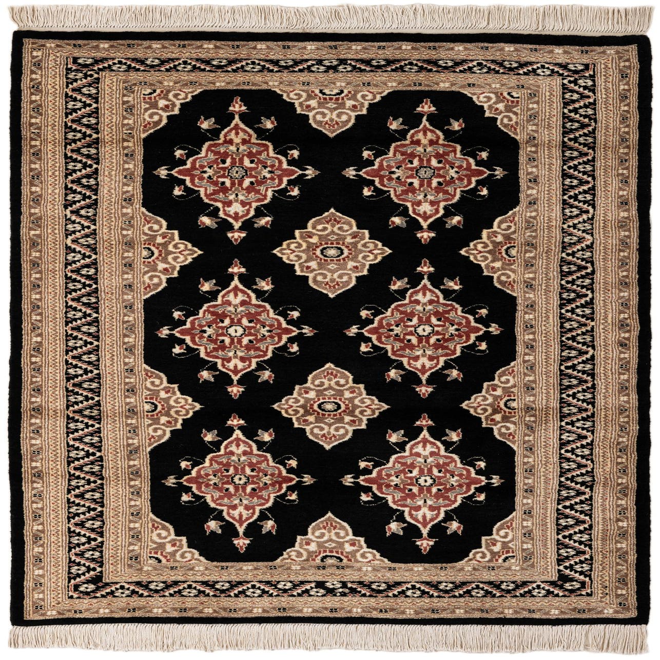 A 4x6 rectangular black Bokhara rug with intricate red, beige, and brown tribal and oriental patterns, featuring a detailed border and short fringes.