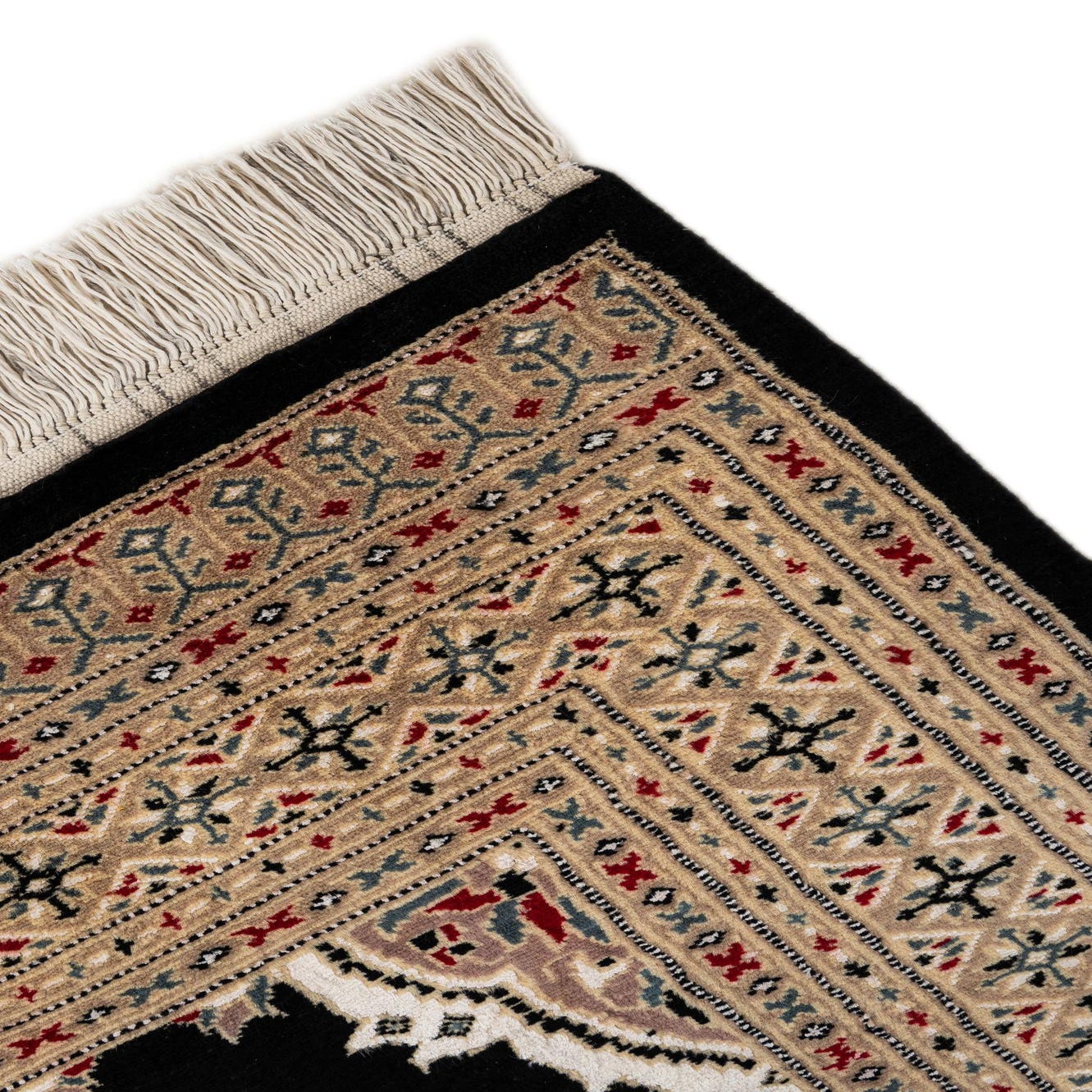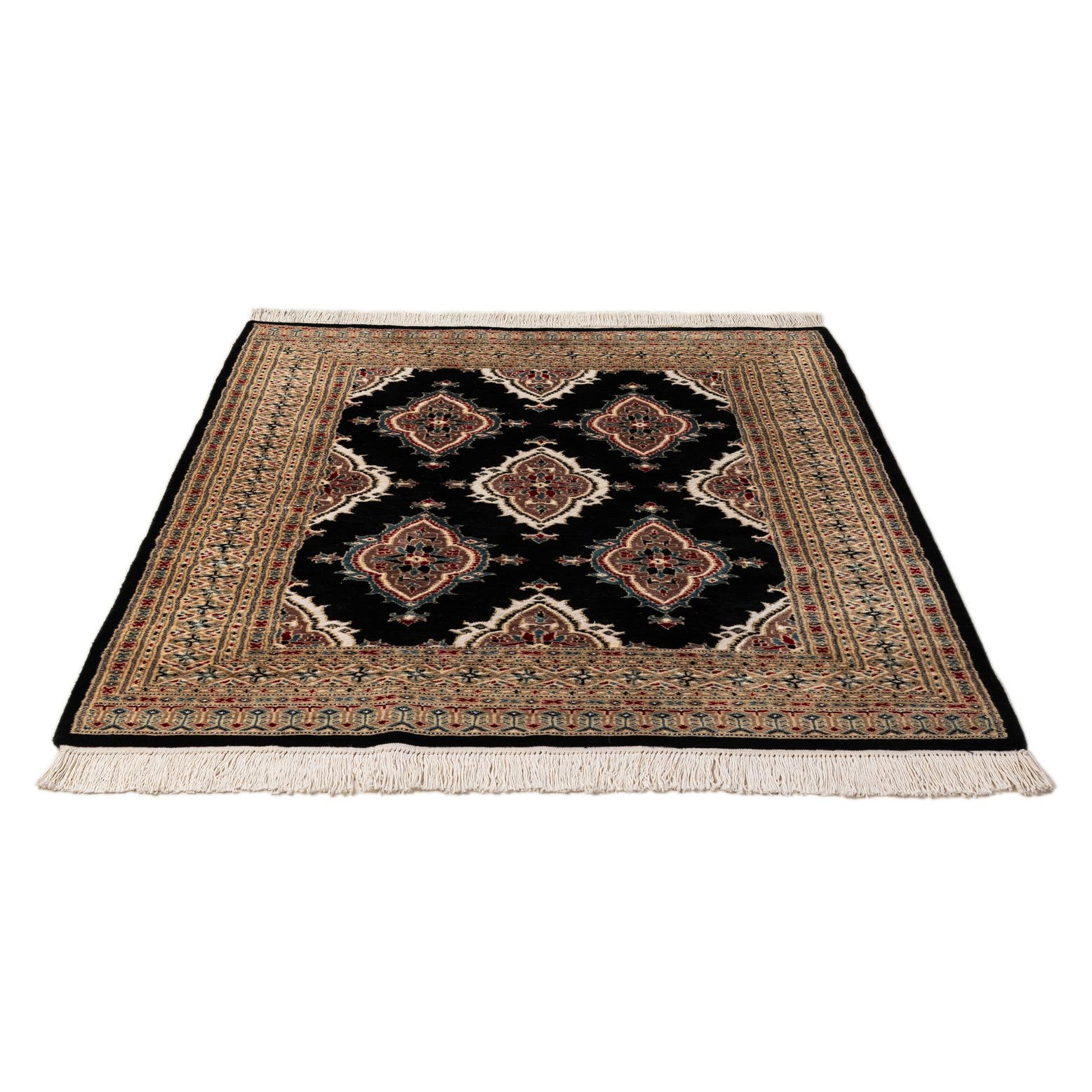 A 4x6 rectangular black Bokhara rug with a traditional tribal medallion pattern in red, blue, and cream, featuring white fringe.