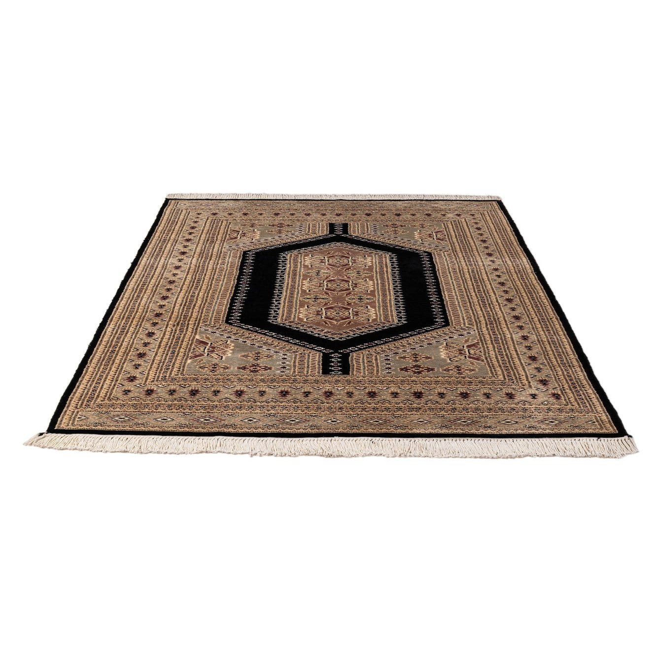 A 4x6 rectangular Bokhara rug featuring a central black medallion with intricate tribal patterns in beige, brown, and muted green, with white fringe.