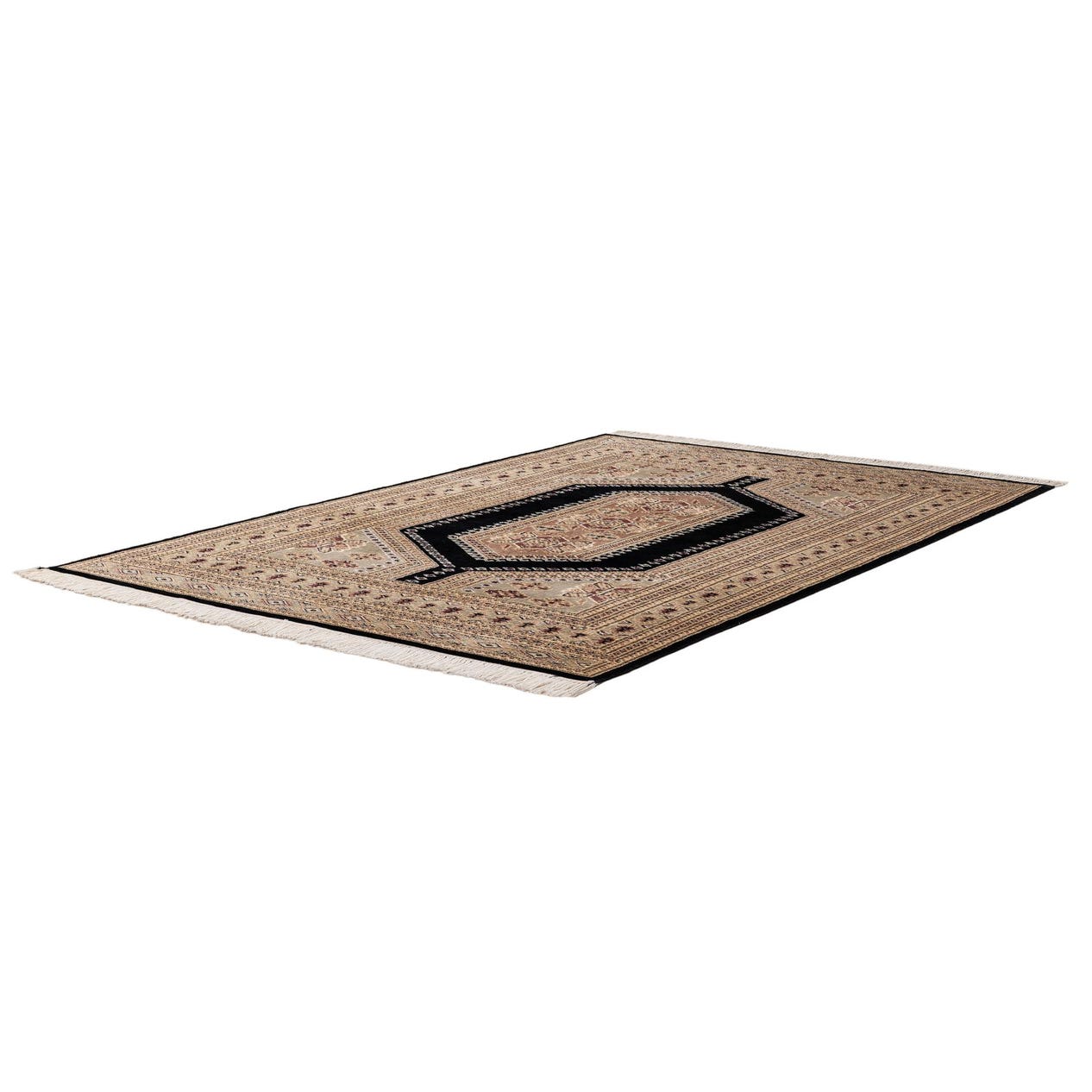 A deep black field anchors a structured, geometric medallion layout in warm brown, light brown and cream tones with soft gray accents. The design pairs a stepped hexagonal central panel with tightly worked borders and small, repeat motifs, creating a measured, rhythmic composition that reads both classic and refined. Hand-knotted from wool with silk highlights, the rug has a dense, low pile: the wool offers a warm, tactile surface while the silk threads catch light to crisply define the pattern. Natural fringe finishes the ends for a traditional look.