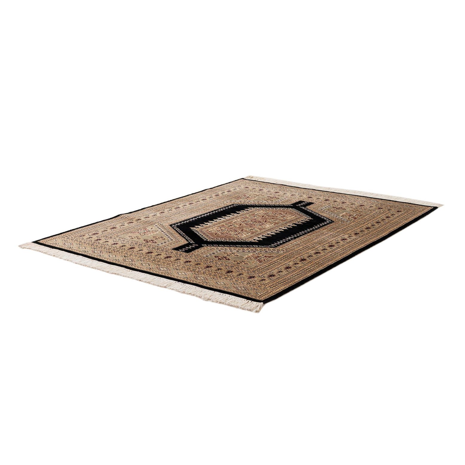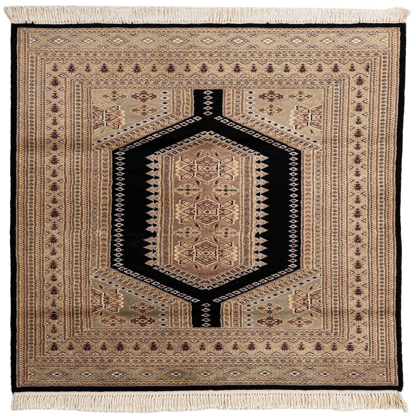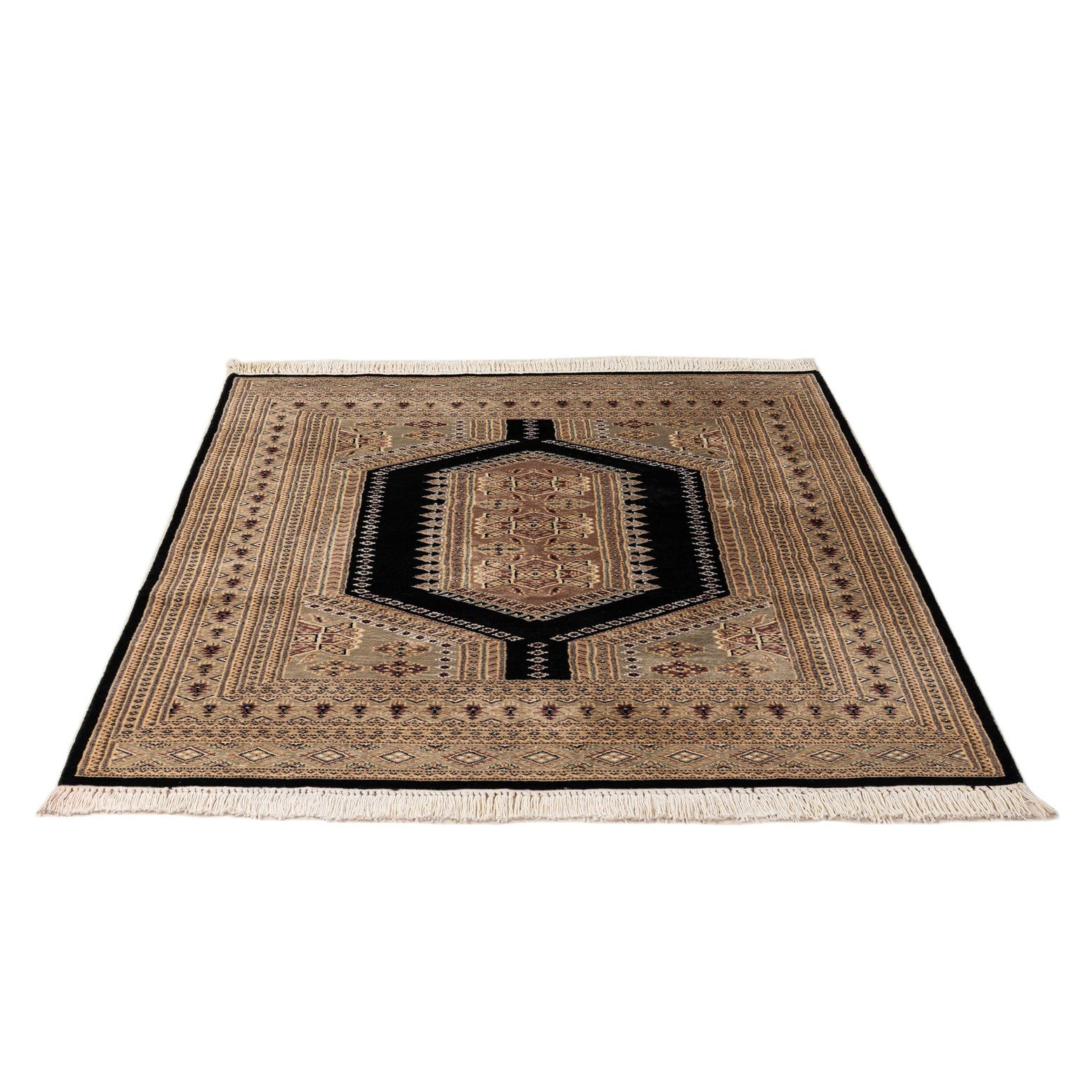 A 4x6 rectangular Bokhara rug featuring a black central medallion on a beige and brown tribal pattern with fringe.