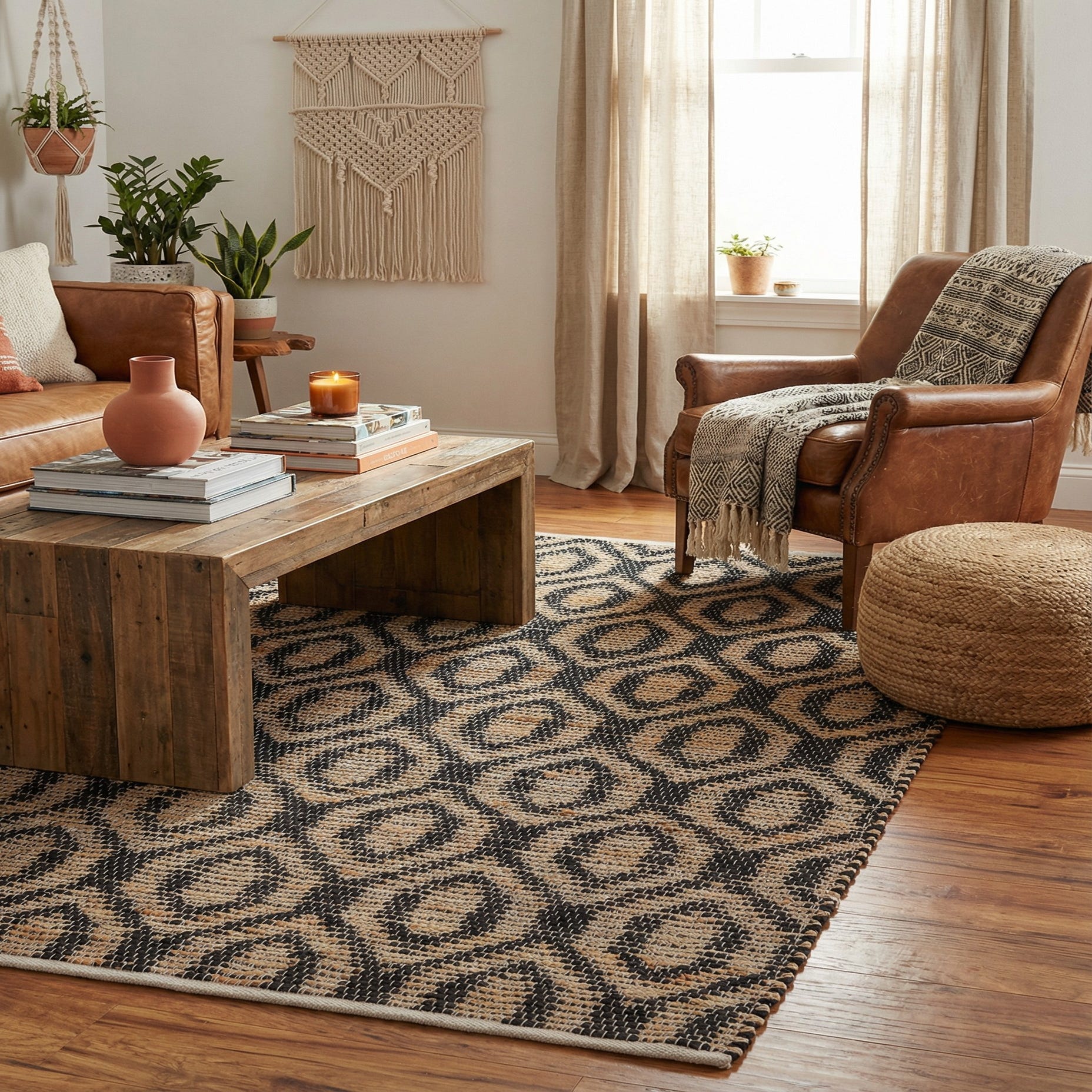 A bold geometric medallion pattern of natural jute threads sits against a deep black ground, creating a strong, rhythmic repeat that reads modern with a handcrafted character. The octagonal and oval motifs are clearly defined by the natural fiber color, giving the rug a graphic, global-inspired look that pairs well with both clean-lined and layered interiors.