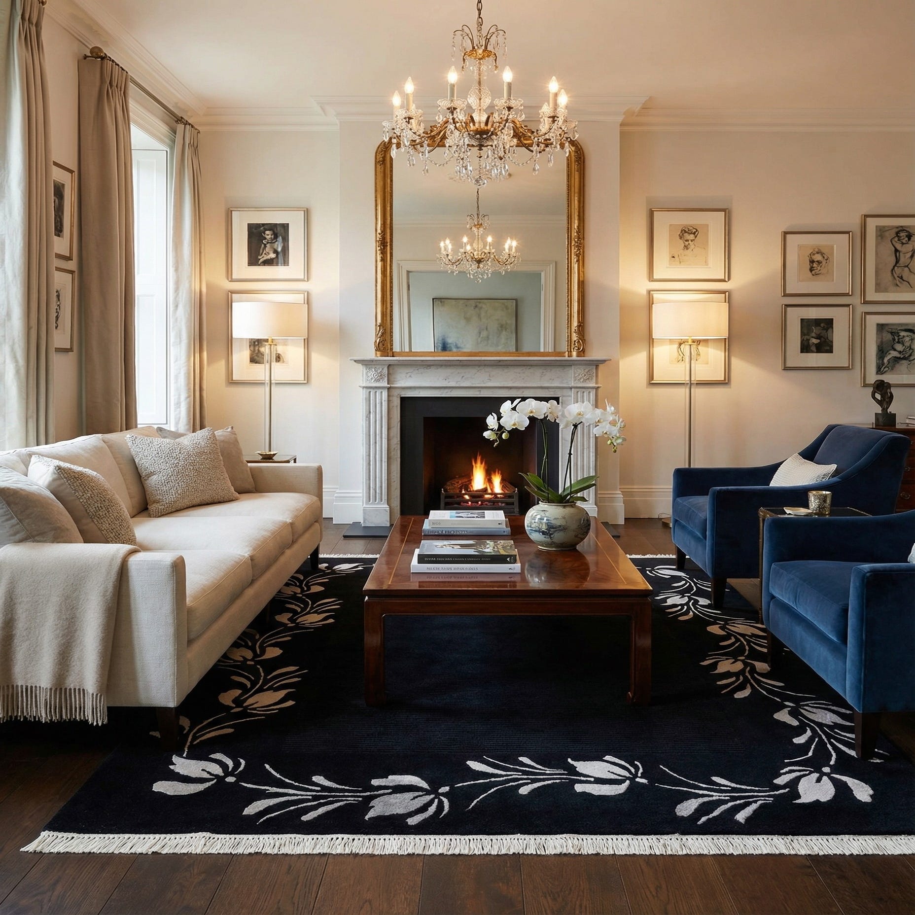 This rug would serve as a striking focal point in minimalist decors, where its floral outlines can provide an element of organic grace. It will also integrate seamlessly into monochromatic schemes or as a grounding element in rooms with metallic accents and fixtures. Ideal for living areas, home offices, or bedrooms, this Darya piece brings a cultivated and serene atmosphere to any space.