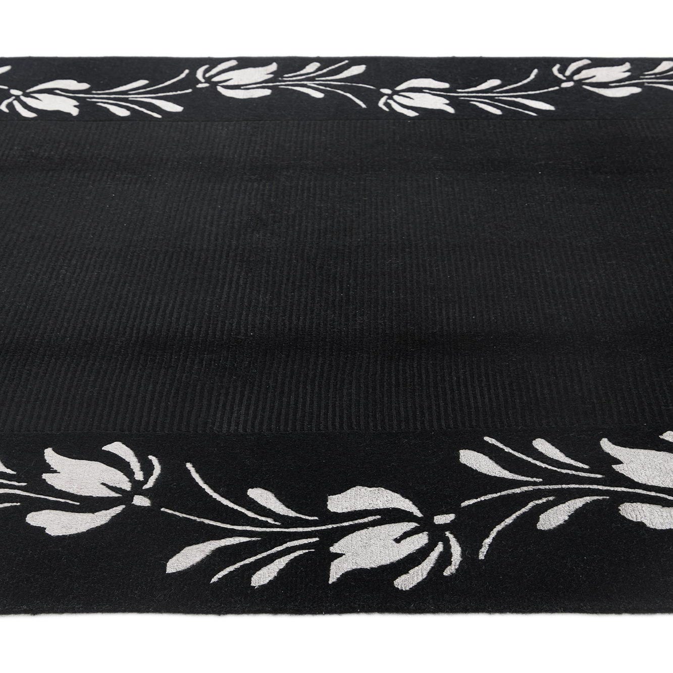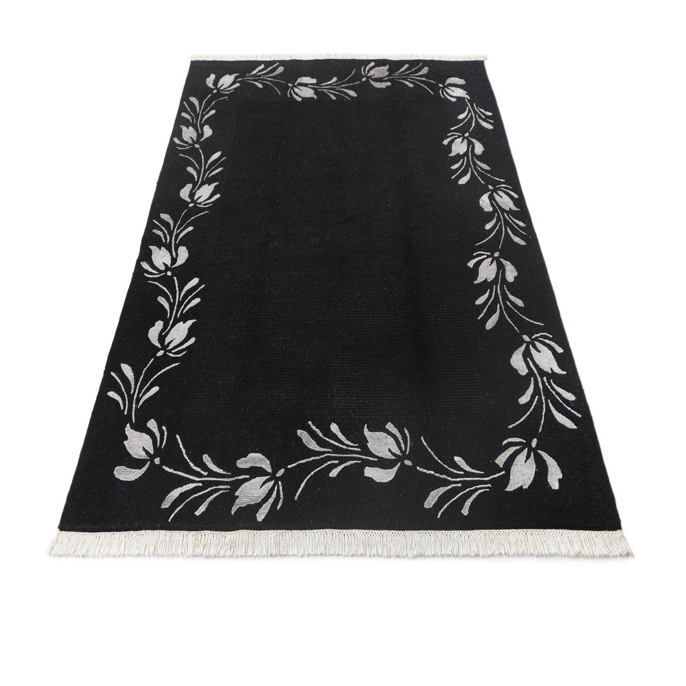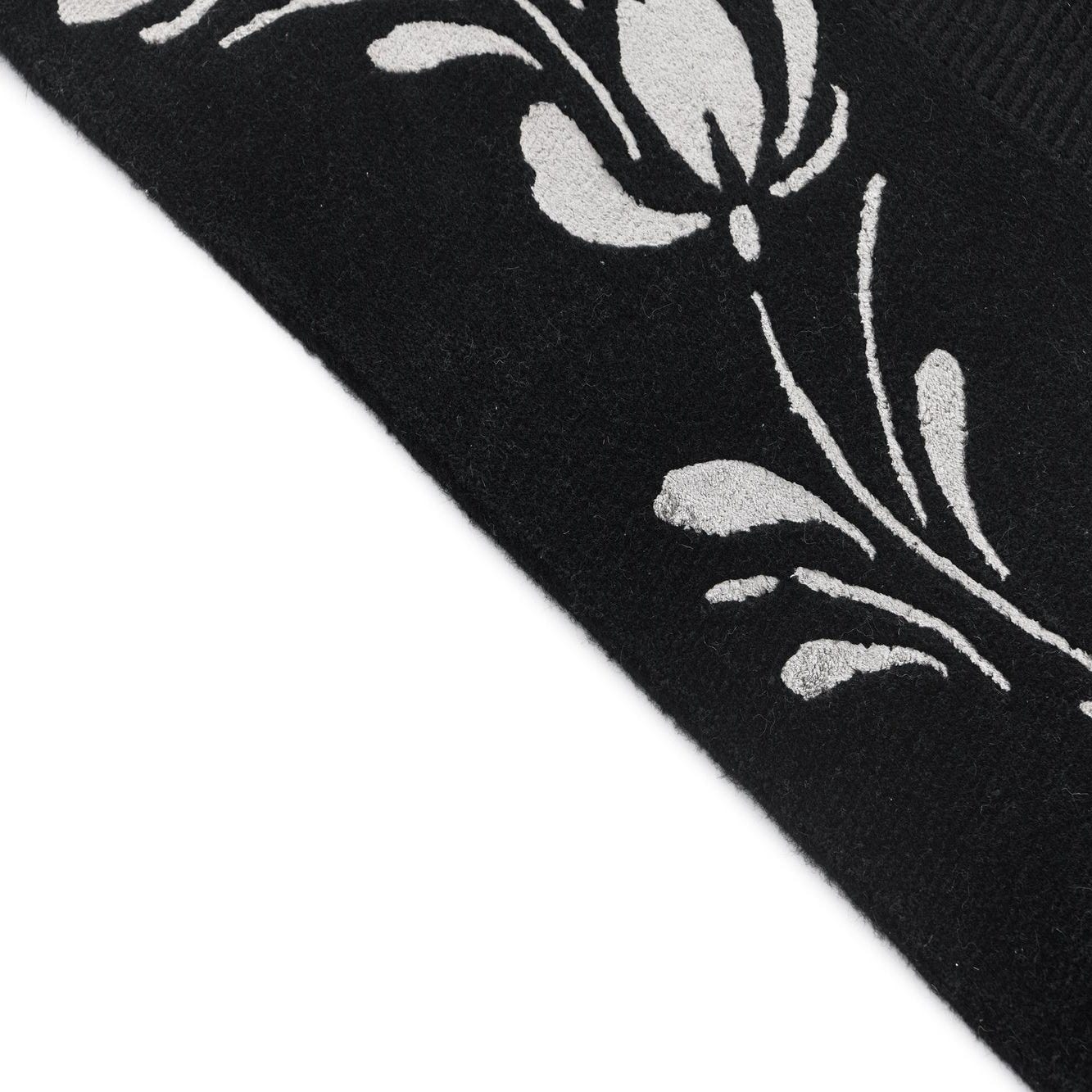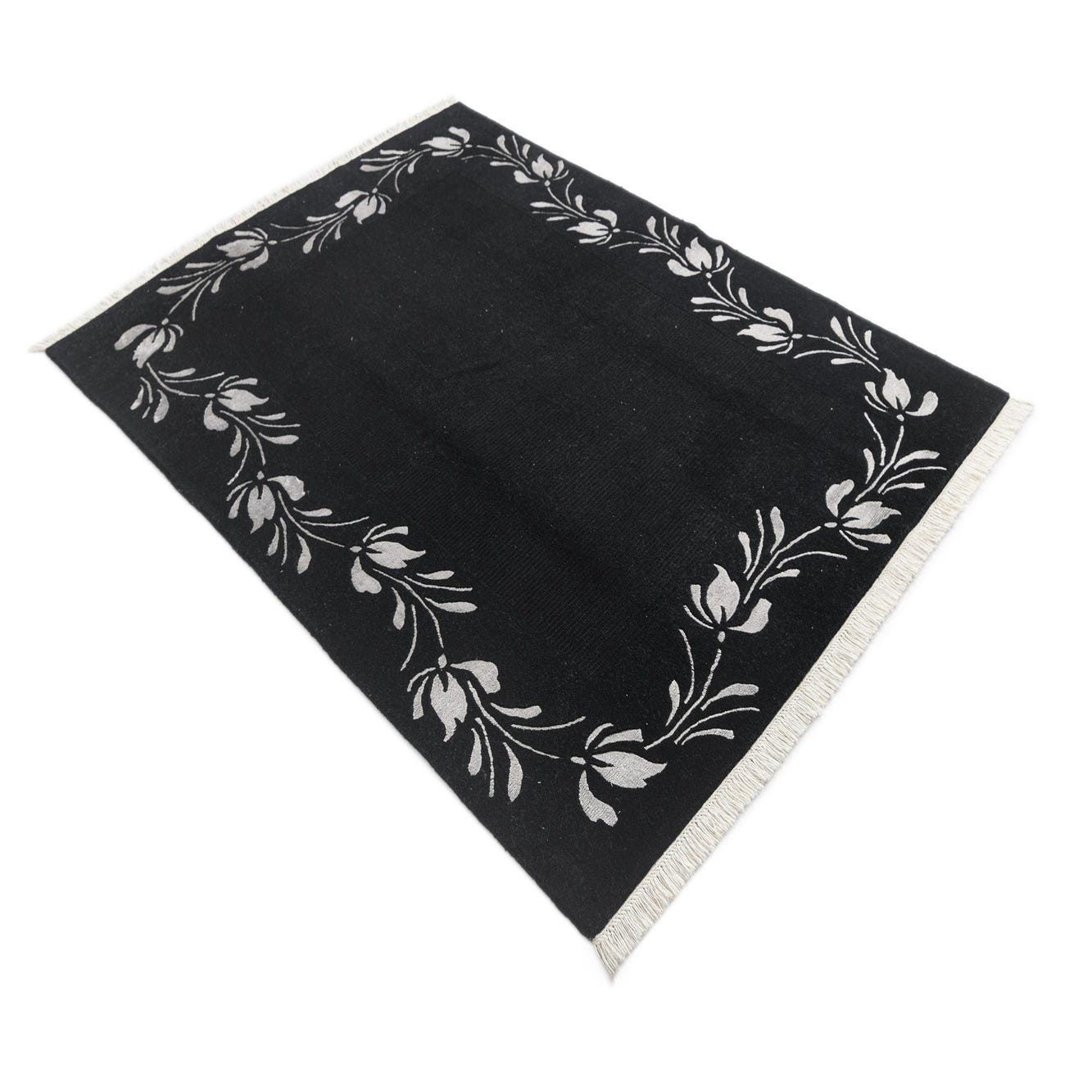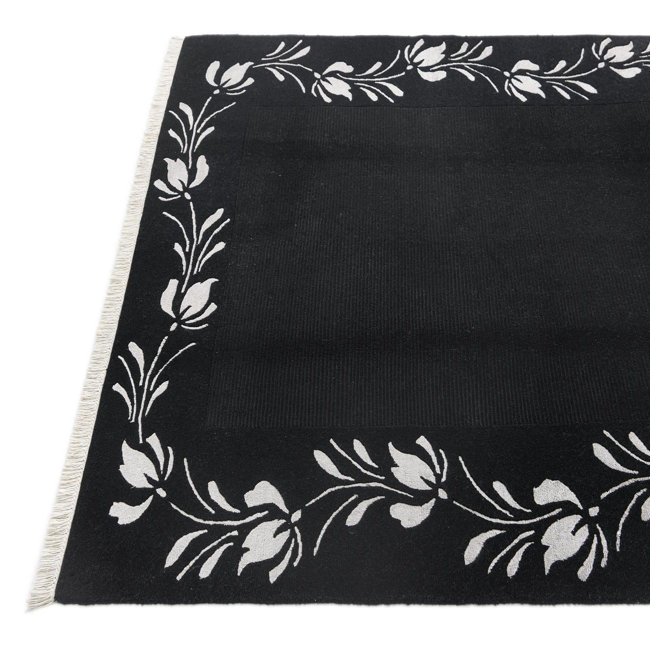The Darya collection presents a hand-made wool and cotton rug measuring 4x6 that offers a sophisticated aesthetic. This particular piece features a bold black background complemented by accents in shades of gray and silver. Its pattern is defined by an elegant floral border that frames the solid central area, offering visual contrast and a touch of botanical charm.