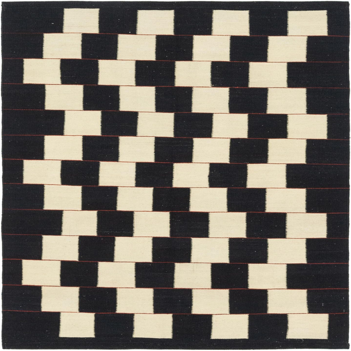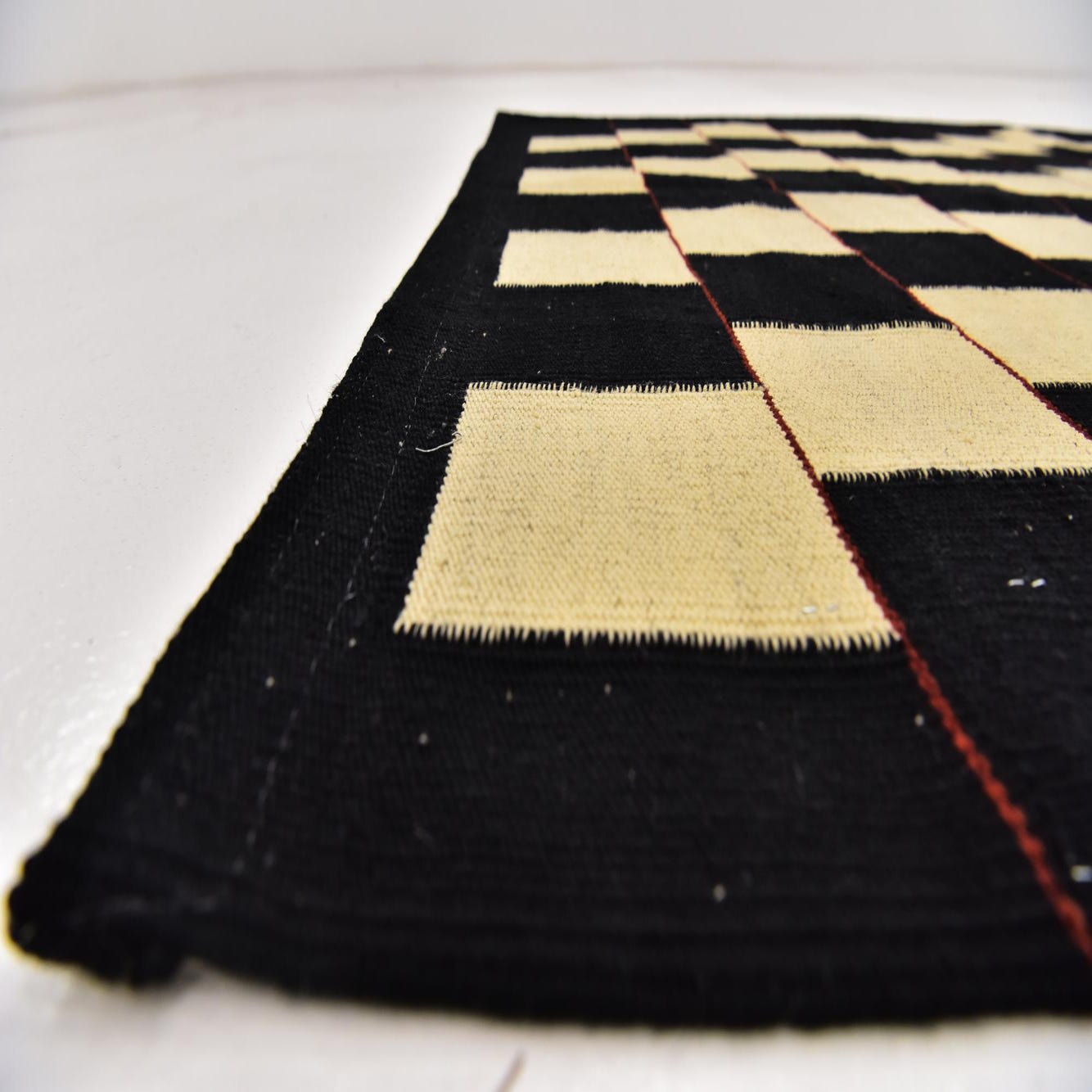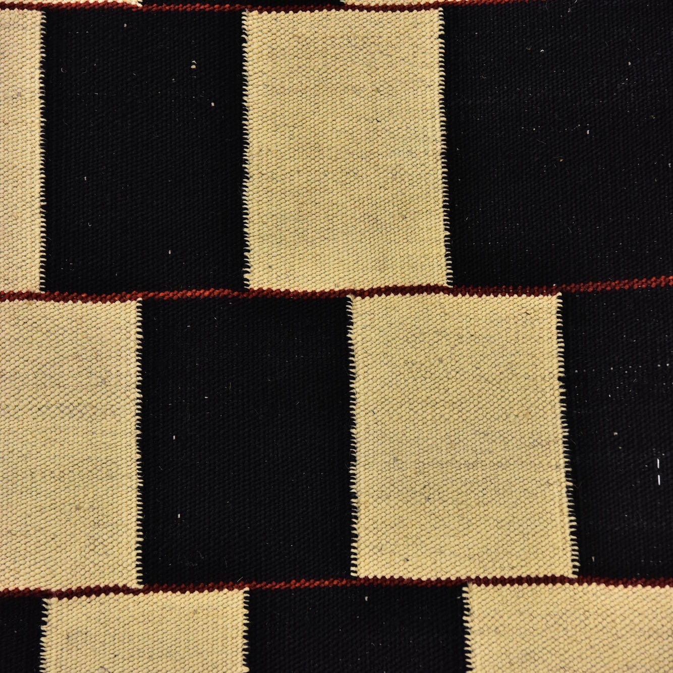 A graphic checkerboard of cream blocks sits against a deep black field, arranged in slightly staggered rows that create a subtle, kinetic rhythm across the surface. Narrow red stitch-like lines run horizontally between the rows, offering a warm, tailored contrast to the monochrome palette. The flat-woven construction has a low profile and a firm, tactile hand: the wool fibers are tightly packed so the surface feels structured with a faint, natural wool texture underfoot. Hand woven from 100% wool.