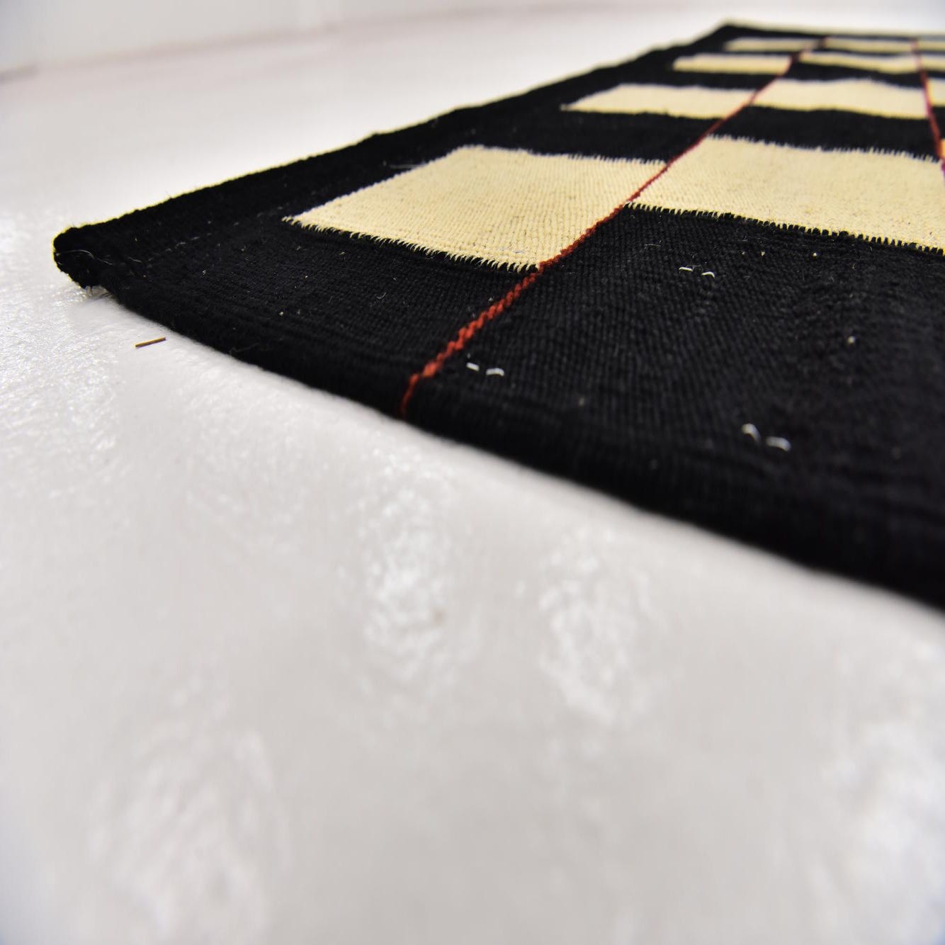 A 4x6 rectangular black and off-white tribal flatweave rug with a repeating checkerboard pattern and thin red lines.