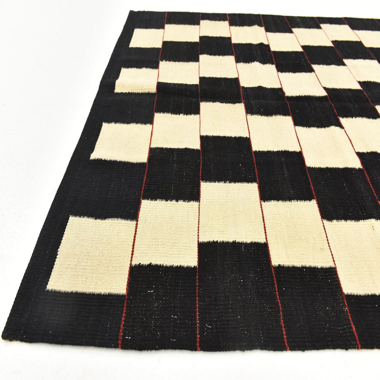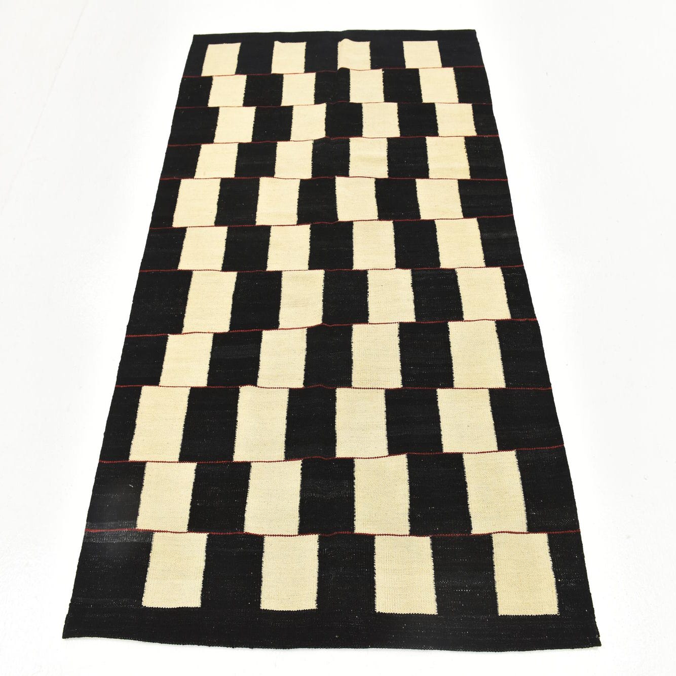 A 4x6 rectangular black and cream flatweave rug with a bold, staggered checkerboard pattern, suitable for a modern living room.